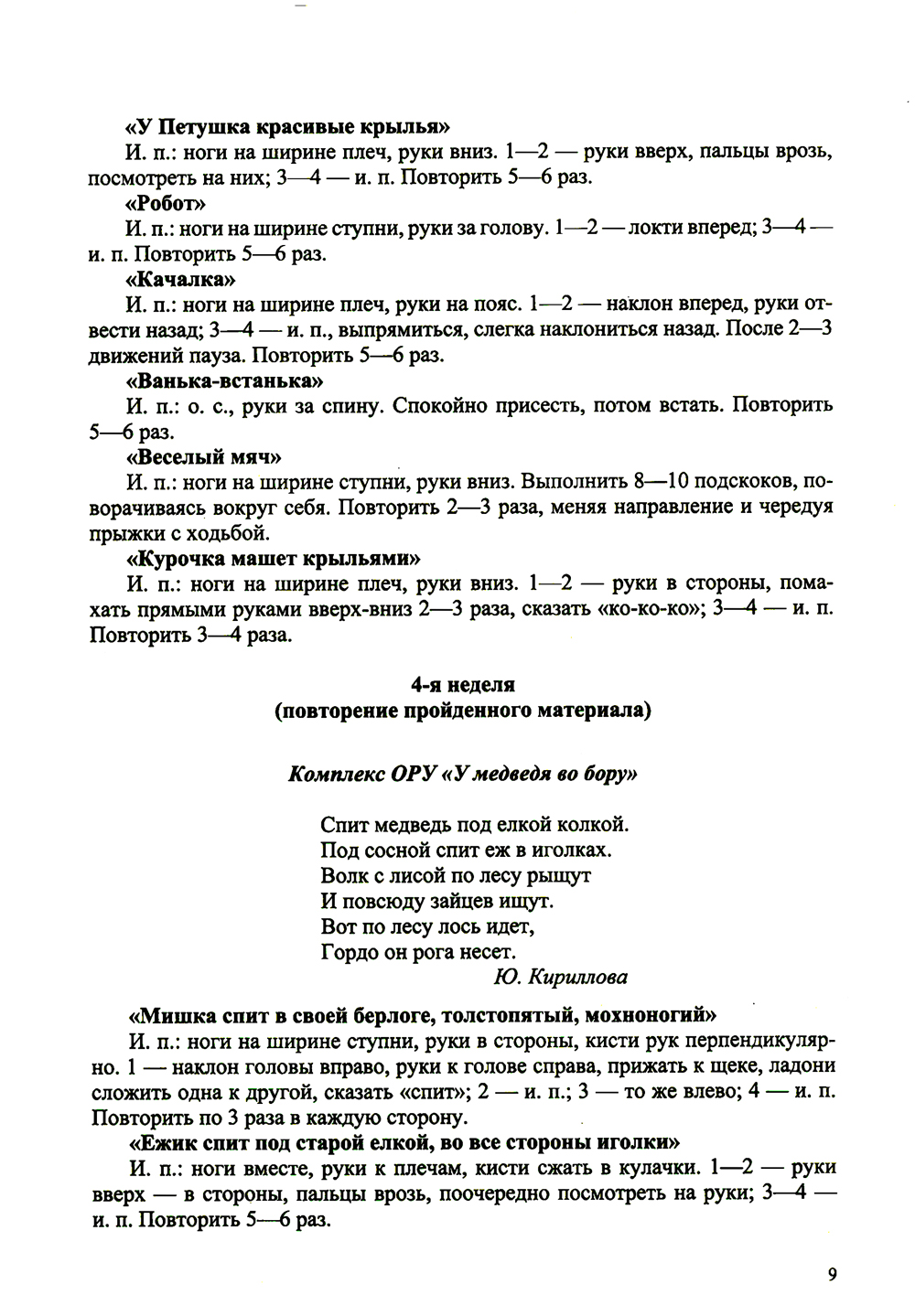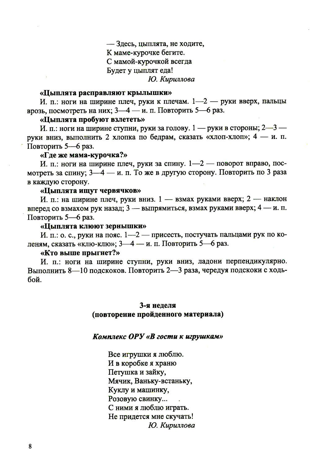 В методическом пособии представлены комплексы общеразвивающих упражнений (ОРУ) для занятий по физической культуре в спортивном зале и на прогулке для детей с тяжелыми нарушениями речи (общим недоразвитием речи) в старшей (с 5 до 6 лет) и подготовительной к школе (с 6 до 7 лет) группах компенсирующей направленности без предметов и с предметами. Подбор упражнений каждого комплекса общеразвивающих упражнений осуществлялся в соответствии с комплексно-тематическим планированием коррекционной и образовательной деятельности (Нищева Н. В., Гавришева Л. Б., Кириллова Ю. А. Комплексно-тематическое планирование коррекционной и образовательной деятельности в группе компенсирующей направленности ДОО для детей с тяжелыми нарушениями речи (с 3 до 4 лет и с 5 до 6 лет). - СПб.: «ИЗДАТЕЛЬСТВО «ДЕТСТВО-ПРЕСС», 2016) на основе парциальной программы физического развития в группе компенсирующей направленности для детей с тяжелыми нарушениями речи (общим недоразвитием речи) с 3 до 7 лет, автор Ю. А. Кириллова («ИЗДАТЕЛЬСТВО «ДЕТСТВО-ПРЕСС», 2017). Комплексы ОРУ рассчитаны на каждую неделю учебного года и соответствуют изучаемой в группе лексической теме, проводятся на физкультурных занятиях в спортивном зале и на прогулке. Дозировка упражнений может варьироваться педагогом в зависимости от физического состояния детей. Упражнения комплексов можно включать в утреннюю гимнастику. Пособие адресовано инструкторам по физической культуре, руководителям физического воспитания и другим специалистам ДОО для работы с детьми как групп компенсирующей направленности, так и массовых групп; студентам педагогических колледжей и вузов, а также родителям.