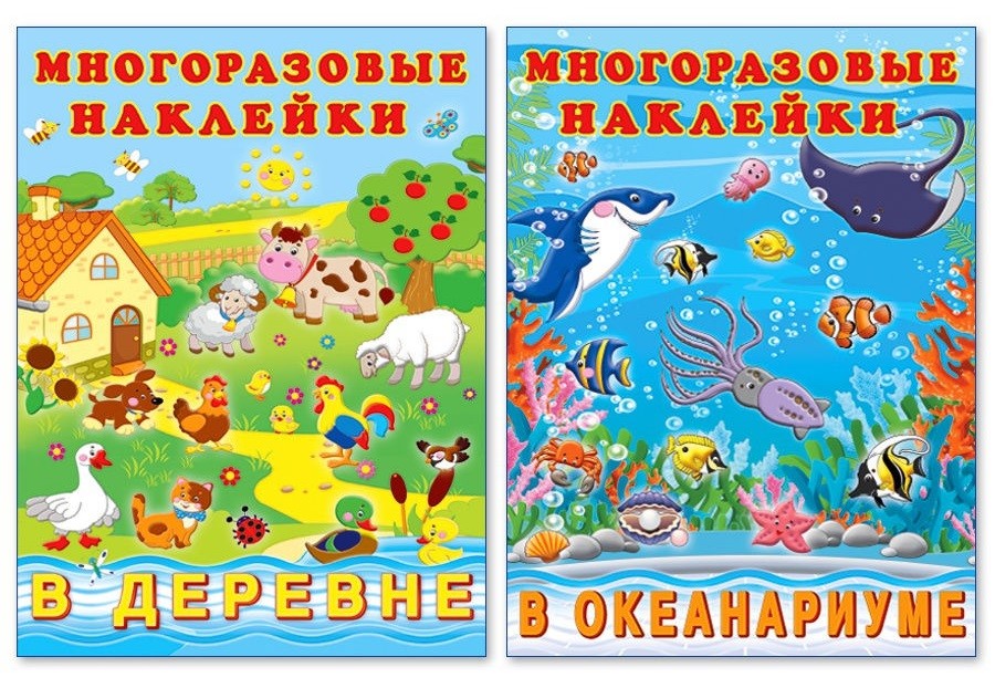 Комплект из двух развивающих пособий с многоразовыми наклейками. Каждое пособие состоит из яркого фонового поля на плотном картоне и набора многоразовых наклеек, необходимого для выполнения заданий на внимание, логику, мышление, развитие речи. Многоразовые наклейки: В океанариуме и В деревне. Они позволят вашему ребенку в игровой форме изучить обитателей подводного мира и животных, которых можно встретить в деревне, и дадут возможность создать свой удивительный мир, который можно легко изменить. Книга представляет собой разворот из плотной ламинированной бумаги и вкладыш с красочными многоразовыми наклейками, которые можно много раз отклеивать и переклеивать, не оставляя следов и не боясь испортить книгу.