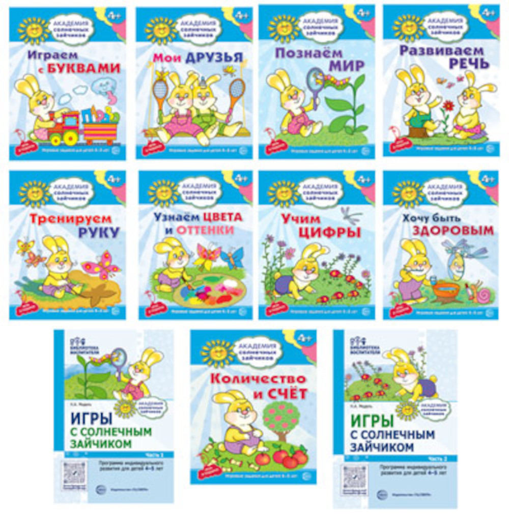 Комплект состоит из: Игры с солнечным зайчиком. Программа индивидуального развития для детей 4-5 лет. Часть 1 Игры с солнечным зайчиком. Программа индивидуального развития для детей 4-5 лет. Часть 2 Академия солнечных зайчиков. 4-5 лет. ИГРАЕМ С БУКВАМИ (Развивающие задания и игра). ФГОС ДО Академия солнечных зайчиков. 4-5 лет. КОЛИЧЕСТВО И СЧЕТ (Развивающие задания и игра). ФГОС ДО Академия солнечных зайчиков. 4-5 лет. МОИ ДРУЗЬЯ (Развивающие задания и игра). ФГОС ДО Академия солнечных зайчиков. 4-5 лет. ПОЗНАЕМ МИР (Развивающие задания и игра). ФГОС ДО Академия солнечных зайчиков. 4-5 лет. РАЗВИВАЕМ РЕЧЬ (Развивающие задания и игра). ФГОС ДО Академия солнечных зайчиков. 4-5 лет. ТРЕНИРУЕМ РУКУ (Развивающие задания и игра). ФГОС ДО Академия солнечных зайчиков. 4-5 лет. УЗНАЕМ ЦВЕТА И ОТТЕНКИ (Развивающие задания и игра). ФГОС ДО Академия солнечных зайчиков. 4-5 лет. УЧИМ ЦИФРЫ (Развивающие задания и игра). ФГОС ДО Академия солнечных зайчиков. 4-5 лет. ХОЧУ БЫТЬ ЗДОРОВЫМ (Развивающие задания и игра). ФГОС ДО| Издательство | Творческий центр Сфера |