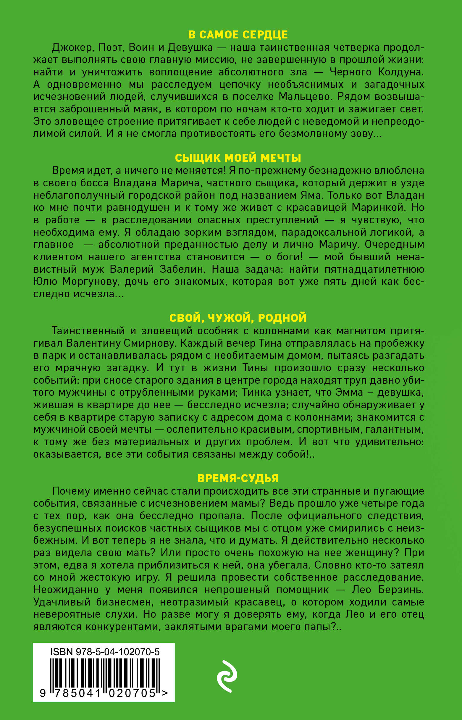 В комплект входят книги «Время-судья», «Свой, чужой, родной», «Сыщик моей мечты» и «В самое сердце». Татьяна Полякова - один из самых популярных российских писателей в жанре детектива. За время писательской карьеры из-под ее пера вышло более 85 книг общим тиражом более 36 миллионов экземпляров. По свидетельствам читателей, романы Татьяны Поляковой - это «захватывающий сюжет и непредсказуемая развязка, обаятельные герои и невероятные приключения, легкий стиль и яркие диалоги».| Издательство | ООО "Издательство "Эксмо" |