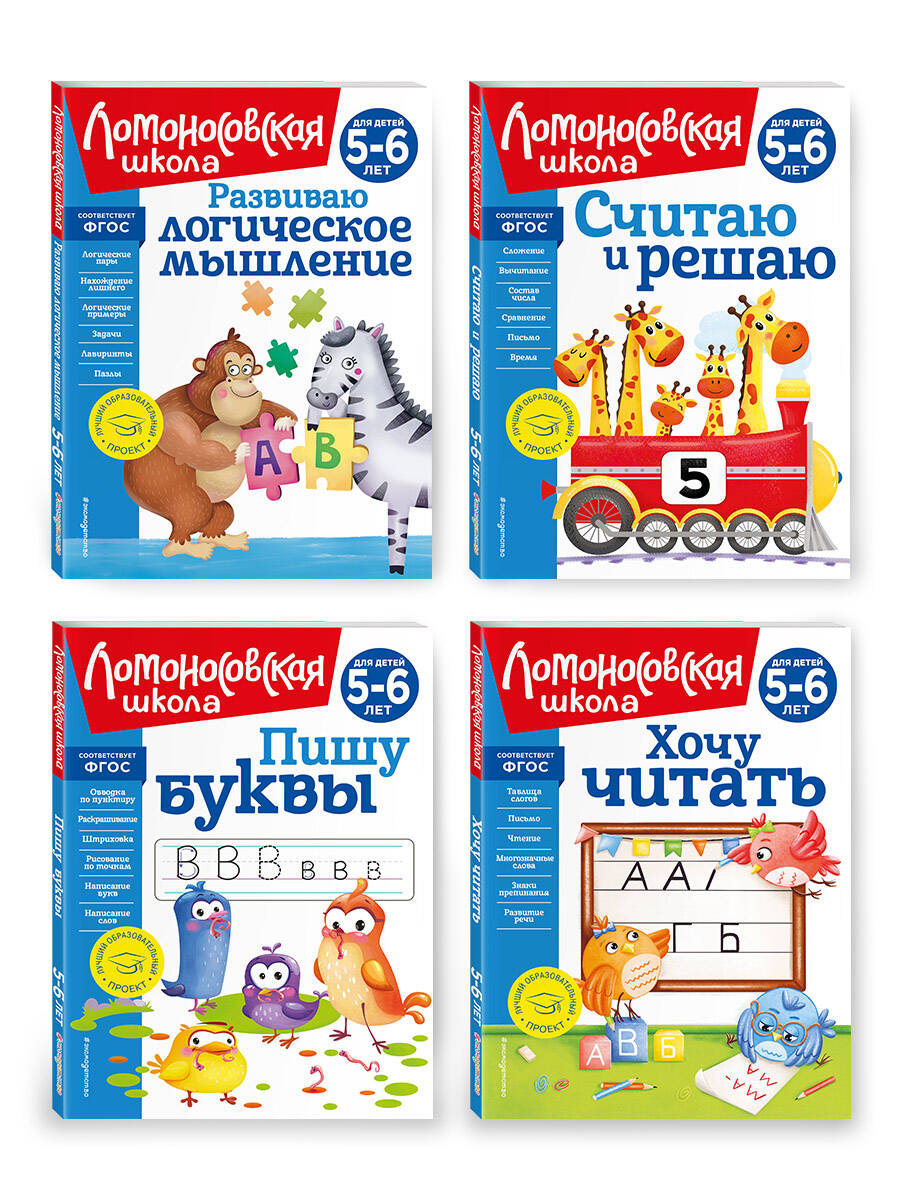 Аннотация: Комплект для детей 5-6 лет: Считаю и решаю + Пишу буквы + Хочу читать + Развиваю логическое мышление. Ломоносовская школа (ОРС)