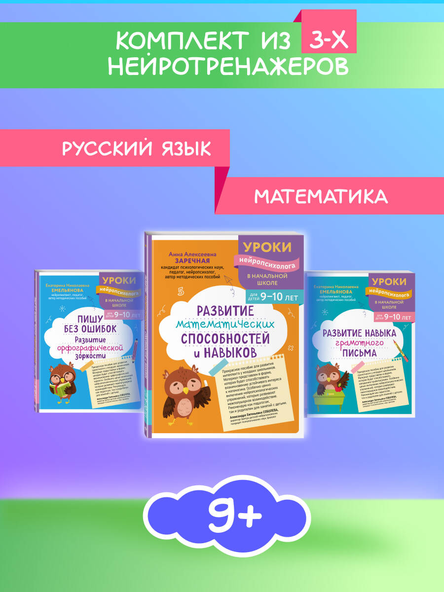 В комплект из трех развивающих тетрадей для детей 9-10 лет входят книги по развитию навыка грамотного письма, орфографической зоркости и математических способностей и навыков. Пособия подготовлены практикующими нейропсихологами, которые каждый день помогают учащимся начальной школы справиться с проблемами, возникающими в обучении. Цель набора книг - повысить общую грамотность учеников 3-4 классов, развить у них умение видеть ошибки и исправлять их правильно, а также сформировать и закрепить навыки счёта, приёмы сложения и вычитания, умножения и деления, решения логических задач, развить абстрактное мышление и пространственные представления. Каждое пособие имеет свою уникальную игровую структуру. При работе с ними ребенку предстоит учить орфографические правила, которые сформулированы в стиле рэп, путешествовать по континентам и странам, решать головоломки, ребусы, кроссворды и многое другое. На многие упражнения даны ответы, чтобы проверить и оценить уровень знаний школьника. Желательно выполнять задания в том порядке, который дают авторы. Имеющиеся в книгах задания «настроят» соответствующие зоны мозга на работу, активизируют зрительное внимание, память, межполушарное взаимодействие. Учащимся предлагаются двигательные и дыхательные упражнения, способные снять напряжение и зарядить энергией. Использование нейротренажёров в качестве дополнительного материала позволит ребёнку своевременно устранить всевозможные сложности в усвоении школьного материала и формировании необходимых навыков. Комплект из нескольких книг станет полезным подарком на любой праздник - день рождения, Новый год или просто без повода.| Издательство | ООО "Издательство "Эксмо" |