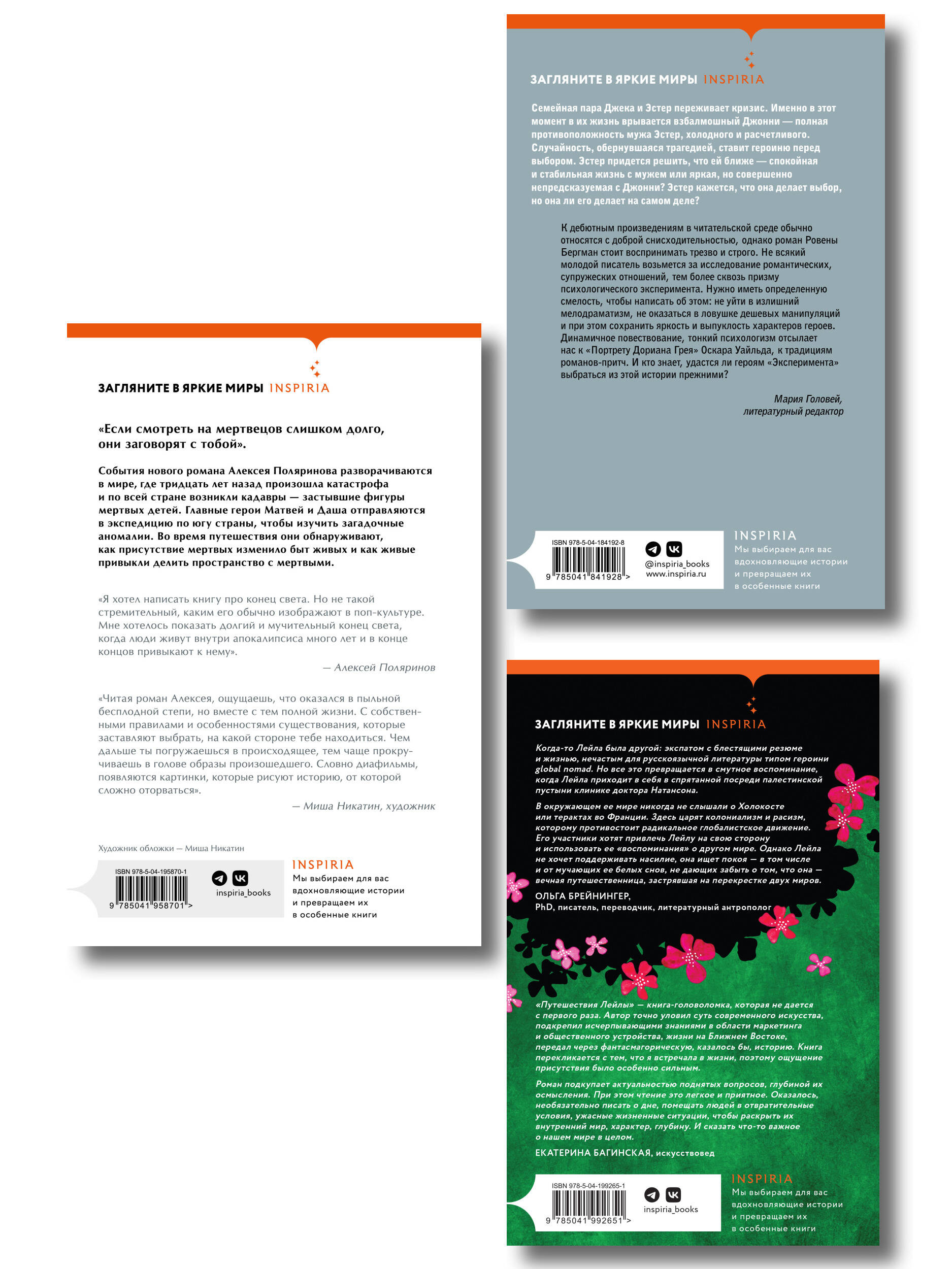 "Кадавры": События нового романа Алексея Поляринова разворачиваются в мире, где тридцать лет назад произошла катастрофа и по всей стране возникли кадавры - застывшие фигуры мертвых детей. Главные герои Матвей и Даша отправляются в экспедицию по югу страны, чтобы изучить загадочные аномалии. Во время путешествия они обнаруживают, как присутствие мертвых изменило быт живых и как живые привыкли делить пространство с мертвыми. "Эксперимент": Семейная пара Джека и Эстер переживает кризис. Именно в этот момент в их жизнь врывается взбалмошный Джонни - полная противоположность мужа Эстер, холодного и расчетливого. Случайность, обернувшаяся трагедией, ставит героиню перед выбором. Эстер придется решить, что ей ближе - спокойная и стабильная жизнь с мужем или яркая, но совершенно непредсказуемая с Джонни? Эстер кажется, что она делает выбор, но она ли его делает на самом деле? "Путешествия Лейлы": Лейла приходит в себя в мире, кардинально отличающемся от известного ей. Вскоре новая реальность начинает проясняться, но готова ли героиня мириться с ней и с отведенной ей ролью? Лейле придется принять непростые решения, чтобы остаться верной себе и своим принципам, актуальным в обоих мирах.| Издательство | ООО "Издательство "Эксмо" |