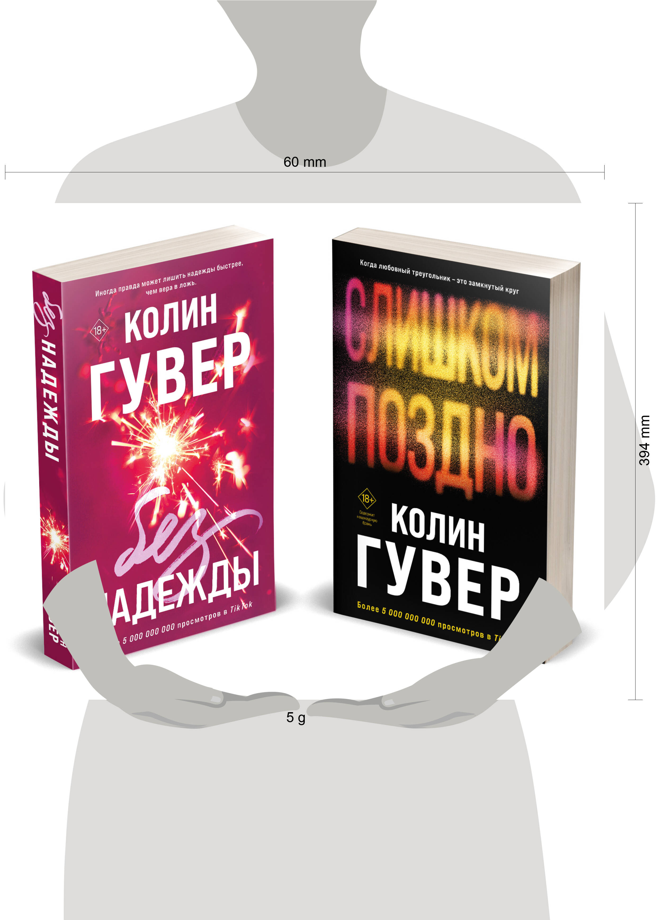 КОЛИН ГУВЕР - автор, которому читатели доверяют свое сердце, литературный феномен нашего времени, троекратная обладательница премии Goodreads Choice Award в номинации «любовный роман». Ее произведения переведены на десятки языков. Она - мировой тренд. Продажи книг Колин Гувер превысили продажи Стивена Кинга и Джорджа Мартина. Более 5 000 000 000 просмотров в TikTok. В комплект входят романы «Без надежды» и «Слишком поздно». Это романы о том, как важно, находясь в полной темноте, не терять надежды увидеть свет. «БЕЗ НАДЕЖДЫ» Это захватывающая история о двух молодых людях с разрушительным прошлым. Они отправляются в страстное и интригующее путешествие, которое навсегда изменит их жизни. Трогательный и одновременно бьющий наотмашь роман. Такой же, как первая любовь. Звезды - главный символ этой книги. Скай, чье имя переводится с английского как «небо», любила считать звезды на потолке своей комнаты. Это было тяжелое время, но потом Скай встретила Дина. Так звезды появились у нее внутри. В один день жизнь Скай переворачивается с ног на голову - она встречает Дина Холдера. Он пугает и завораживает девушку. И хочет знать о ней все. Дину удается дотянуться до струн ее души, которых никто другой даже не смел коснуться, - и Скай теряет броню. Так на поверхность всплывает то, что девушка прятала глубоко внутри; воспоминание о болезненном прошлом, которое снова начинает ее беспокоить. Только столкнувшись с правдой лицом к лицу, не отказываясь от любви и доверия, Скай и Холдер смогут спасти друг друга. «СЛИШКОМ ПОЗДНО» Свет - главный символ этой книги. Когда кажется, что все вокруг погрузилось во мрак, помни про внутренний свет, чтобы увидеть свою дорогу. Слоун смогла найти у себя внутри лучик надежды и победила тьму. Ад - не что иное, как отношения студентки Слоун с наркоторговцем Эйсой. Она бы давно ушла от него, но он содержит ее больного брата. Эйса знает о каждом ее шаге, и ей не выбраться из этой ловушки. Все меняется, когда в жизни Слоун появляется Картер, полицейский под прикрытием, который должен раскрыть Эйсу. Девушка чувствует, что ее влечет к Картеру и эти чувства взаимны. Эйса не остановится ни перед чем, чтобы уничтожить любого, кто встанет на его пути. Его одержимость растет с каждым днем, и теперь Слоун и Картер должны найти выход, пока не стало слишком поздно…| Издательство | ООО "Издательство "Эксмо" |