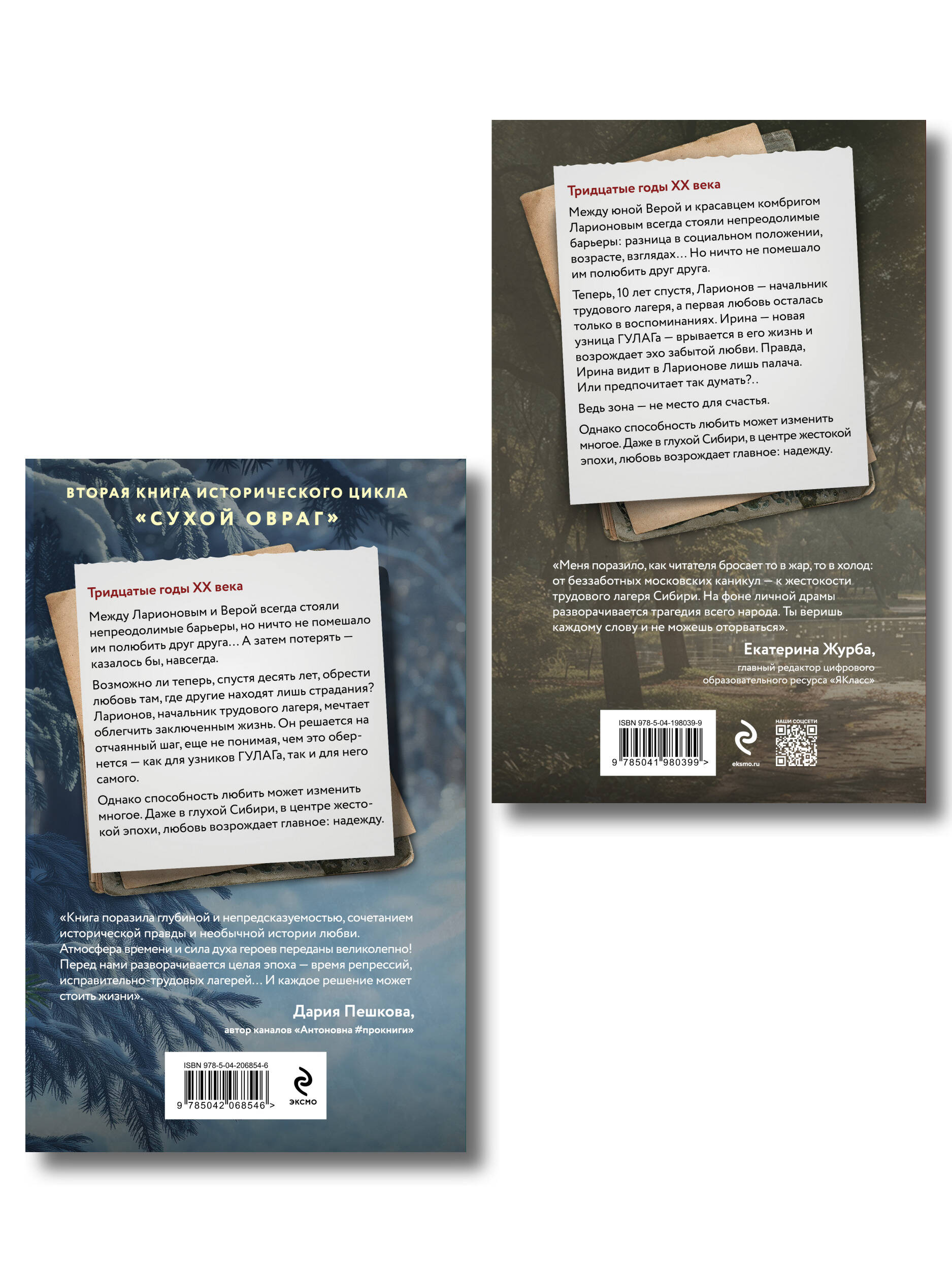 Комплект из 2-х книг Алисы Климы: «Сухой овраг. Вера», «Сухой овраг. Отречение». «Сухой овраг. Вера» Тридцатые годы XX века. Между юной Верой и красавцем комбригом Ларионовым всегда стояли непреодолимые барьеры: разница в социальном положении, возрасте, взглядах… Но ничто не помешало им полюбить друг друга. Теперь, 10 лет спустя, Ларионов - начальник трудового лагеря, а первая любовь осталась только в воспоминаниях. Ирина - новая узница ГУЛАГа - врывается в его жизнь и возрождает эхо забытой любви. Правда, Ирина видит в Ларионове лишь палача. Или предпочитает так думать?.. Ведь зона - не место для счастья. Однако способность любить может изменить многое. В глухой Сибири, в центре жестокой эпохи, рождается история о силе чувств, побеждающих тьму. История, дарующая надежду. «Сухой овраг. Отречение» Тридцатые годы XX века. Между Ларионовым и Верой всегда стояли непреодолимые барьеры, но ничто не помешало им полюбить друг друга… А затем потерять - казалось бы, навсегда. Возможно ли теперь, спустя десять лет, обрести любовь там, где другие находят лишь страдания? Ларионов, начальник трудового лагеря, мечтает облегчить заключенным жизнь. Он решается на отчаянный шаг, еще не понимая, чем это обернется - как для узников ГУЛАГа, так и для него самого. Однако способность любить может изменить многое. Даже в глухой Сибири, в центре жестокой эпохи, любовь возрождает главное: надежду. Вторая книга исторического цикла «Сухой овраг».| Издательство | ООО "Издательство "Эксмо" |