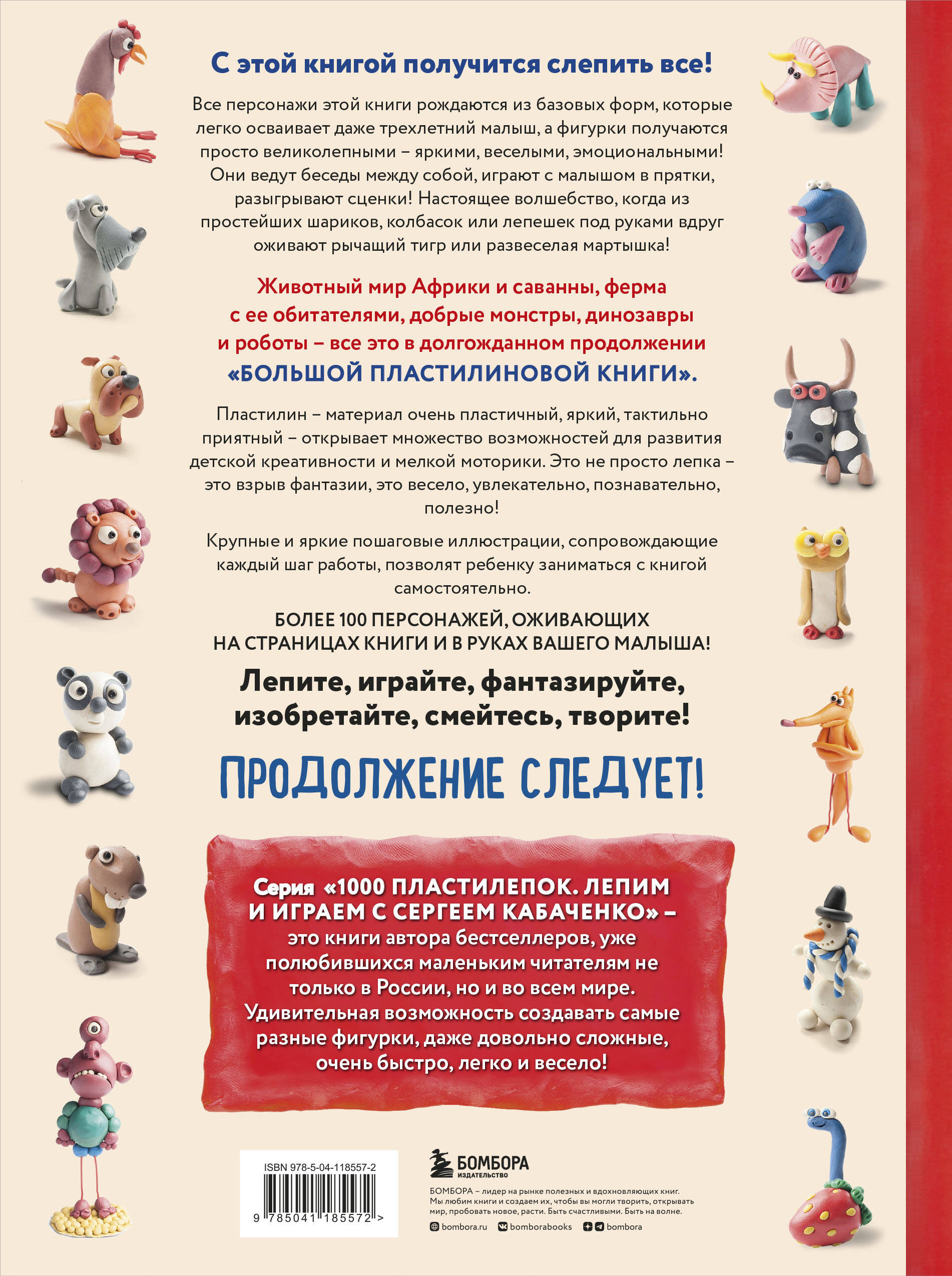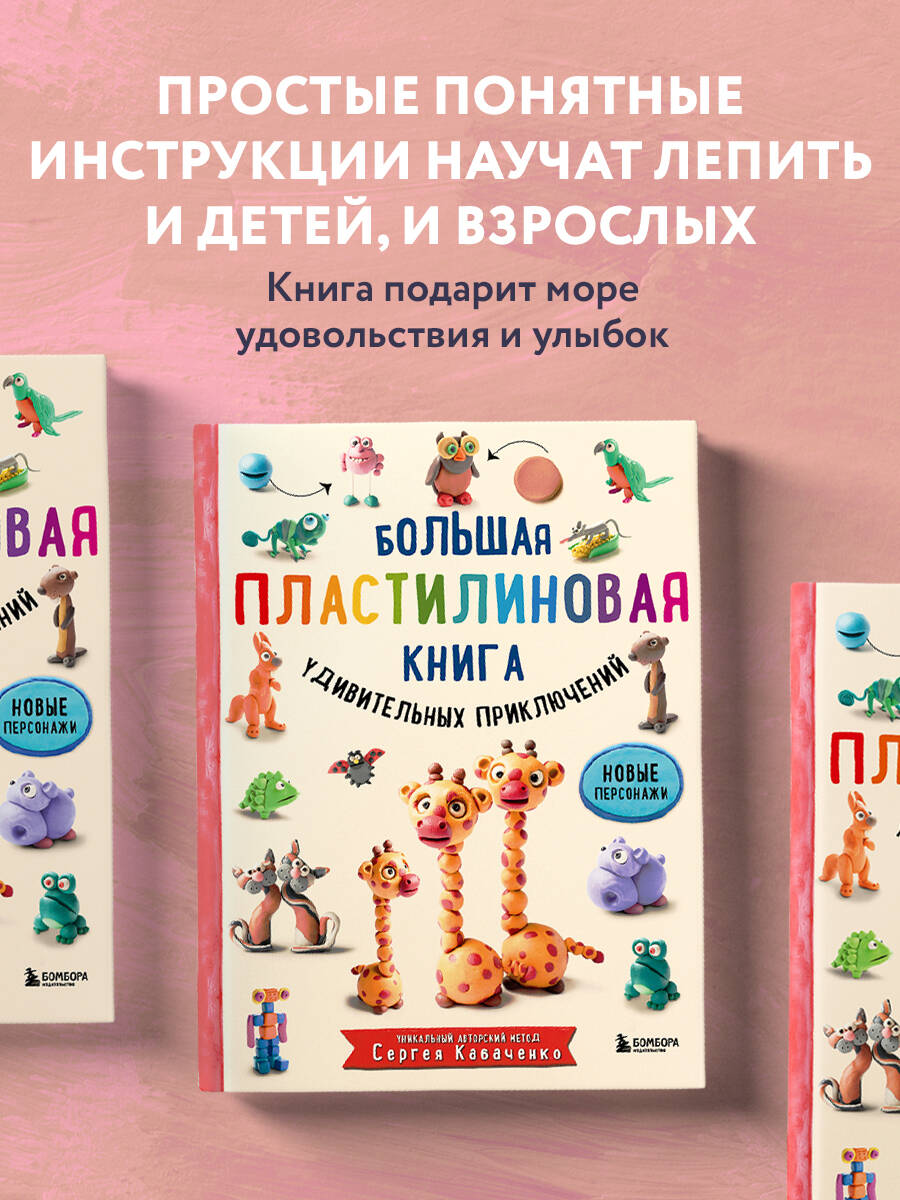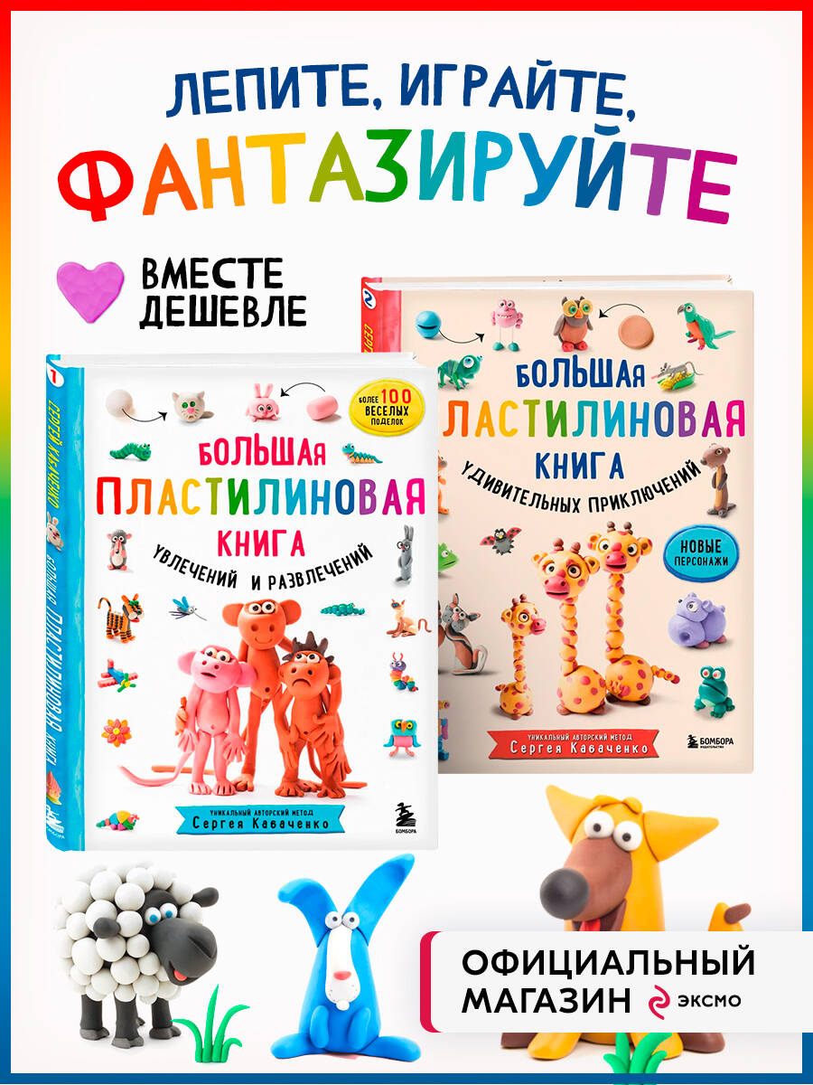 В комплект вышли 2 книги: Большая пластилиновая книга увлечений и развлечений (книга 1) и Большая пластилиновая книга удивительных приключений (книга 2) Уникальный авторский метод Сергея Кабаченко, автора бестселлеров, уже полюбившихся маленьким читателям не только в России, но и во всем мире, - это удивительная возможность создавать самые разные фигурки, даже довольно сложные, очень быстро, легко и весело! Все персонажи этой книги рождаются из базовых форм, которые легко осваивает даже трехлетний малыш, а фигурки получаются просто великолепными - яркими, веселыми, эмоциональными! Они ведут беседы между собой, играют с малышом в прятки, разыгрывают сценки! Крупные и яркие пошаговые иллюстрации, сопровождающие каждый шаг работы, позволят ребенку заниматься с книгой самостоятельно, но и родители, желающие помочь малышу в творчестве, получат море удовольствия от работы с книгой. Более 100 персонажей, оживающих на страницах книги и под руками вашего малыша! Лепите, играйте, фантазируйте, изобретайте, смейтесь, творите! Продолжение следует!
