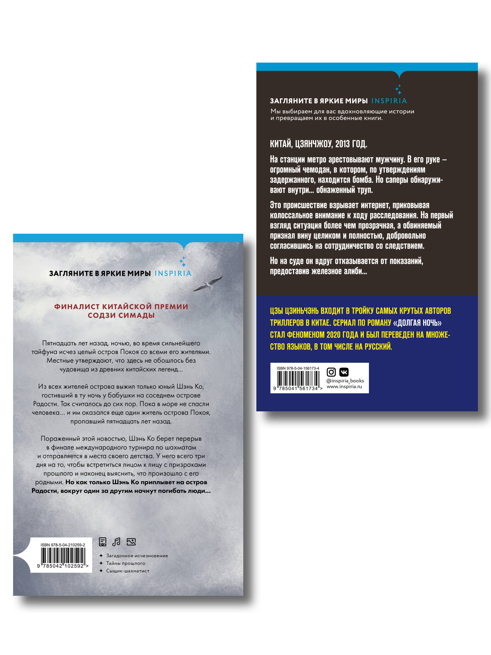 Долгая ночь Китай, Цзянчжоу, 2013 год. На станции метро арестовывают мужчину. В его руке - огромный чемодан, в котором, по утверждениям задержанного, находится бомба. Но саперы обнаруживают внутри… обнаженный труп. Это происшествие взрывает интернет, приковывая колоссальное внимание к ходу расследования. На первый взгляд ситуация более чем прозрачная, а обвиняемый признал вину целиком и полностью, добровольно согласившись на сотрудничество со следствием. Но на суде он вдруг отказывается от показаний, предоставив железное алиби… Остров Покоя Пятнадцать лет назад, ночью, во время сильнейшего тайфуна исчез целый остров Покоя со всеми его жителями. Местные утверждают, что здесь не обошлось без чудовища из древних китайских легенд…. Из всех жителей острова выжил только юный Шэнь Ко, гостивший в ту ночь у бабушки на соседнем острове Радости. Так считалось до сих пор. Пока в море не спасли человека…и им оказался еще один житель острова Покоя, пропавший пятнадцать лет назад. Пораженный этой новостью, Шэнь Ко берет перерыв в финале международного турнира по шахматам и отправляется в места своего детства. У него всего три дня на то, чтобы встретиться лицом к лицу с призраками прошлого и, наконец, выяснить, что произошло с его родными. Но как только Шэнь Ко приплывет на остров Радости, вокруг один за другим начнут погибать люди…| Издательство | ООО "Издательство "Эксмо" |