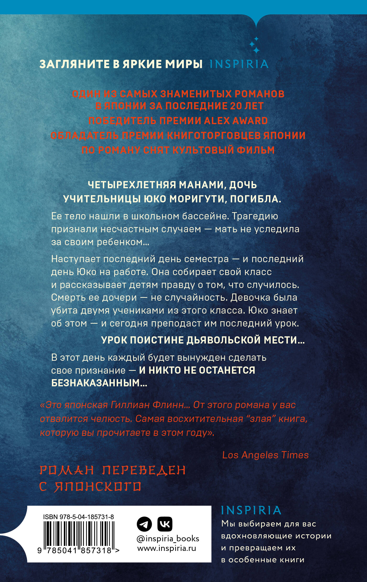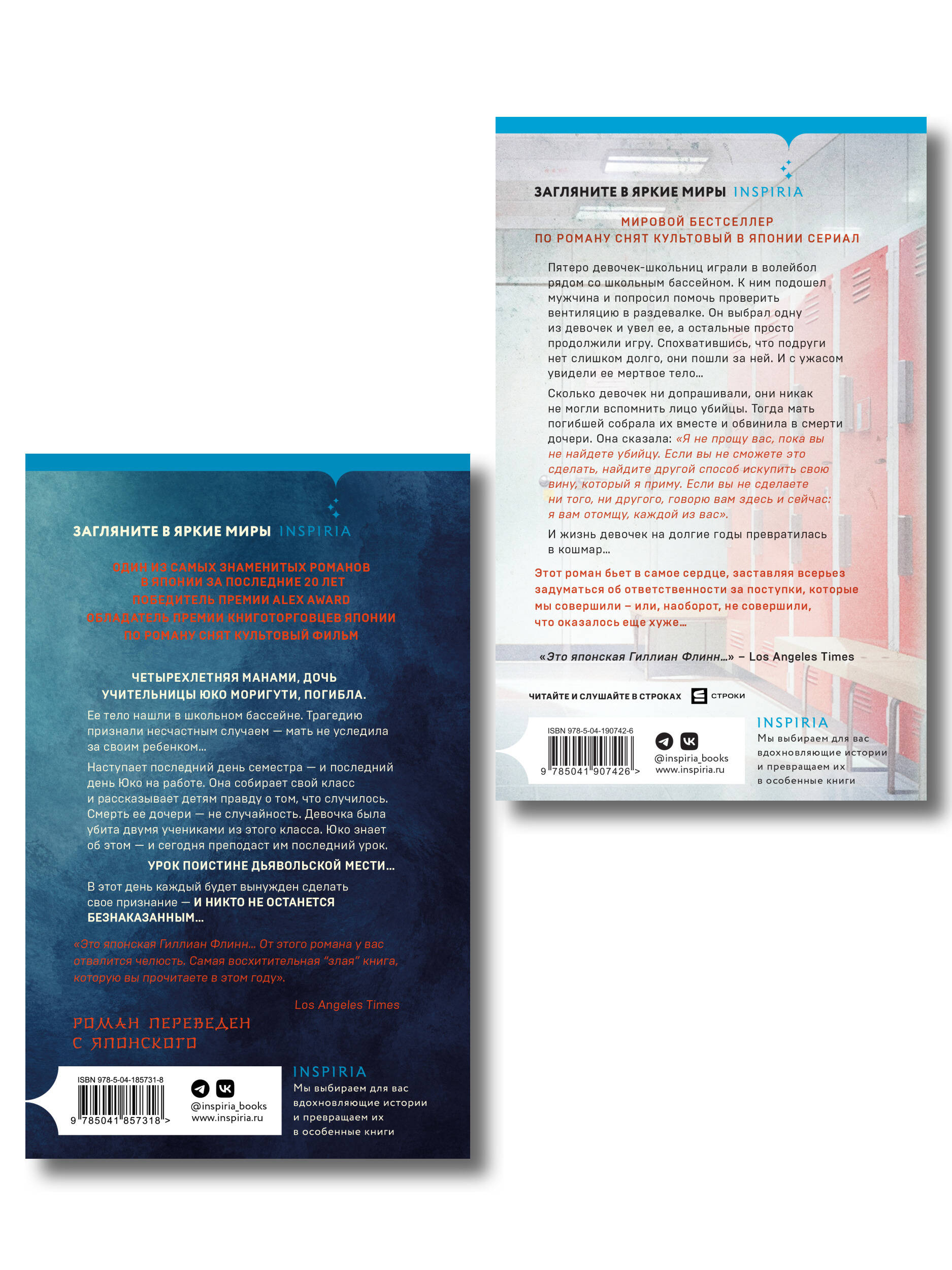 Признания Четырехлетняя Манами, дочь учительницы Юко Моригути, погибла. Ее тело нашли в школьном бассейне. Трагедию признали несчастным случаем - мать не уследила за своим ребенком… Наступает последний день семестра - и последний день Юко на работе. Она собирает свой класс и рассказывает детям правду о том, что случилось. Смерть ее дочери - не случайность. Девочка была убита двумя учениками из этого класса. Юко знает об этом - и сегодня преподаст им последний урок. Урок поистине дьявольской мести… В этот день каждый будет вынужден сделать свое признание - и никто не останется безнаказанным… Искупление Пятеро девочек-школьниц играли в волейбол рядом со школьным бассейном. К ним подошел мужчина и попросил помочь проверить вентиляцию в раздевалке. Он выбрал одну из девочек и увел ее, а остальные просто продолжили игру. Спохватившись, что подруги нет слишком долго, они пошли за ней. И с ужасом увидели ее мертвое тело… Сколько девочек ни допрашивали, они никак не могли вспомнить лицо убийцы. Тогда мать погибшей собрала их вместе и обвинила в смерти дочери. Она сказала: "Я не прощу вас, пока вы не найдете убийцу. Если вы не сможете это сделать, найдите другой способ искупить свою вину, который я приму. Если вы не сделаете ни того, ни другого, говорю вам здесь и сейчас: я вам отомщу, каждой из вас". И жизнь девочек на долгие годы превратилась в кошмар…| Издательство | ООО "Издательство "Эксмо" |