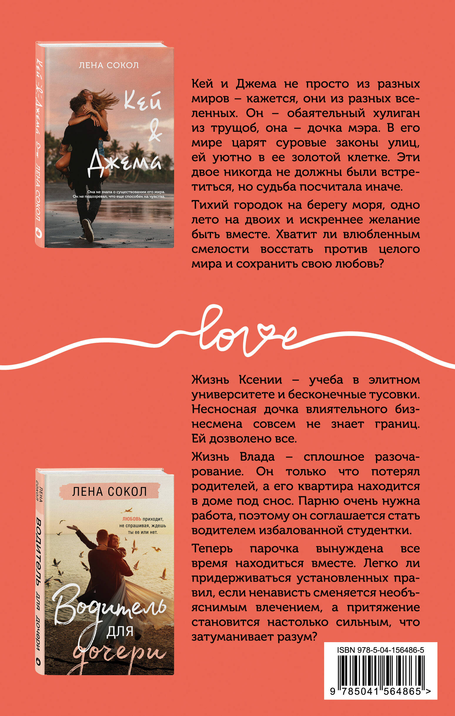 «Кей&Джема» Кей и Джема не просто из разных миров - кажется, они из разных вселенных. Он - обаятельный хулиган из трущоб, она - дочка мэра. В его мире царят суровые законы улиц, ей уютно в ее золотой клетке. Эти двое никогда не должны были встретиться, но судьба посчитала иначе. Тихий городок на берегу моря, одно лето на двоих и искреннее желание быть вместе. Хватит ли влюбленным смелости восстать против целого мира и сохранить свою любовь? «Водитель для дочери» Жизнь Ксении - учеба в элитном университете и бесконечные тусовки. Несносная дочка влиятельного бизнесмена совсем не знает границ. Ей дозволено все. Жизнь Влада - сплошное разочарование. Он только что потерял родителей, а его квартира находится в доме под снос. Парню очень нужна работа, поэтому он соглашается стать водителем избалованной студентки. Теперь парочка вынуждена все время находиться вместе. Легко ли придерживаться установленных правил, если ненависть сменяется необъяснимым влечением, а притяжение становится настолько сильным, что затуманивает разум? Впервые! Комплект из двух полюбившихся читателям книг от автора бестеллеров - Лены Сокол! Оба романа входят в «Приморский цикл»: сюжет разворачивается в городе на берегу моря, а главные героини произведений - лучшие подруги. Эксклюзивная бонусная глава в «Водителе для дочери», объединяющая и завершающая две истории!| Издательство | ООО "Издательство "Эксмо" |