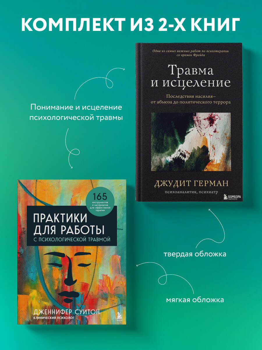 В комплект вошли 2 книги: 1) Практики для работы с психологической травмой. 165 инструментов и материалов для эффективной терапии Доктор Дженнифер Суитон, лицензированный клинический психолог и всемирно признанный эксперт в области проблем тревожности и травм, создала уникальный инструментарий для психологов, в котором впервые уделено внимание нейробиологическому подходу в лечении ПТСР и восстановлении психического здоровья. В книге представлен обширный набор инструментов, упражнений и раздаточных материалов для работы с ключевыми областями мозга, которые наиболее подвержены влиянию травматического опыта. 2) Травма и исцеление. Последствия насилия от абьюза до политического террора "Травма и исцеление" - это основополагающий текст о понимании людей переживших психологическую травму. Помещая индивидуальный опыт в более широкие политические рамки, психиатр из Гарварда Джудит Герман утверждает, что психологическая травма неотделима от ее социального и политического контекста. Опираясь на свое собственное исследование насилия над детьми, а также обширную литературу о ветеранах боевых действий и жертвах политического террора, она показывает удивительные параллели между частными ужасами, такими как жестокое обращение с детьми, и общественными ужасами, такими как война.