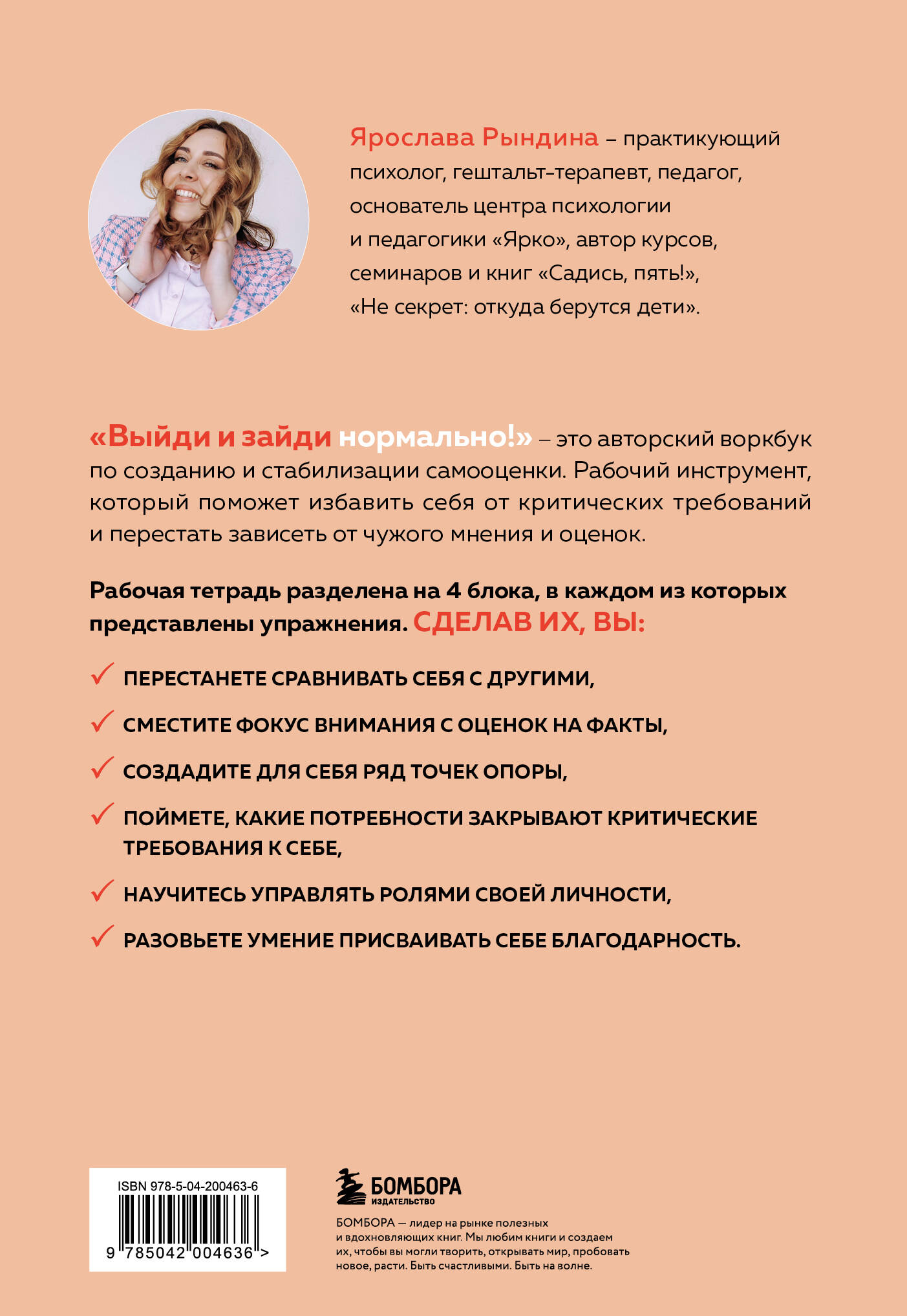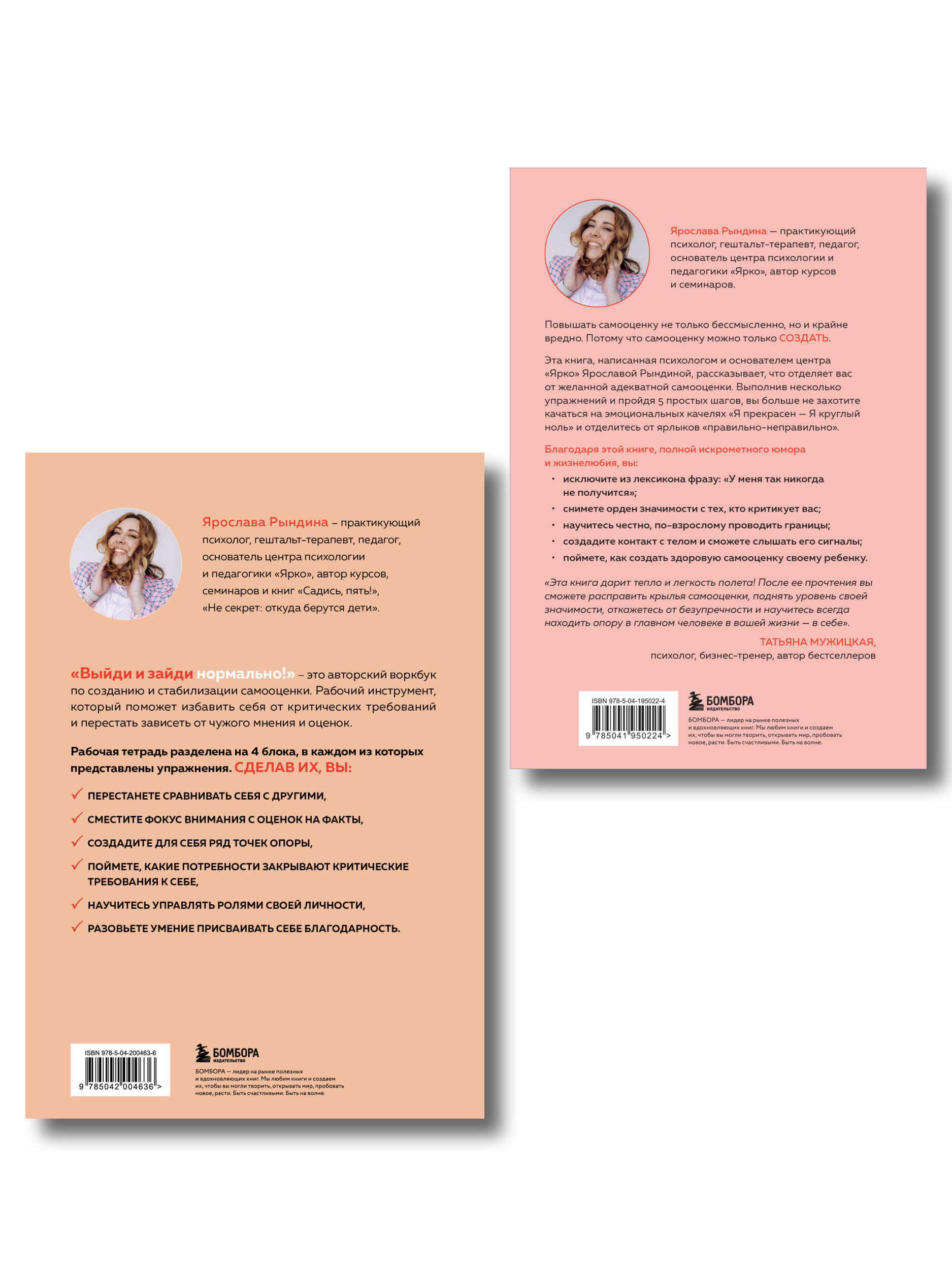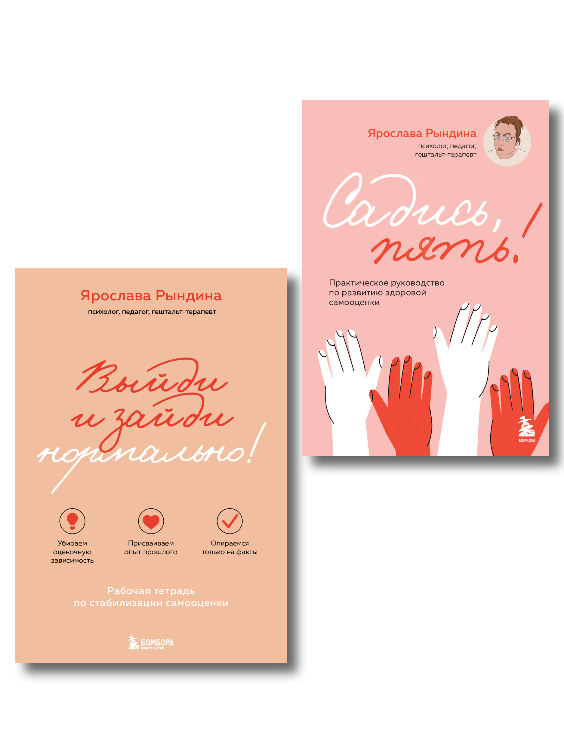 Комплект состоит из 2-х книг: "Садись, пять! Практическое руководство по развитию здоровой самооценки", "Выйди и зайди нормально! Рабочая тетрадь по стабилизации самооценки" "Садись, пять! Практическое руководство по развитию здоровой самооценки" Книга-инструкция по созданию самооценки от психолога, гештальт-терапевта Ярославы Рындиной. В книге автор предлагает авторскую систему из нескольких шагов. Пройдя их вы перестанете зависеть от мнения окружающих, приструните своего внутреннего критика и наладите контакт со своим телом. "Выйди и зайди нормально! Рабочая тетрадь по стабилизации самооценки" Рабочая тетрадь по созданию и стабилизации самооценки. Написана психологом, гештальт-терапевтом, педагогом Ярославой Рындиной. В рабочей тетради читатель найдет более 20 упражнений и заданий для работы с критическими требованиями, субличностями и зависимостью от оценок.| Издательство | ООО "Издательство "Эксмо" |
