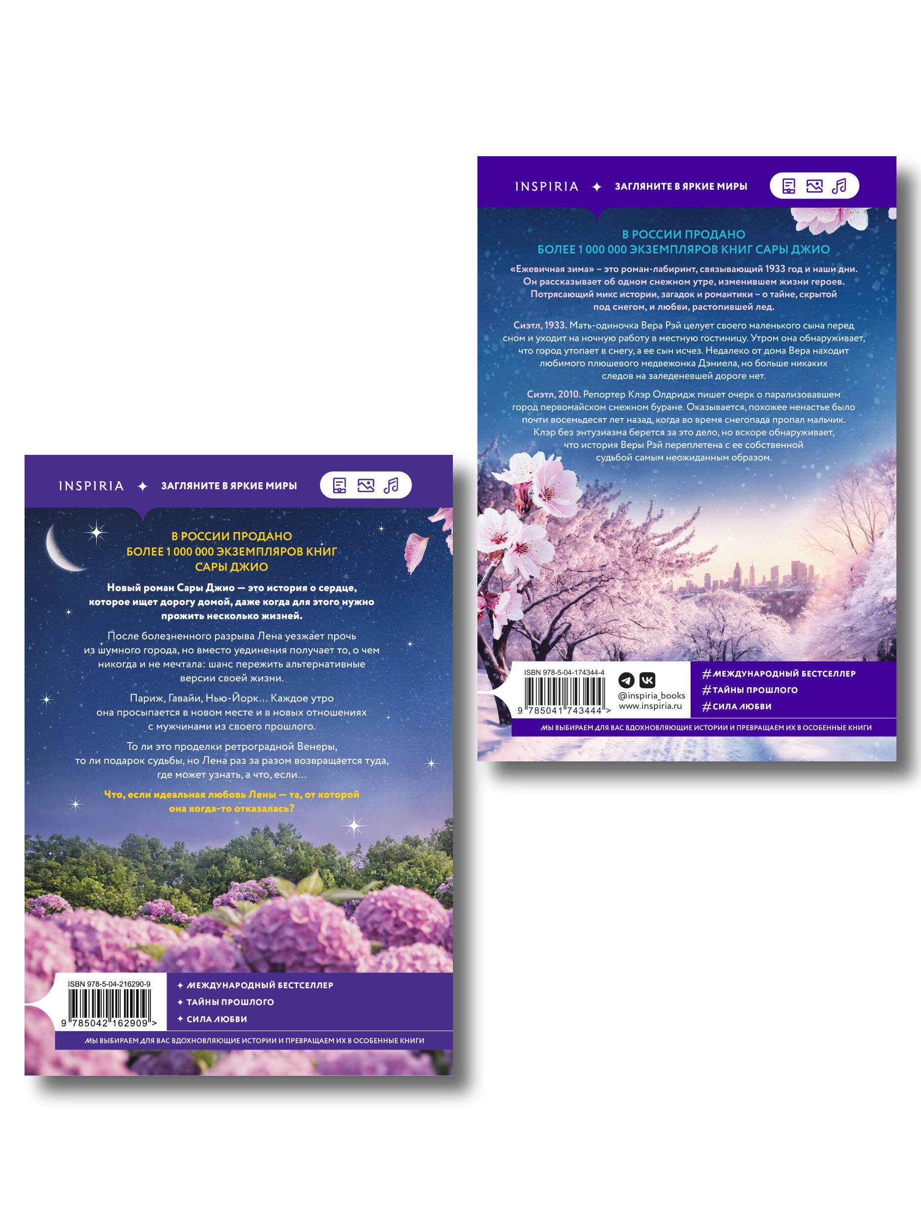 Комплект из 2-х книг королевы романтического жанра Сары Джио. В комплект входят романы "Ретроградная Венера" и "Ежевичная зима". РЕТРОГРАДНАЯ ВЕНЕРА История о сердце, которое ищет дорогу домой, даже если для этого нужно прожить несколько жизней. После болезненного разрыва Лена уезжает прочь от шумного города - но вместо уединения получает то, о чем никогда не мечтала: шанс пережить альтернативные версии своей жизни. Париж, Гавайи, Нью-Йорк… Каждое утро она просыпается в новом месте и в новых отношениях с мужчинами из своего прошлого. То ли это проделки ретроградной Венеры, то ли подарок судьбы, но Лена раз за разом возвращается туда, где может узнать, а что, если… Что, если идеальная любовь Лены - та, от которой она когда-то отказалась? ЕЖЕВИЧНАЯ ЗИМА «Ежевичная зима» - это роман-лабиринт, связывающий 1933 год и наши дни. Он рассказывает об одном снежном утре, изменившем жизни героев. Потрясающий микс истории, загадок и романтики - о тайне, скрытой под снегом, и любви, растопившей лед. Сиэтл, 1933. Мать-одиночка Вера Рэй целует своего маленького сына перед сном и уходит на ночную работу в местную гостиницу. Утром она обнаруживает, что город утопает в снегу, а ее сын исчез. Недалеко от дома Вера находит любимого плюшевого медвежонка Дэниела, но больше никаких следов на заледеневшей дороге нет. Сиэтл, 2010. Репортер Клэр Олдридж пишет очерк о парализовавшем город первомайском снежном буране. Оказывается, похожее ненастье было почти восемьдесят лет назад, когда во время снегопада пропал мальчик. Клэр без энтузиазма берется за это дело, но вскоре обнаруживает, что история Веры Рэй переплетена с ее собственной судьбой самым неожиданным образом. «Увлекательная история об искуплении и силе любви». - Publishers Weekly| Издательство | ООО "Издательство "Эксмо" |