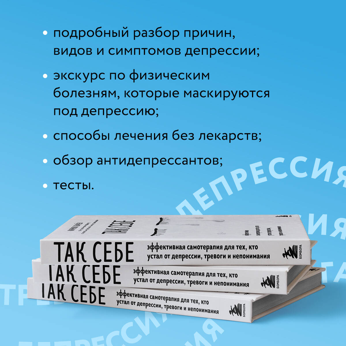 Этот набор - настоящая палочка-выручалочка для тех, кому пришлось столкнуться с такими недугами, как депрессия и тревожность. А, как раскрывает психотерапевт Кирилл Сычев в своей книге, сталкиваться с ними в современном обществе так или иначе приходится всем. Из книги «Так себе» вы узнаете, что же скрывается под этим таинственным словом «депрессия», какая она бывает и, самое главное, как с ней справляться. С последним вам помогут карточки «Рецепт равновесия», сделанные специально для того, чтобы вы могли сами себе оказать первую помощь. Если нужно быстро справиться с тревогой - вытяните красную карточку, если вам нужна поддержка - вытяните синюю, а если нужно зарядиться энергией - вытяните зеленую.| Издательство | ООО "Издательство "Эксмо" |
