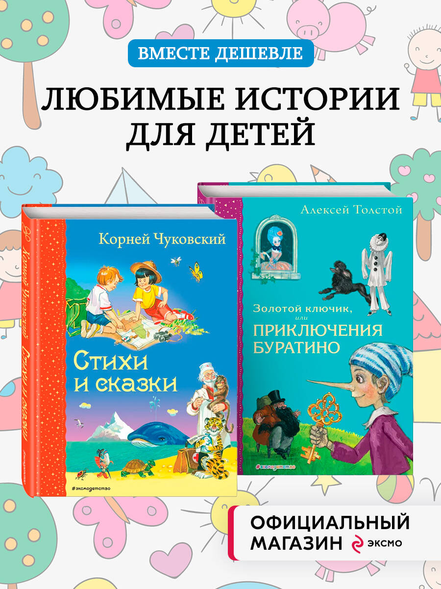 В комплект вошли 2 книги: «Стихи и сказки» Корнея Чуковского и «Золотой ключик, или Приключения Буратино» Алексея Толстого. Знакомые с детства стихи и сказки Корнея Чуковского с такими героями, как Тараканище, Муха-Цокотуха, Айболит и Бармалей увлекут и подарят радость от чтения, а приключения Буратино и его друзей, написанные Алексеем Толстым, научат добру, взаимовыручке и находчивости. Произведения включены в школьную программу по внеклассному чтению, текст дополняют приятные иллюстрации Владимира Канивца и Анны Власовой. Книги небольшого формата с фольгой и глянцевым лаком. Подойдут в качестве подарка и станут приятным приобретением для семейной библиотеки.| Издательство | ООО "Издательство "Эксмо" |