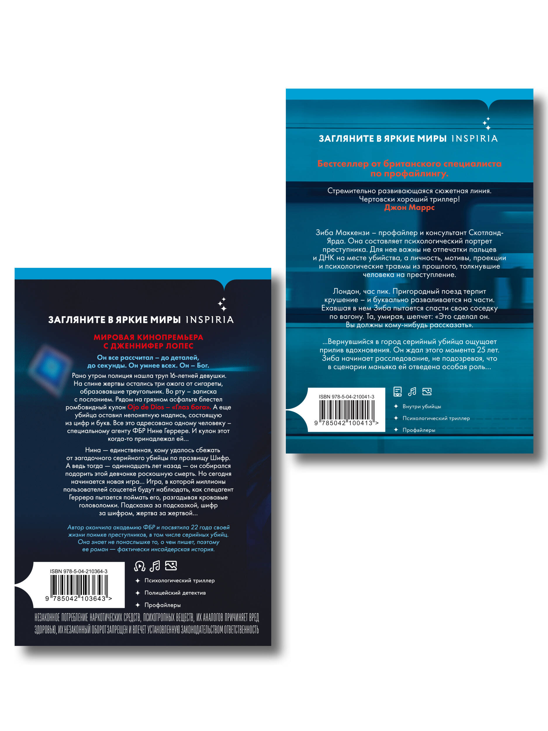 НЕЗАКОННОЕ ПОТРЕБЛЕНИЕ НАРКОТИЧЕСКИХ СРЕДСТВ, ПСИХОТРОПНЫХ ВЕЩЕСТВ, ИХ АНАЛОГОВ ПРИЧИНЯЕТ ВРЕД ЗДОРОВЬЮ, ИХ НЕЗАКОННЫЙ ОБОРОТ ЗАПРЕЩЕН И ВЛЕЧЕТ УСТАНОВЛЕННУЮ ЗАКОНОДАТЕЛЬСТВОМ ОТВЕТСТВЕННОСТЬ. «Границы безумия» Зиба Маккензи - профайлер и консультант Скотланд-Ярда. Она составляет психологический портрет преступника. Для нее важны не отпечатки пальцев и ДНК на месте убийства, а личность, мотивы, проекции и психологические травмы из прошлого, толкнувшие человека на преступление. Лондон, час пик. Пригородный поезд терпит крушение - и буквально разваливается на части. Ехавшая в нем Зиба пытается спасти свою соседку по вагону. Та, умирая, шепчет: «Это сделал он. Вы должны кому-нибудь рассказать». ...Вернувшийся в город серийный убийца ощущает прилив вдохновения. Он ждал этого момента 25 лет. Зиба начинает расследование, не подозревая, что в сценарии маньяка ей отведена особая роль… «Шифр» Он кодирует чужую смерть. Разгадаете его послание - предотвратите убийство. Но вряд ли вы успеете… Ведь он все рассчитал - до деталей, до секунды. Он умнее всех. Он - Бог. Рано утром полиция нашла труп 16-летней девушки. На спине жертвы остались три ожога от сигареты, образовавшие треугольник. Во рту - записка с посланием. Рядом на грязном асфальте блестел ромбовидный кулон Ojo de Dios - «Глаз бога». А еще убийца оставил непонятную надпись, состоящую из цифр и букв. Все это адресовано одному человеку - специальному агенту ФБР Нине Геррере. И кулон этот когда-то принадлежал ей… Нина - единственная, кому удалось сбежать от загадочного серийного убийцы по прозвищу Шифр. А ведь тогда - одиннадцать лет назад - он собирался подарить этой девчонке роскошную смерть. Но сегодня начинается новая игра… Игра, в которой миллионы пользователей соцсетей будут наблюдать, как спецагент Геррера пытается поймать его, разгадывая кровавые головоломки. Подсказка за подсказкой, шифр за шифром, жертва за жертвой…| Издательство | ООО "Издательство "Эксмо" |