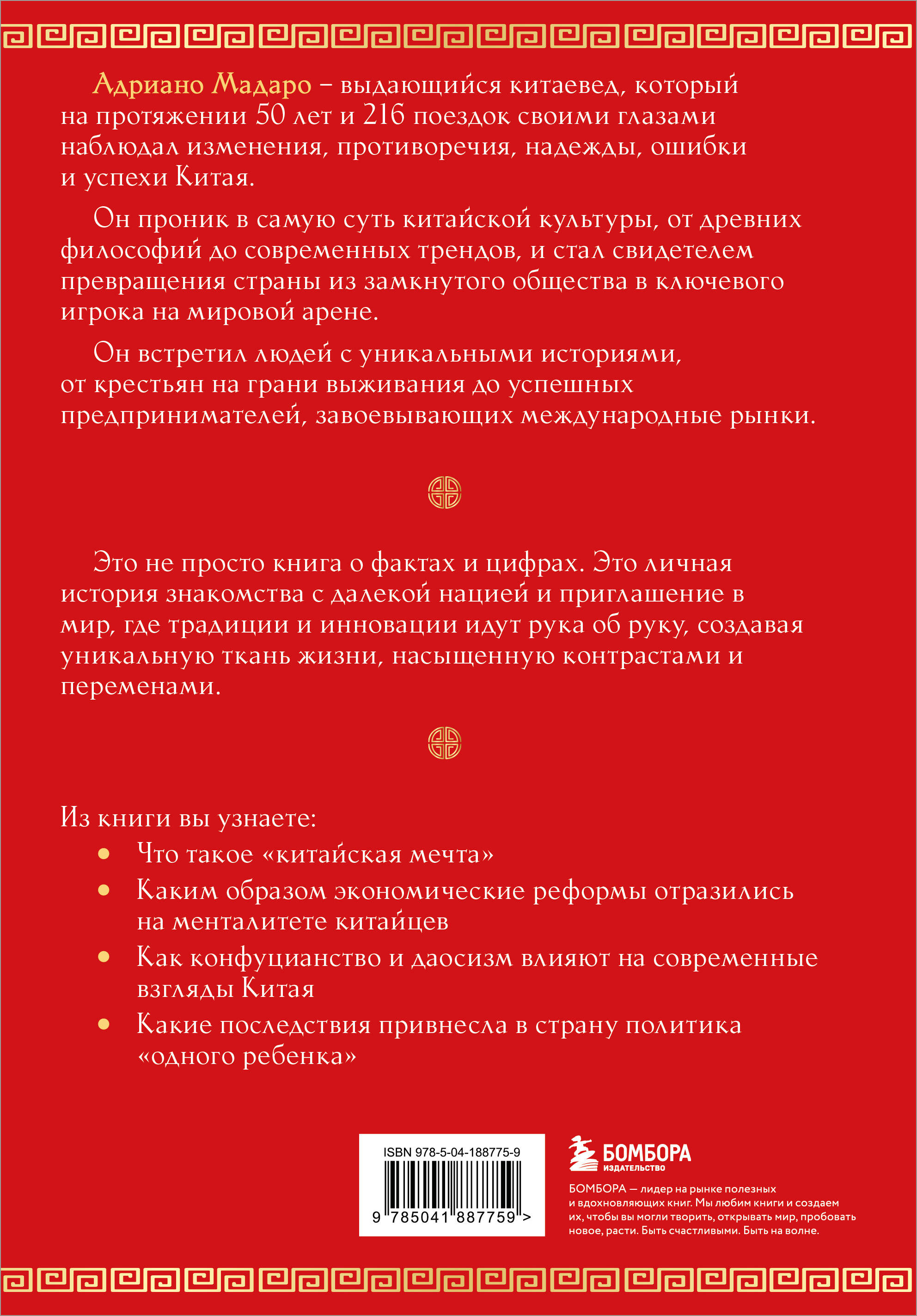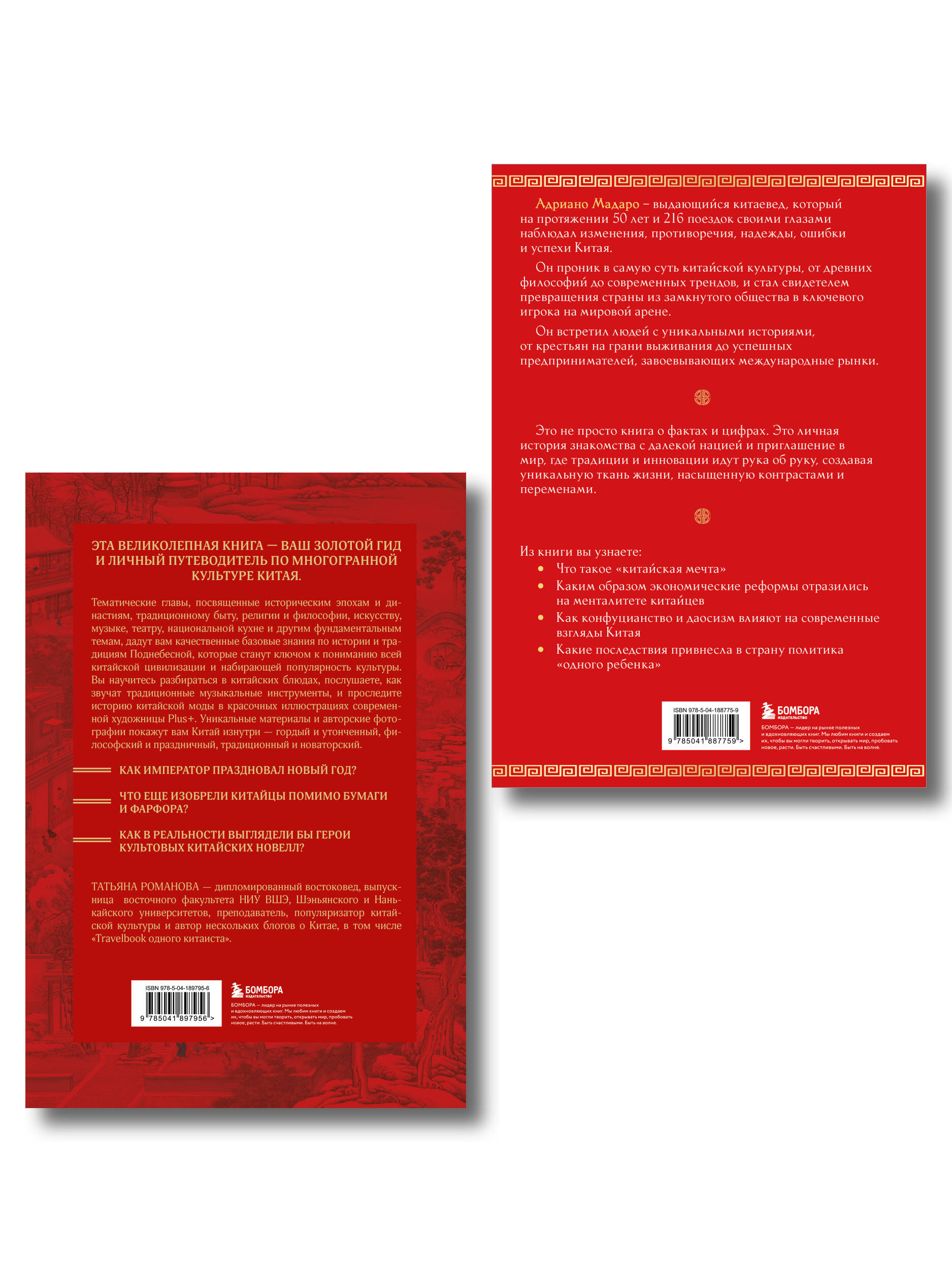 1. Адриано Мадаро. Вечный Китай. Полная история великой цивилизации Многие искатели приключений, исследователи и религиозные миссионеры пытались поведать миру о Поднебесной, однако лишь немногим удалось оценить всю глубину и многообразие этой огромной страны. Среди этих счастливчиков - Мадаро Адриано, автор этой книги и один из самых известных китаеведов в мире. За 50 лет он совершил 216 поездок Китай, наблюдал за трансформацией страны, видел ее противоречия и успехи, а также изучал причины ее ошибок и надежд. От времен Марко Поло до эпохи современного китайского социализма, от тибетского вопроса до напряженных отношений с Соединенными Штатами, от протестов в Гонконге до эпидемий загадочных вирусов - всё это рассказ о нации, которая играет ключевую роль в глобальной геополитике. Глубокое исследование, в которое вам посчастливится погрузиться благодаря этой книге, стремительно обогатит ваши познания и позволит преисполниться еще большей любовью к этой загадочной стране! 2. Татьяна Романова. Срединная империя. Золотой путеводитель по культуре Китая Гордый и самодостаточный Китай во все времена привлекал взгляды ближайших и дальних соседей. В эпоху Римской империи китайцы уже пользовались утюгами, при этом отношения "хозяин - раб" сохранялись в китайском обществе до середины прошлого века. Китаю удается сочетать в себе противоположности: мимолетную, ускользающую красоту мгновения, запечатленную в живописи и поэзии, и тысячелетия славной, местами брутальной истории; утонченное искусство ради искусства и инновационные технологии во всех сферах жизни человека; духовное и материальное. Благодаря своей противоречивости Китай не перестает удивлять, но вместе с тем никогда не изменяет себе. С этим уникальным культурным путеводителем вы узнаете все, что важно знать о китайской цивилизации в первую очередь. Вы начнете разбираться в исторических эпохах и династиях, традиционном китайском искусстве и ключевых традициях, без которых невозможно понять Поднебесную и ее жителей. Книга поделена на тематические главы, посвященные разным сферам жизни и культуры: краткой истории Китая, искусству, музыке, театру, жизненному укладу, мировоззрению, национальной кухне и другим. Великолепно подобранные иллюстрации и авторские фотографии покажут настоящую Срединную империю, как китайцы до сих пор с гордостью называют свою страну. О Китае популярно и увлекательно рассказывает Татьяна Романова - дипломированный востоковед, выпускница восточного факультета НИУ ВШЭ, Шэньянского и Нанькайского университетов, преподаватель, популяризатор китайской культуры и автор нескольких блогов о Китае.| Издательство | ООО "Издательство "Эксмо" |