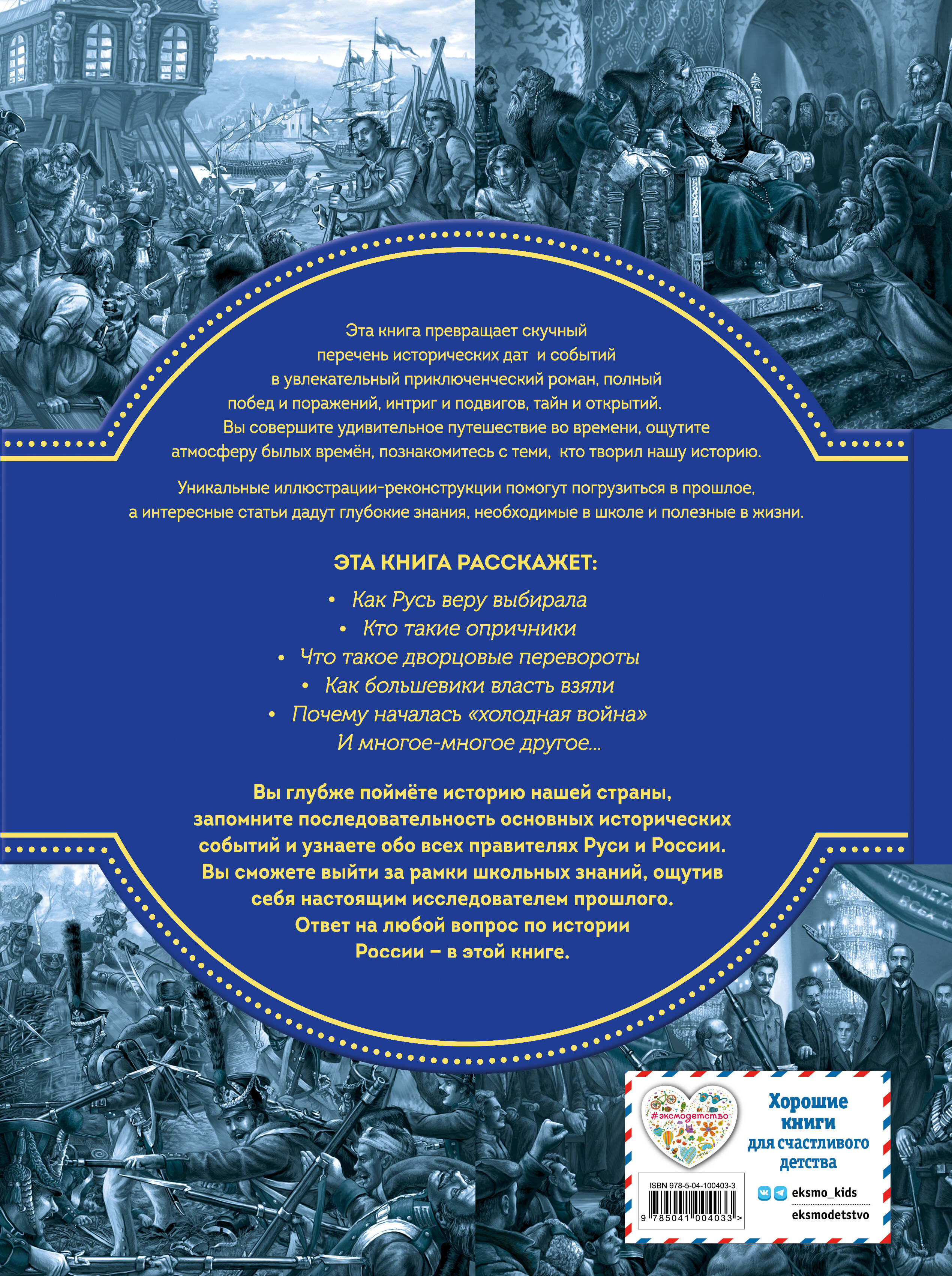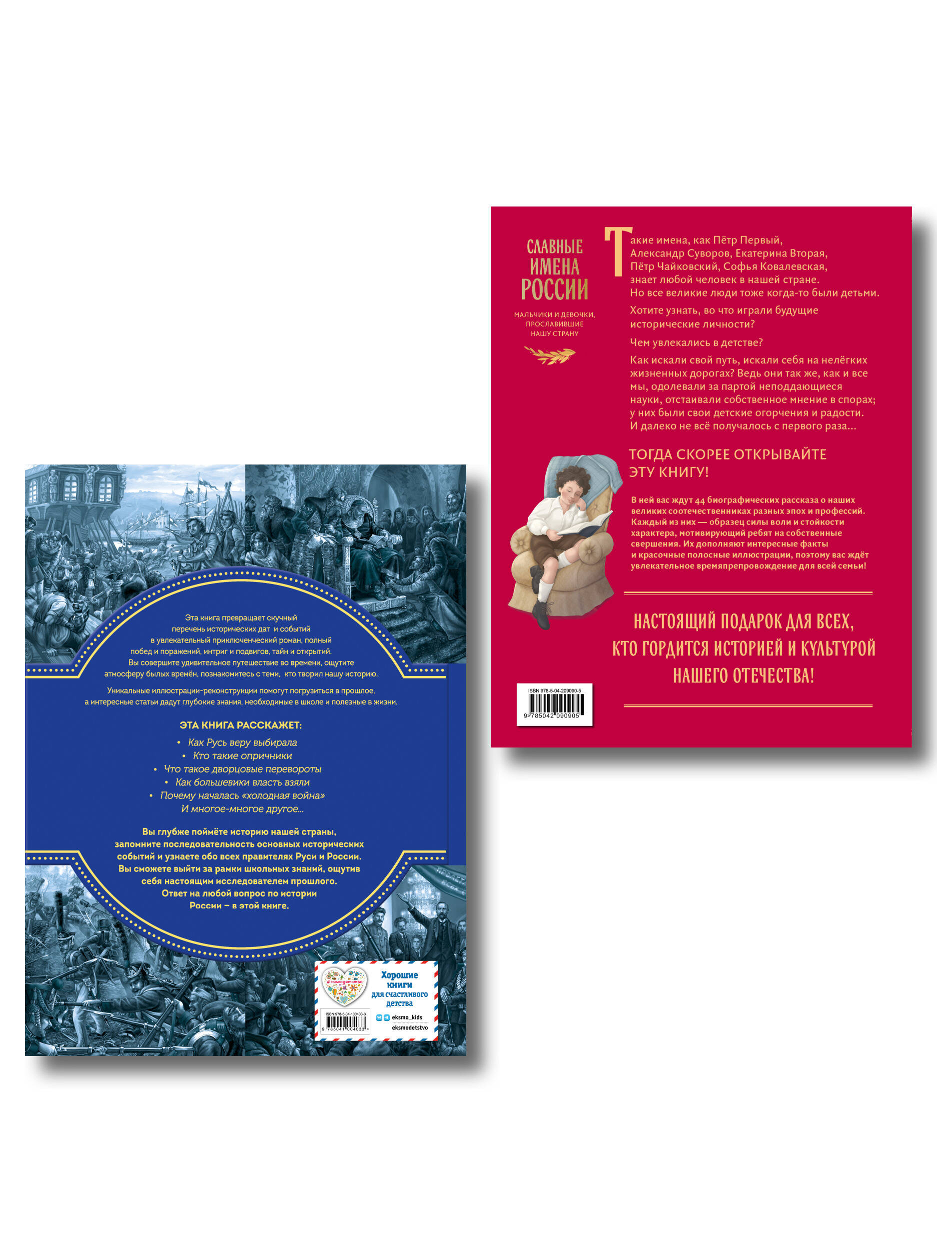 Комплект из 2-х книг: «Славные имена России» + «История России». «Славные имена России. Мальчики и девочки, прославившие нашу страну» Такие имена, как Петр Первый, Александр Суворов, Екатерина Вторая, Петр Чайковский, Софья Ковалевская, знает любой человек в нашей стране. Но все великие люди тоже когда-то были детьми. Хотите узнать, во что играли будущие исторические личности? Чем увлекались в детстве? Как искали свой путь, искали себя на нелегких жизненных дорогах? Ведь они так же, как и все мы, одолевали за партой неподдающиеся науки, отстаивали собственное мнение в спорах; у них были свои детские огорчения и радости. И далеко не все получалось с первого раза... Тогда скорее открывайте эту книгу! В ней вас ждут 44 биографических рассказа о наших великих соотечественниках разных эпох и профессий. Каждый из них - образец силы воли и стойкости характера, мотивирующий ребят на собственные свершения. Их дополняют интересные факты и красочные полосные иллюстрации, поэтому вас ждет увлекательное времяпрепровождение для всей семьи! Книги серии получили заслуженно высокую оценку - в 2024 году они были номинированы на премию Российского общества «Знание» в категории «Лучшая просветительская книга». «История России. Панорама нужных знаний» Эта великолепно оформленная подарочная энциклопедия превращает перечень исторических дат и событий в увлекательное путешествие сквозь время - в века, полные тайн и открытий, побед и поражений, дворцовых интриг и подвигов. Юные читатели ощутят атмосферу былой эпохи и познакомятся с великими людьми, которые творили историю России. Автор и иллюстратор книги - Юлия Школьник, педагог и профессиональный художник, в чьих энциклопедиях единство текста и визуального материала создает неповторимую атмосферу - ответит на самые интересные вопросы по истории нашей страны. Красочные иллюстрации помогут погрузиться в прошлое, а интересные статьи дадут глубокие знания, необходимые в школе и полезные в жизни. Отличный подарок для любознательных ребят по любому поводу!| Издательство | ООО "Издательство "Эксмо" |