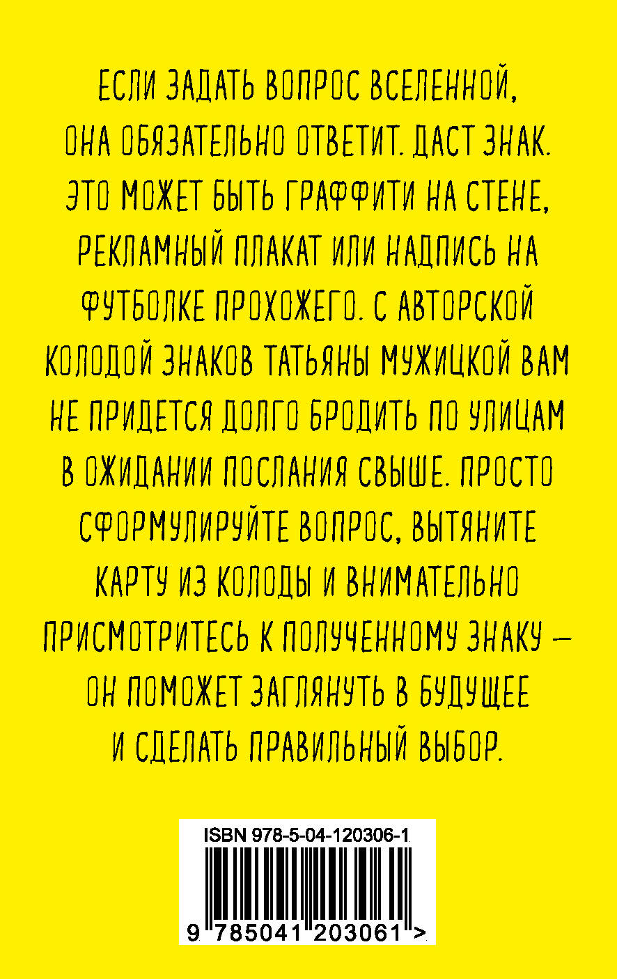 Комплект состоит из книги «Теория невероятности. Как мечтать, чтобы сбывалось, как планировать, чтобы достигалось» и метафорических карт «Знаки вселенной. 40 хулиганских карт, которые помогут заглянуть в будущее». «Теория невероятности. Как мечтать, чтобы сбывалось, как планировать, чтобы достигалось» Никакой магии. Только здравый смысл, психология и чуть-чуть веры в чудеса. Книга Татьяны Мужицкой - известного психолога, тренера и телеведущей - раскрывает механизмы исполнения желаний. Она предлагает до изящного простую технологию превращения «хочу» в «имею». Без аффирмаций, визуализаций и танцев с бубном. Зато почти со стопроцентной гарантией, что задуманное сбудется. Главное - быть последовательным и оперативно реагировать на счастливые возможности, которые подкидывает судьба. Метафорические карты «Знаки вселенной. 40 хулиганских карт, которые помогут заглянуть в будущее» Вселенная всегда отвечает, если задать ей вопрос. Правда, иногда довольно резко. Если вы из тех, кто не боится получить ответ слишком прямо, - эта колода для вас! Сделанная по принципу метафорических карт, колода хулиганских карт Татьяны Мужицкой сможет помочь вам найти решение, когда вы сильно сомневаетесь, что делать дальше или по правильному ли пути идете. Татьяна собирала эти знаки по всей стране, чтобы сейчас вы смогли расслабиться и поговорить со Вселенной. Граффити на стене, надпись на футболке, случайный рекламный слоган - у Вселенной много способов подать вам знак. Как пользоваться колодой: • Подумайте о том, что на данный момент является для вас очень важным, и задайте вопрос Вселенной. • Перемешайте колоду и вытяните одну карту. • Взгляните на карту и прислушайтесь к своим самым первым ощущениям. • Свяжите воедино ваши мысли и чувства и дайте ответ самому себе. В наборе: 39 карт + инструкция.