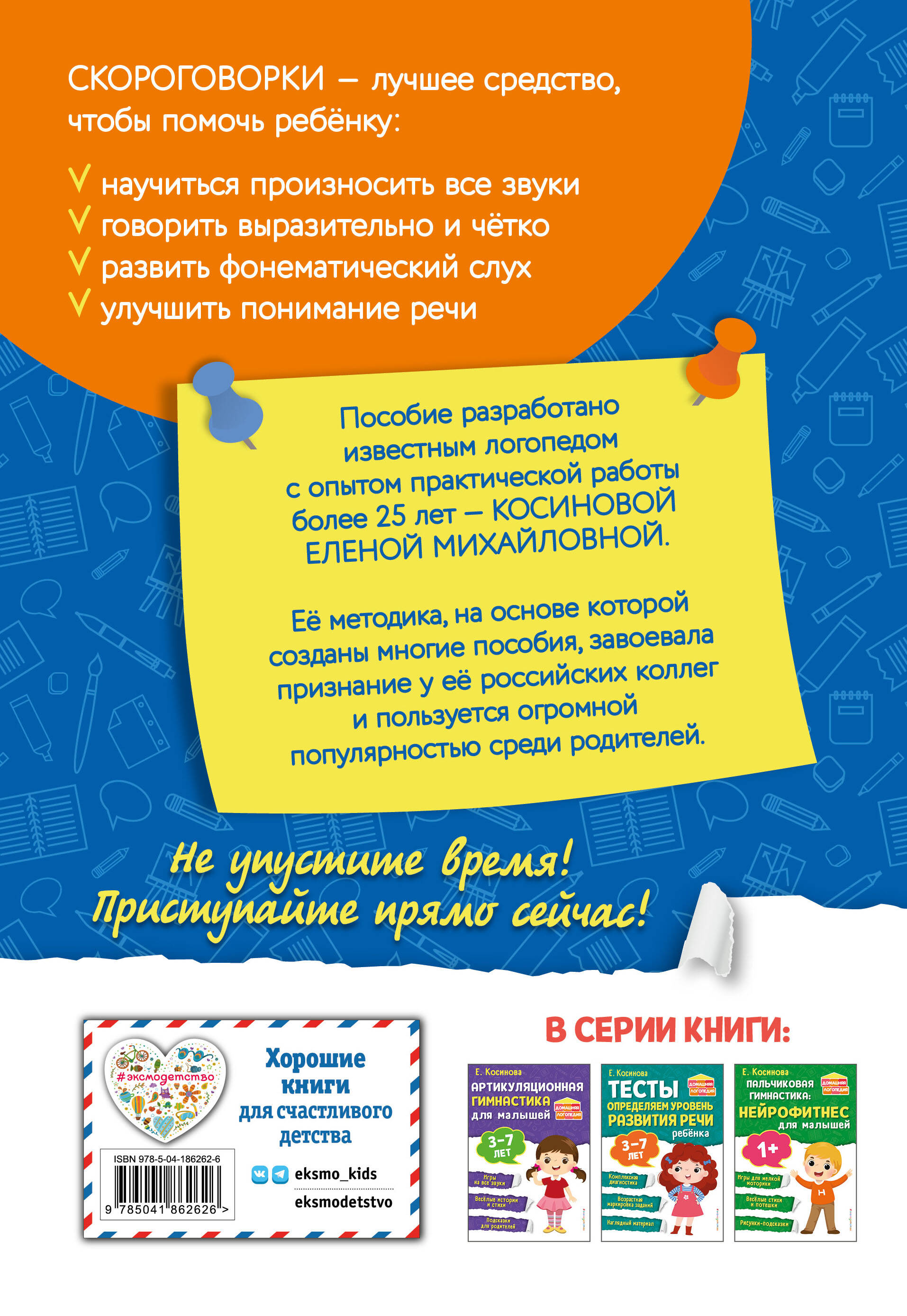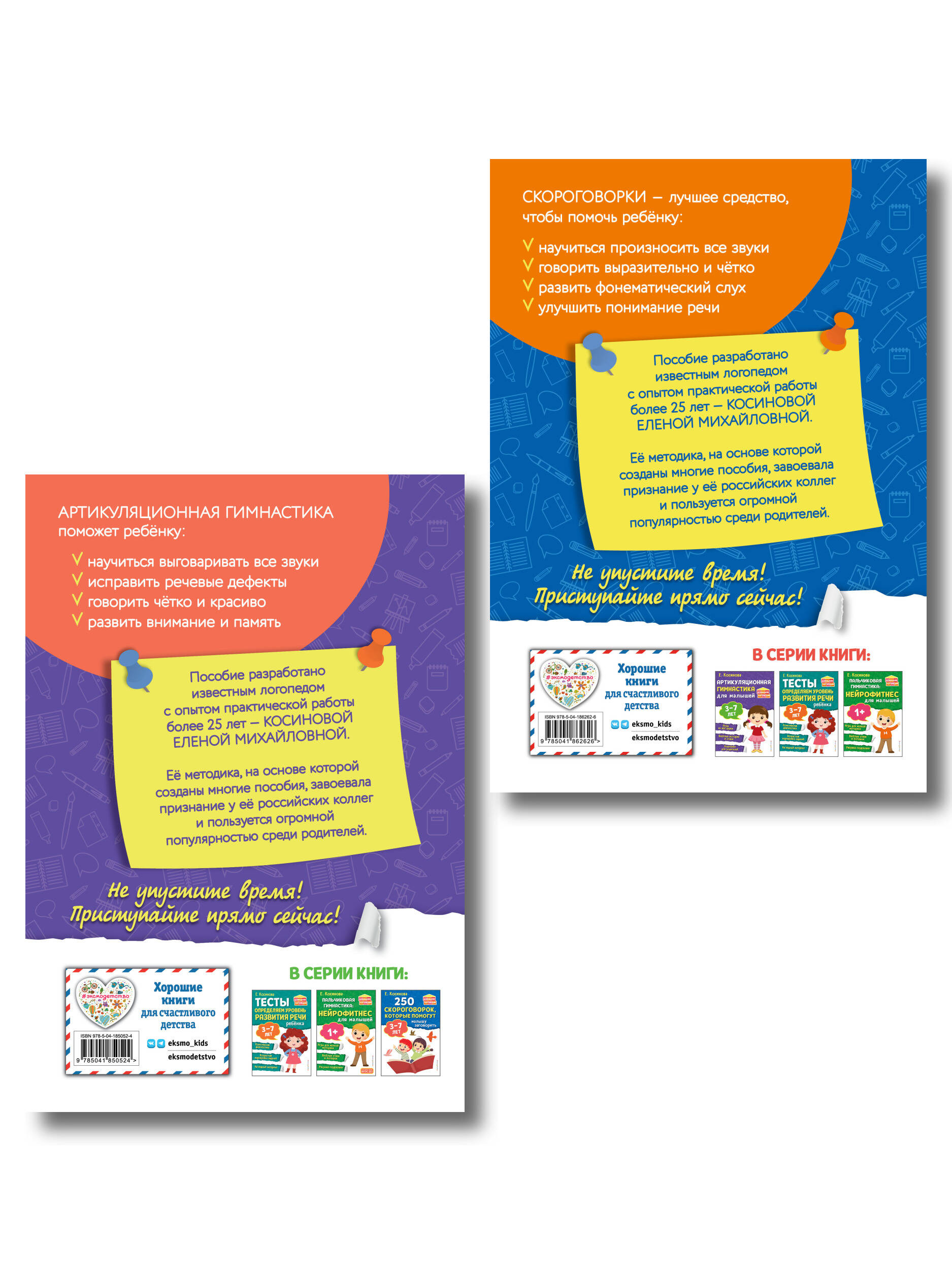 Комплект книг для детей 3, 4, 5, 6, 7 лет от издательства «Эксмо» поможет достичь отличного результата в формировании красивой и грамотной речи малыша и обеспечит успех при поступлении в первый класс. В наборе две книги: «250 скороговорок, которые помогут малышу заговорить» и «Артикуляционная гимнастика для малышей». Автор Елена Косинова - логопед-эксперт с многолетним стажем. Ее методика с доказанной эффективностью - хит среди логопедов-специалистов, которым позволяет проводить занятия по готовым рабочим схемам, а родителям - экономить семейный бюджет без привлечения платных педагогов и заниматься с ребенком самостоятельно. Просто, понятно, легко применить на практике! В книге много полезных скороговорок для любого малыша вне зависимости от его умений и возраста! Яркие сюжетные иллюстрации привлекают внимание, превращая обучение в веселую игру. Большая книга поможет улучшить дикцию, развить речевое дыхание, сделать речь выразительной и увеличить словарный запас. А еще малыша ждет огромное количество интересных игр, веселых стихов и историй. Смотрите фотографии, по ним легко понять технику выполнения упражнений для улучшения речи ребенка! Гарантированный результат: развитие артикуляционного аппарата, силы и высоты голоса, речевого слуха и внимания. Адресовано заботливым родителям и педагогам, занимающимся подготовкой детей к школе. Станет отличным подарком мальчикам и девочкам на любой праздник - Новый год, день рождения и просто без повода. Подходит для детей с ОВЗ.| Издательство | ООО "Издательство "Эксмо" |