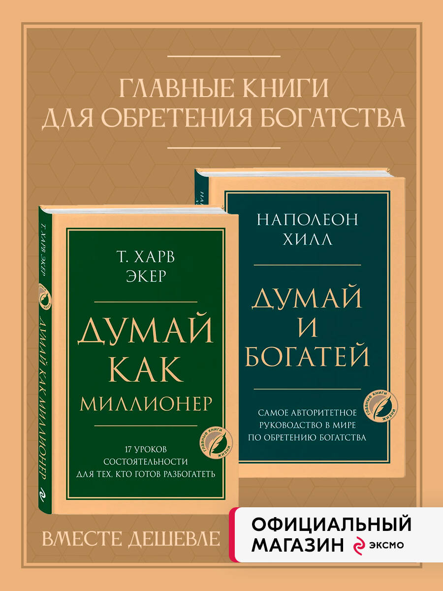 Комплект состоит из 2-х книг: «Думай как миллионер. 17 уроков состоятельности для тех, кто готов разбогатеть» и «Думай и богатей. Главная книга по обретению богатства». «Думай как миллионер. 17 уроков состоятельности для тех, кто готов разбогатеть» Мировая сенсация! Книга, издаваемая в 33 странах! Вы узнаете, о чем думают, что чувствуют и как поступают самые богатые люди планеты, а главное - что мешает вам стать одним из них. Первый в мире финансовый психолог Харв Экер поможет выяснить, какая «финансовая программа» заложена у вас на уровне подсознания и как она влияет на ваши текущие отношения с деньгами. Следуя его простым правилам, вы перепрограммируете себя на гораздо более высокий уровень доходов и достижений. Вы узнаете, как грамотно распоряжаться своими деньгами, какие источники пассивного дохода существуют и как, используя такое явление как «сложный процент», многократно увеличить свой капитал. «Думай и богатей. Главная книга по обретению богатства» ЛЕГЕНДАРНЫЙ БЕСТСЕЛЛЕР. ПРОДАНО БОЛЕЕ 70 000 000 ЭКЗЕМПЛЯРОВ. НАПОЛЕОН ХИЛЛ - известнейший американский психолог, журналист, советник президента Франклина Рузвельта, автор одной из самых продаваемых книг всех времен. Более 80 лет «Думай и богатей» по праву считается самым уважаемым учебником в мире по достижению успеха, преодолению трудностей и повышению жизненной энергии. В нем автор опирается на утверждение: «Бедность - это состояние ума. Успех приходит к тем, кто мыслит категориями успеха». Такой вывод Наполеон Хилл сделал, проведя более 500 интервью с самыми состоятельными людьми Америки: - Генри Форд, - Уильям Ригли, - Билл Гейтс, - Стивен Спилберг, - Майкл Джордан, - Арнольд Шварценеггер. Все они внесли свою лепту в создание этой эпохальной книги.| Издательство | ООО "Издательство "Эксмо" |