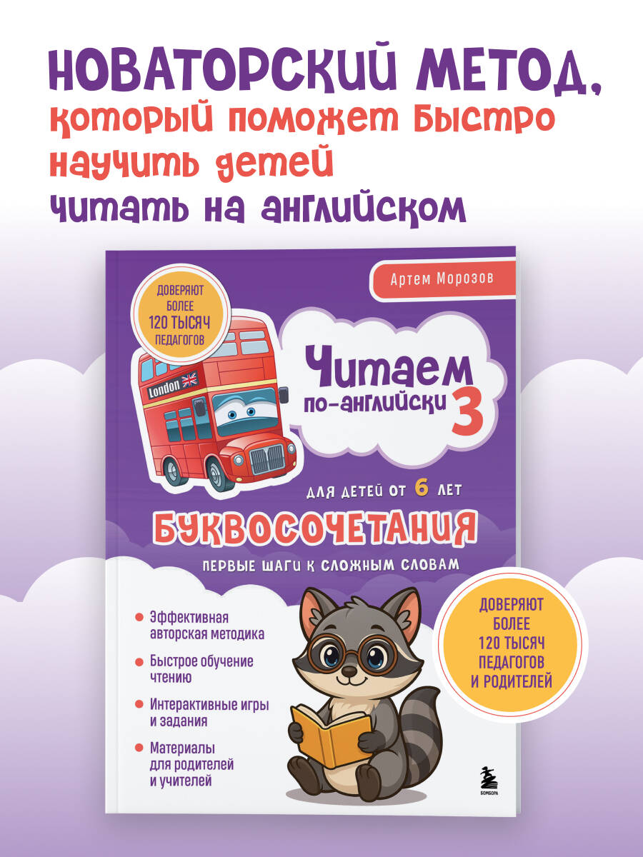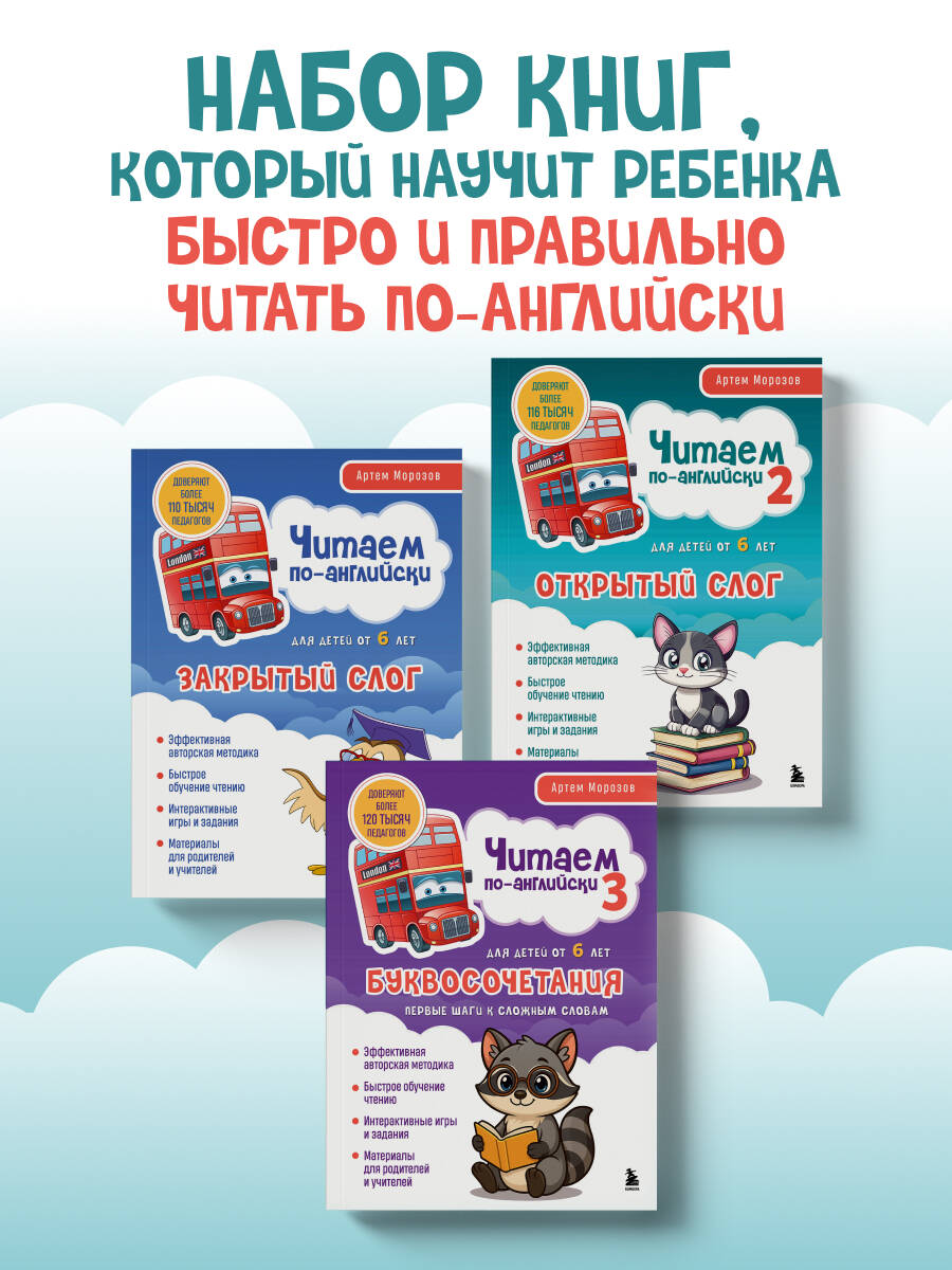 Комлпект книг включает все три части из цикла обучающих книг по чтению для детей от Артема Морозова. Новаторской методике сертифицированного преподавателя с квалификацией DELTA Кембриджского Университета доверяют более 119 тысяч педагогов и родителей. Благодаря разнообразным упражнениям, развивающим мелкую моторику, воображение и пространственное мышление, а также отказу от транскрипции обучение приносит ребятам удовольствие, и результат не заставляет себя долго ждать. Пособия подойдут как ученикам младшей школы, так и дошкольникам. Для родителей и учителей в конце даны рекомендации по проведению занятий и ответы на задания.| Издательство | ООО "Издательство "Эксмо" |