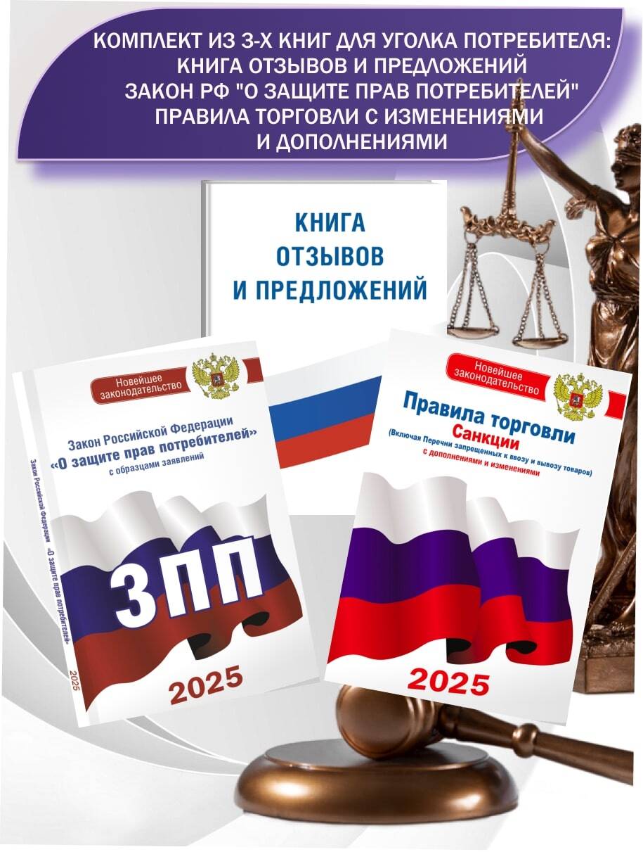Аннотация: Комплект из 3-х книг для уголка потребителя: Книга отзывов и предложений, Закон РФ "О защите прав потребителей", Правила торговли с изменениями и дополнениями на 2025 год