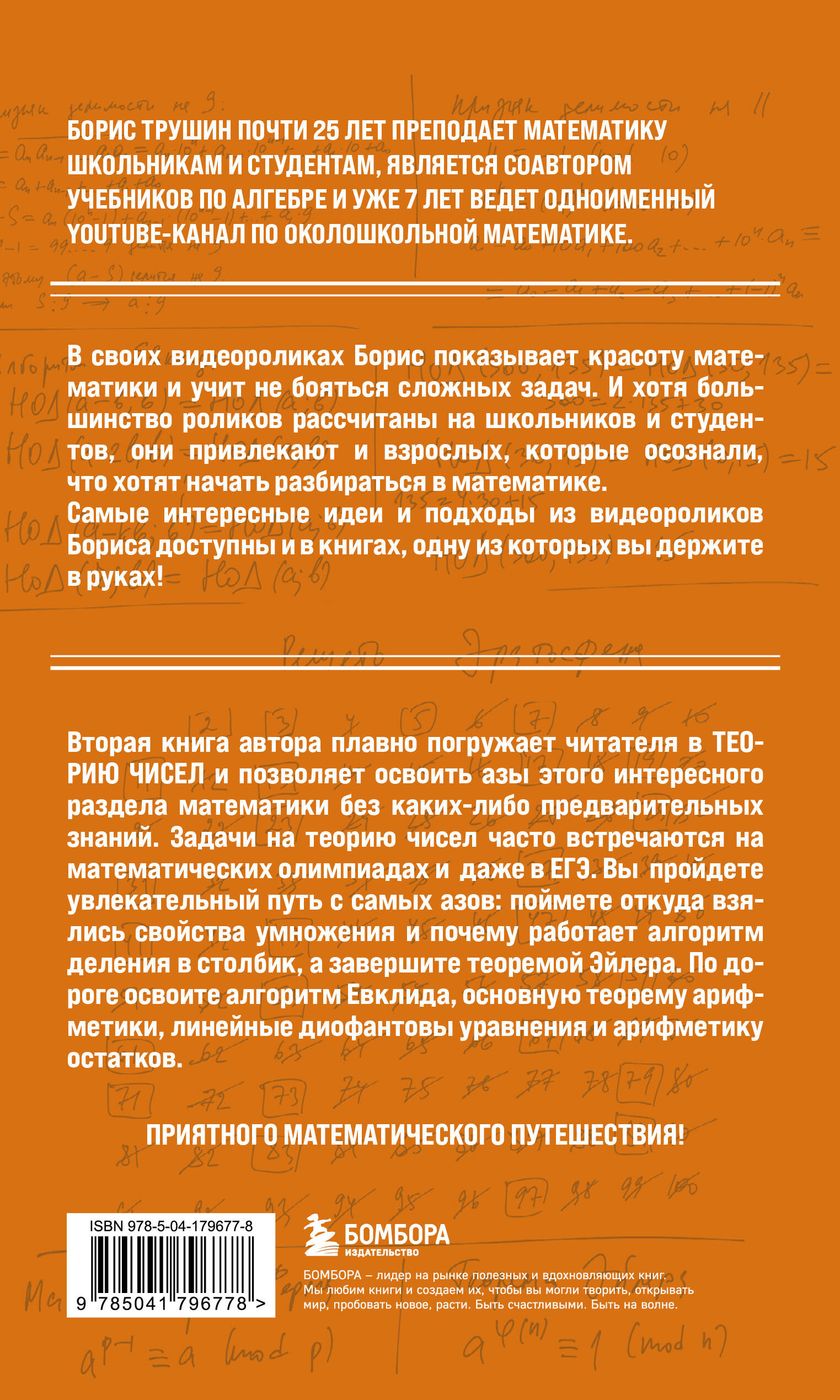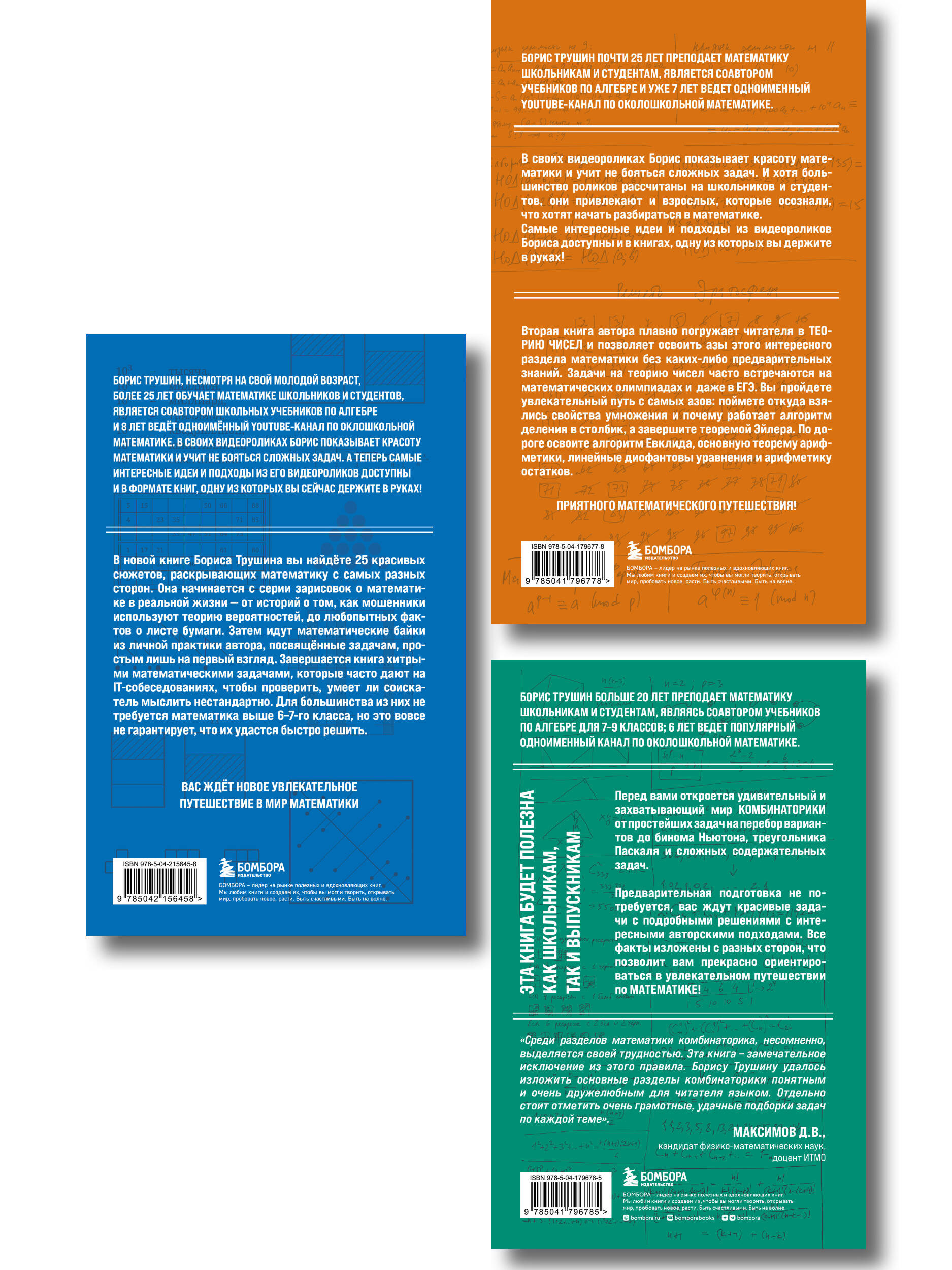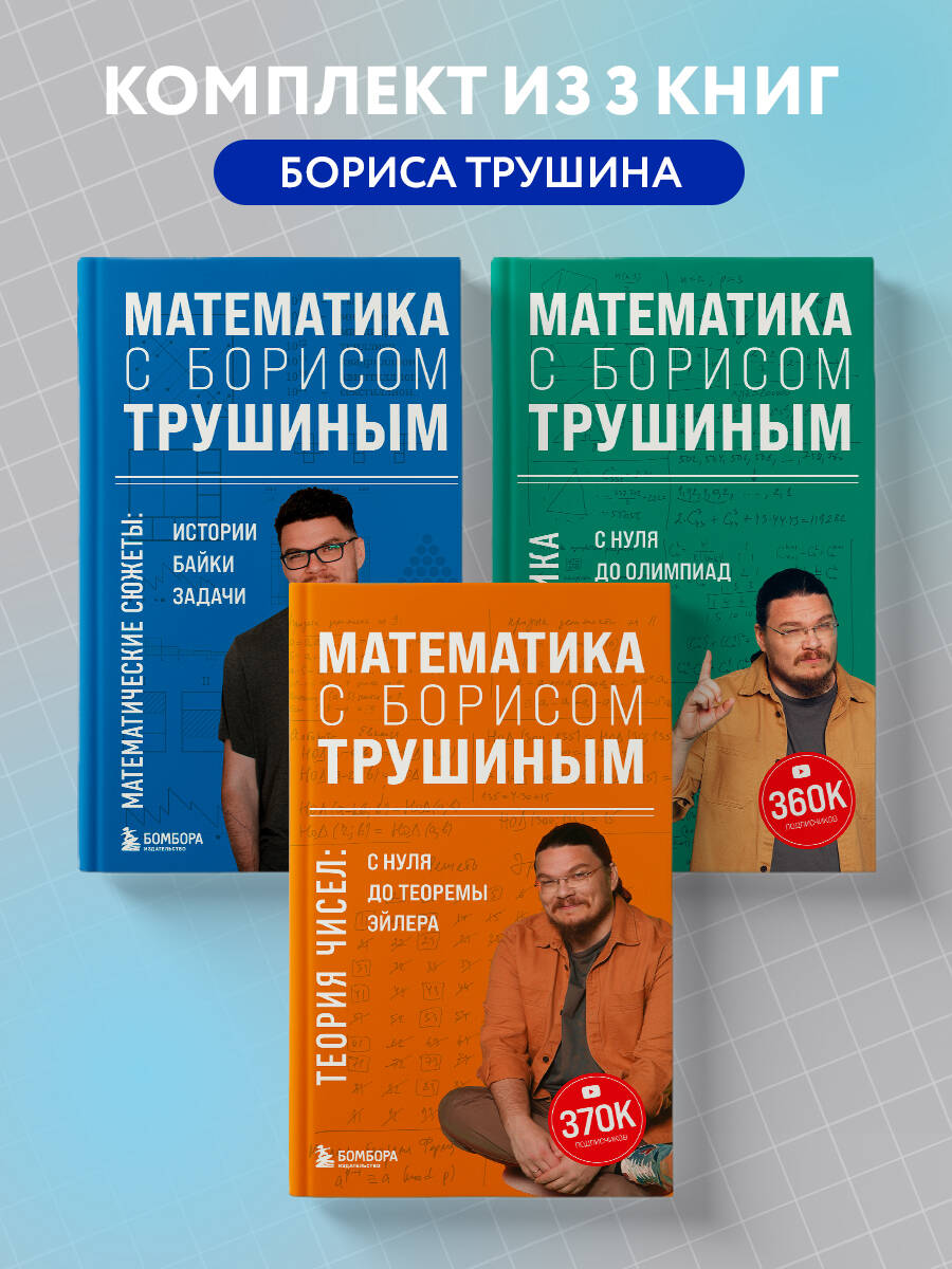 Комплект из трех книг известного математического блогера Бориса Трушина: "Комбинаторика: с нуля до олимпиад" + "Теория чисел: с нуля до теоремы Эйлера" +"Математические сюжеты: истории, байки, задачи". Интересные и необычные задачи помогут освоить эти разделы математики с нуля и до олимпиадного уровня. От простейших задач на перебор вариантов и алгоритма деления в столбик вы двинетесь к биному Ньютона, треугольнику Паскаля, к теореме Эйлера и числам Фибоначчи. Борис Трушин разбирает задачи, которые часто встречаются и на олимпиадах, и на ЕГЭ, а для тех, кто хочет проверить себя, в конце предоставлены подробные решения. Книги написаны понятным и дружелюбным для читателя языком. Автор знает, как объяснять понятно и интересно, ведь за его плечами - многолетний опыт преподавания математики школьникам и студентам. А еще автор ведет популярный YouTube-канал по математике. Изучайте Математику без напряжения!| Издательство | ООО "Издательство "Эксмо" |