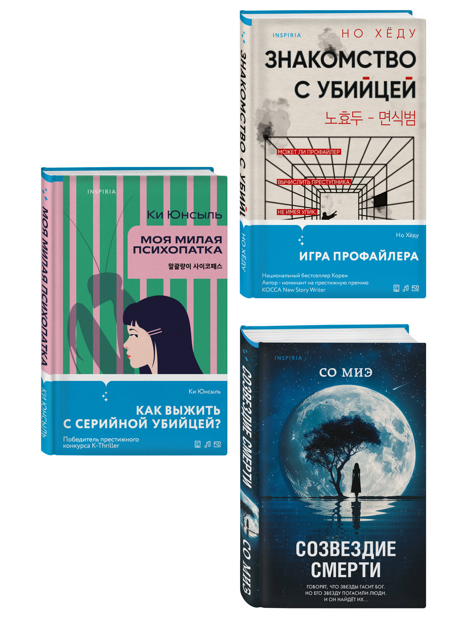 Моя милая психопатка В свои пятнадцать Ёнин полностью утратил всякую надежду на усыновление. Но в один счастливый день его все же забирает из детского дома семья Юнов. Как оказалось, Ёнина выбрали с единственной целью - присматривать за сводной сестрой, чтобы она… никого не убила. Тончжу семнадцать лет. Она мечтает поступить в Сеульский университет, влюбиться в парня и стать поэтессой. Только есть одна проблема, которая может разрушить все ее планы. Она - психопатка, которая абсолютно не понимает, как устроен окружающий мир. И ей до смерти хочется кого-нибудь… убить. Тут - то и приходит на помощь сводный брат. Он должен подготовить ее к поступлению в университет, а заодно предотвратить убийство. И постараться, чтобы Тончжу, эта самка богомола, самопровозглашенная королева преступного мира, не прикончила его самого. Созвездие смерти «Почему наша дочь умерла?» Это было последнее, что Учжин услышал от своей умирающей жены. Она так и не смирилась с жуткой потерей - свела счеты с жизнью прямо на его глазах. Три года назад их дочь убили. Виновных быстро нашли. Три подростка сознались в убийстве и понесли заслуженное наказание, попав за решетку. Так мужчина считал все эти годы… Но после похорон жены Учжин находит в своем кармане подложенную кем-то записку: «Настоящий преступник где-то рядом». Ему больше нечего терять в этой жизни. Он решает любой ценой разыскать истинных убийц своей дочери. И посмотреть им в глаза… Знакомство с убийцей То Кёнсу, успешный и уважаемый криминальный психолог, специализирующийся на профилировании личностей преступников, приходит в себя в странной комнате, похожей на тюремную камеру. Его последнее воспоминание - авария на пустынной горной дороге. Он почувствовал, как его схватили, вкололи какое-то вещество и… темнота. За несколько дней заточения Кёнсу так и не смог понять, кто и зачем держит его в этом месте. Напуганный и растерянный, он пытается составить профили похитителей и вычислить их мотивы. Все меняет неудачный побег, во время которого Кёнсу узнал дом, в котором находился все это время… Когда-то он сам приходил сюда. Но еще страшнее то, что у одного из похитителей оказалось лицо самого Кёнсу…| Издательство | ООО "Издательство "Эксмо" |