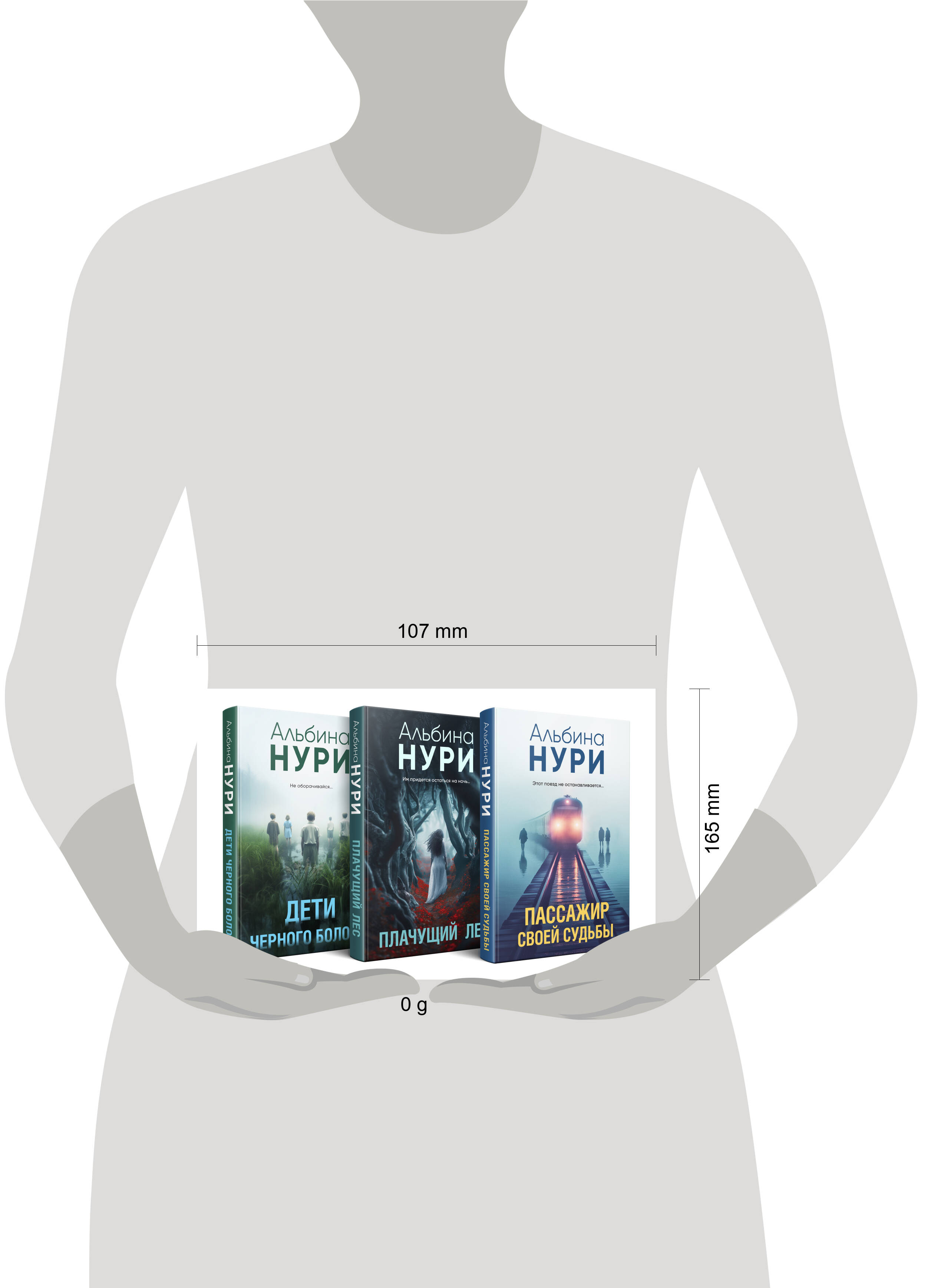 В комплект входят произведения Альбины Нури "Дети черного болота", "Плачущий лес", "Пассажир своей судьбы". "Пассажир своей судьбы" Мать до последнего пыталась отговорить Федора от поездки - у нее было дурное предчувствие. Но парень слишком сильно хотел уехать и начать самостоятельную жизнь, поэтому, конечно, не стал прислушиваться к уговорам. Началось все как обычно: стандартное купе, приятные попутчики. Но с каждым часом поезд пугал Федора все больше: неожиданно сменились соседи, на пути следования не было стоянок, а странный проводник запретил ему покидать купе. В довершение всего Федор узнал, что состав не имеет машиниста и сойти по собственной воле невозможно. У этого поезда нет конечной станции и промежуточных остановок, а неумолимый проводник сам решает, когда и где окончится дорога для каждого пассажира… "Плачущий лес" Кристина и ее жених Игорь путешествовали на своей машине, но сбились с пути - навигатор словно сошел с ума, вдобавок кончился бензин. Пришлось им заехать в небольшой поселок, красивый и уютный, словно сошедший с рекламного плаката. Всего лишь небольшая задержка, но нечто неуловимое тревожило Кристину, не давало покоя, особенно после того, как выяснилось, что им придется остаться здесь на ночь. Она словно чувствовала, что одному из них не суждено покинуть это гостеприимное местечко, окутанное странными тайнами. Ведь недаром здесь живут одни старики, у каждого из которых есть какое-то увечье… "Дети черного болота" Перед вами истории, в которых герои сталкиваются с жуткими, необъяснимыми с точки зрения обычной логики вещами. Они попадают в кошмарные ситуации и обнаруживают себя в центре зловещих событий. Границы реального и потустороннего миров оказываются зыбкими и размытыми. Существа, обитающие на той стороне, готовы ворваться в привычную жизнь, пугая, сводя с ума, уничтожая тех, кому не повезло оказаться на их пути…| Издательство | ООО "Издательство "Эксмо" |