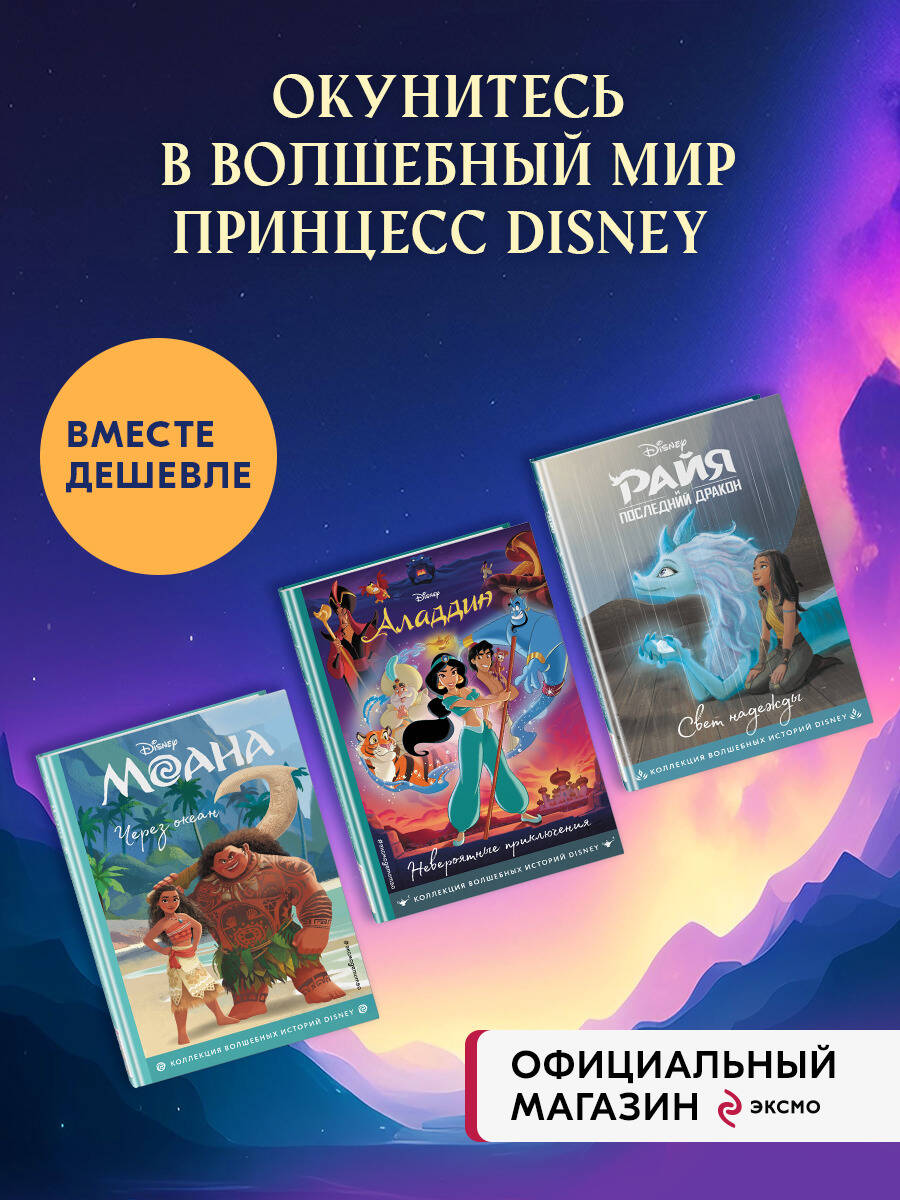 Комплект их 3-х книг по мотивам известных мультфильмов от студии Disney: «Райя и последний дракон. Свет надежды. Книга для чтения с цветными картинками», «Книга джунглей. История Маугли. Книга для чтения с цветными картинками» и «Аладдин. Невероятные приключения. Книга для чтения с цветными картинками». Откройте волшебный мир Disney вместе с серией чудесных историй от всемирно известной анимационной студии! Когда тьма опускается на землю, она отвоевывает не только могущественные королевства, но и поселяется в сердцах людей. Разобщение и недоверие привели к разделению некогда великого королевства Кумандра. История гласит, что драконы спасли человечество, отразив зло. Они изгнали его, но семя зла и по сей день теплится в сердцах враждующих кланов. Сможет ли последний дракон вселить надежду и помочь восстановить мир? Отправляйтесь вместе с отважной и недоверчивой Райей и очаровательным Тук-Туком в путешествие! Моана - юная дочь вождя племени Мотунуи. Она ни разу не покидала родную деревню. Но когда тьма начинает распространяться от острова к острову, уничтожая всё живое, океан делает свой выбор! Теперь Моане предстоит отправиться за риф, объединиться с многоликим полубогом Мауи и восстановить гармонию природы. Когда уличный бродяга Аладдин встретился с принцессой Жасмин, они полюбили друг друга с первого взгляда, но у коварного чародея Джафара были на их счёт другие планы. Освободив джинна из волшебной лампы, Аладдин обрёл невероятное могущество... Сможет ли юноша остаться верным самому себе?