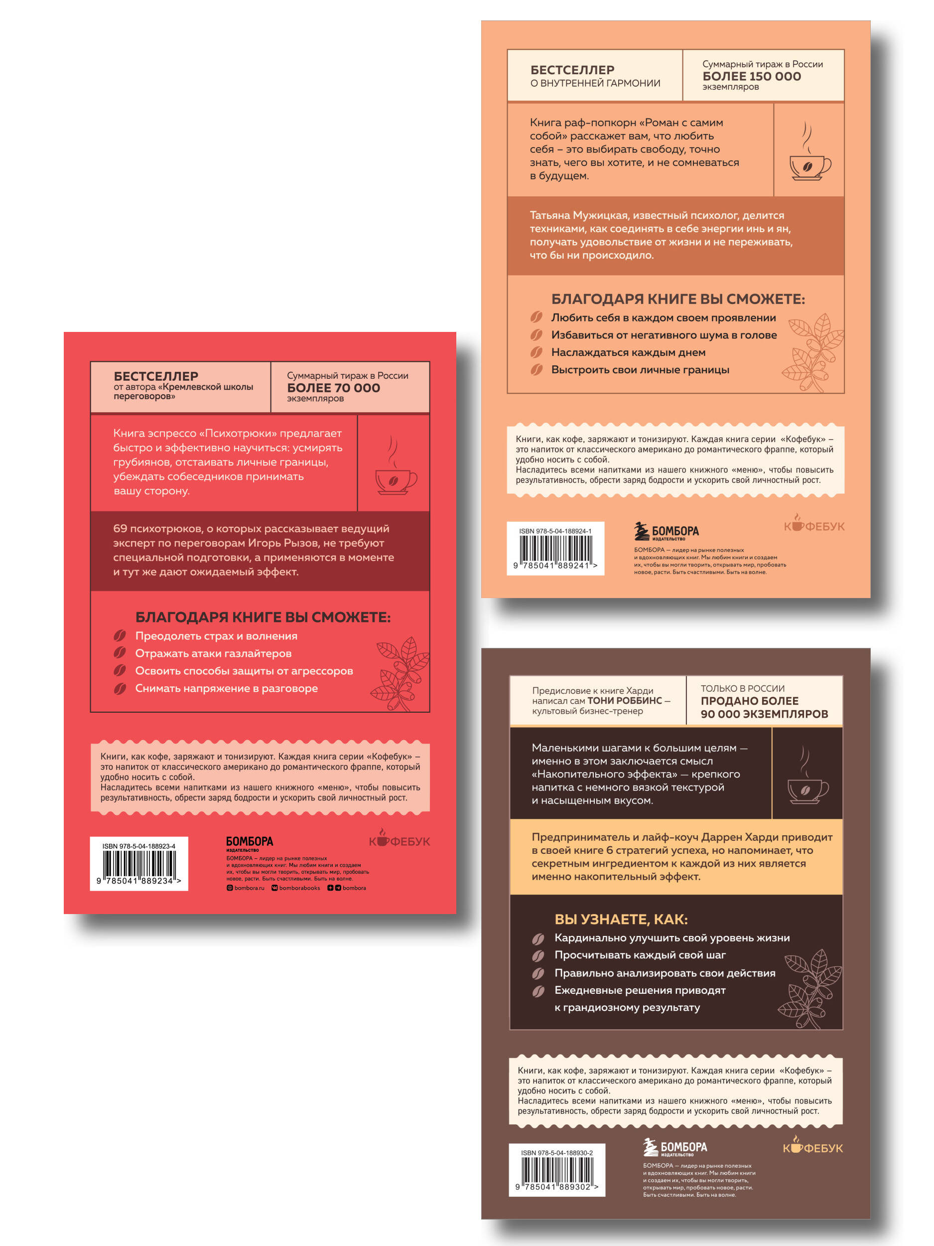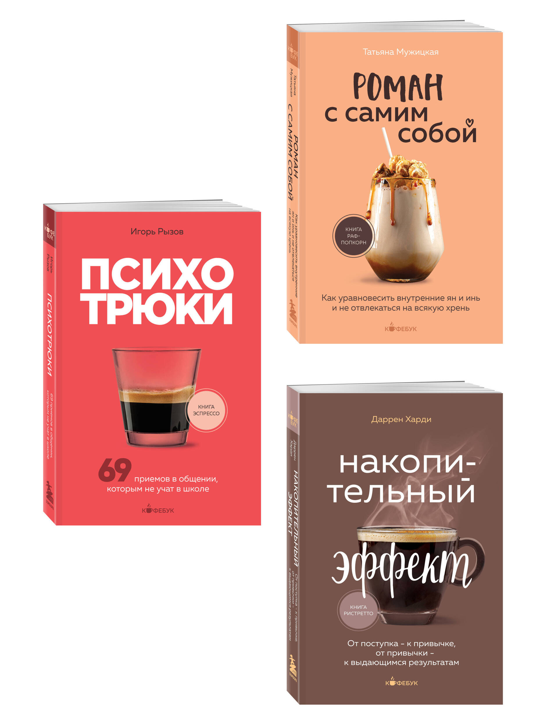 Комплект состоит из 3-х книг серии Кофебук, дополнен удобным шоппером "Психотрюки. 69 приемов в общении, которым не учат в школе" Психотрюки - это простые приемы, которые помогают поставить хама на место, защитить личные границы, выиграть в споре, договориться о выгодных условиях сделки или убедить себя не сдаваться на пути к цели. Не важно, какой у вас опыт самоконтроля и переговоров, прелесть психотрюков в том, что они работают в любом случае и требуют минимум тренировки. Автор этой книги - Игорь Рызов - ведущий эксперт по переговорам, автор четырех бестселлеров, дважды победитель премии "Деловая книга года". Он предлагает 69 психотрюков для: • эффективной реакции на бестактные замечания; • защиты от психологических агрессоров; • победы над газлайтером; • успешного убеждения оппонента; • преодоления страха и волнения; • настройки себя на сверхдостижения. "Роман с самим собой. Как уравновесить внутренние ян и инь и не отвлекаться на всякую хрень" Книга раф-попкорн "Роман с самим собой" расскажет вам, что любить себя - это выбирать свободу, точно знать, чего вы хотите, и не сомневаться в будущем. Татьяна Мужицкая, известный психолог, делится техниками, как соединять в себе энергии инь и ян, получать удовольствие от жизни и не переживать, что бы ни происходило. "Накопительный эффект. От поступка - к привычке, от привычки - к выдающимся результатам" "Накопительный эффект" - легендарная книга, которую на Западе давно окрестили "библией по саморазвитию" и "лабораторией по изу чению успеха". Впервые издается на русском языке. Признана бестселлером таких престижных книжных рейтингов, как The New York Times и Wall Street Journal. Маленькими шагами к большим целям - именно в этом заключается смысл накопительного эффекта. Сформулировал его миллионер, предприниматель и лайф-коуч Даррен Харди. Свой первый миллион он заработал в 24 года, а в 27 его компания имела оборот в 50 миллионов долларов. В книге автор приводит 6 стратегий успеха, но напоминает, что секретным ингредиентом к каждой из них является именно накопительный эффект.| Издательство | ООО "Издательство "Эксмо" |