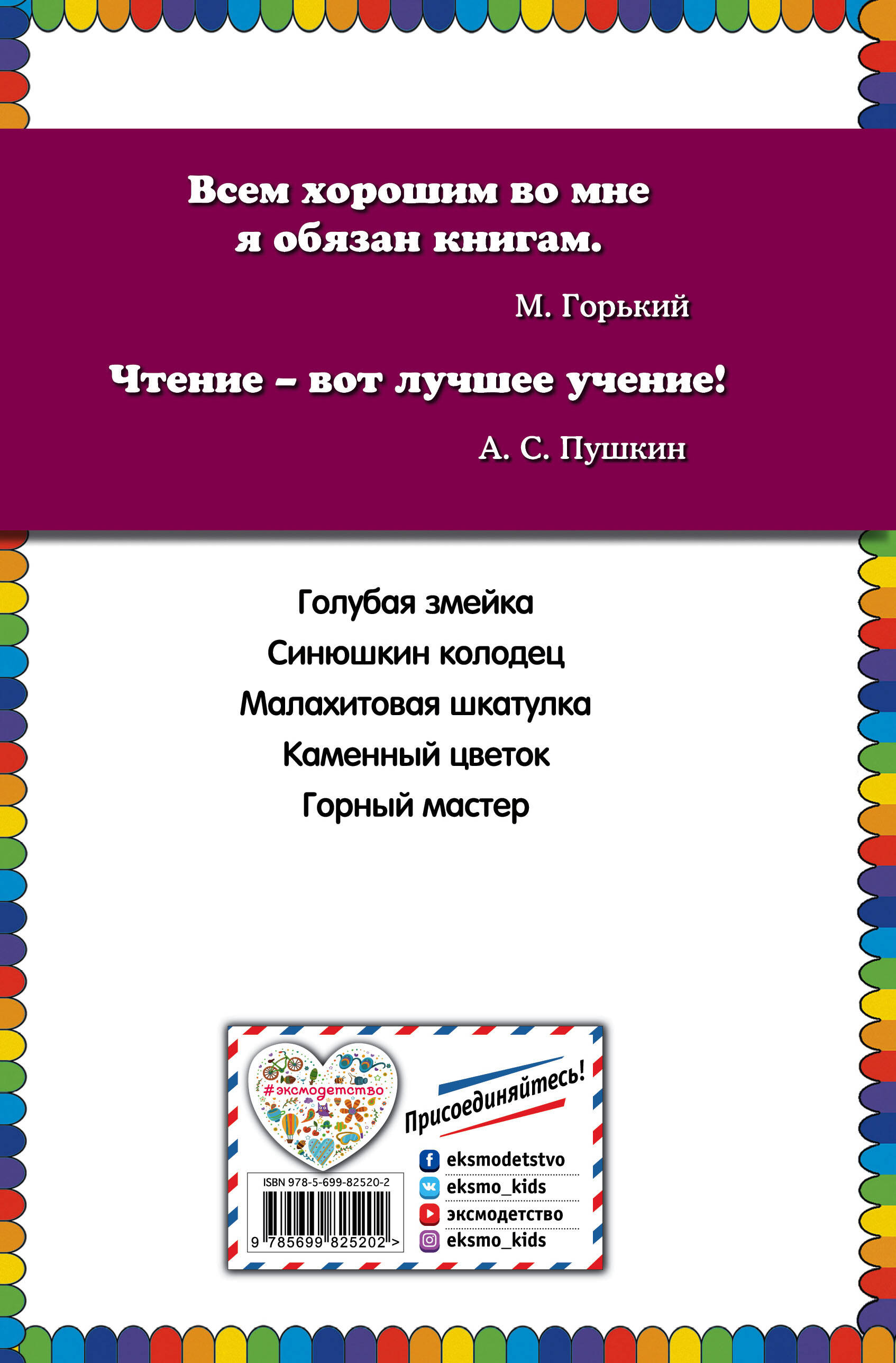 В комплект вошли 3 книги: «Малахитовая шкатулка. Сказы», «Серебряное копытце. Сказы» Павла Бажова и «Стрекоза и Муравей. Басни» Ивана Крылова. Сказы Павла Бажова распахнут двери в мир уральских поверий о Хозяйке Медной горы, бабке Синюшке и загадочном каменном цветке. Их приятно дополнят иллюстрации Максима Митрофанова. Басни Ивана Крылова научат детей различать хорошие и добрые поступки, увлекут интересными героями-зверями, а иллюстрации Ирины Петелиной порадуют красочностью и остроумием. Благодаря удобному формату, книги подходят для самостоятельного чтения как дома, так и на улице.| Издательство | ООО "Издательство "Эксмо" |