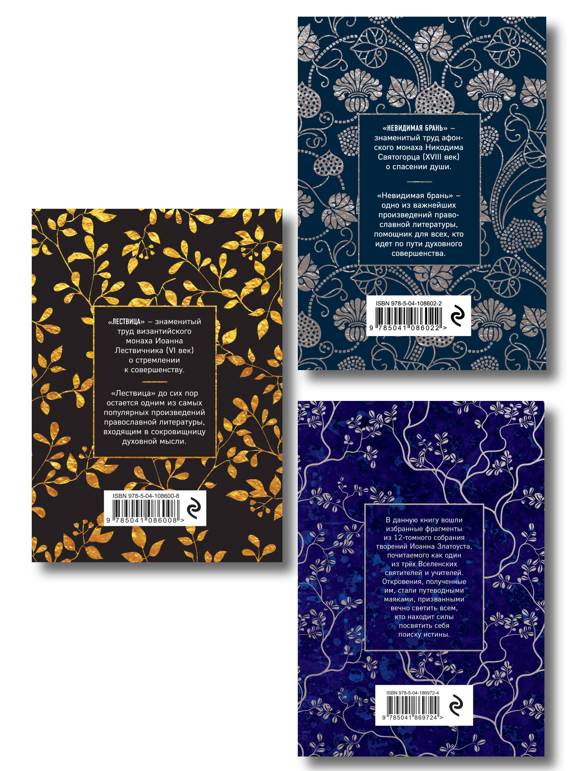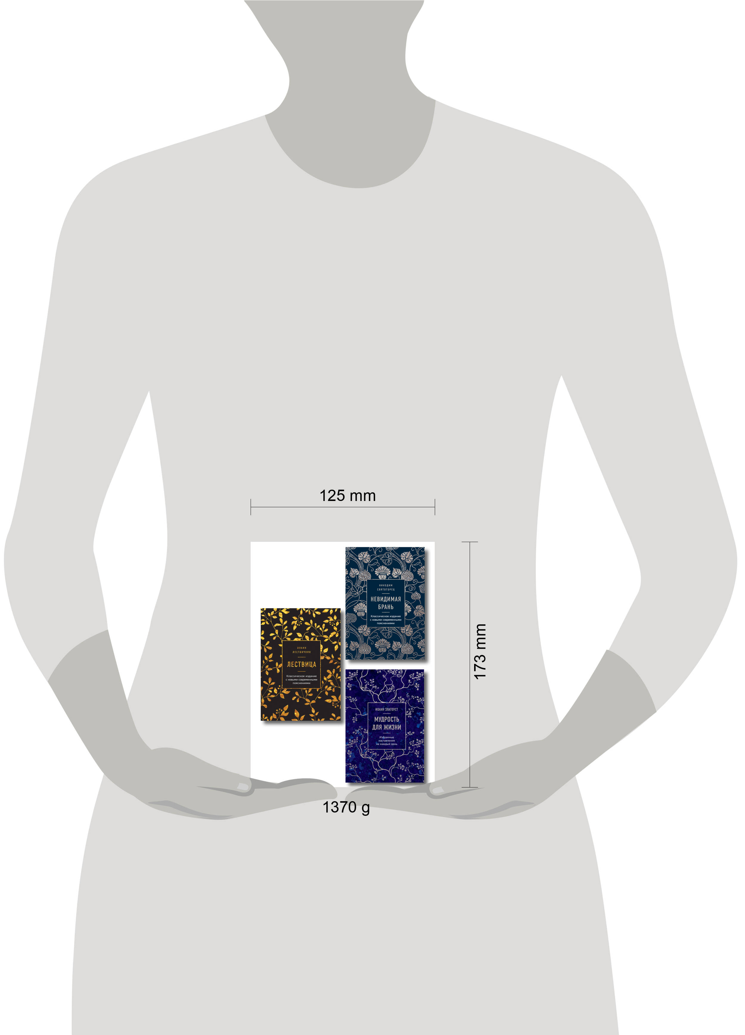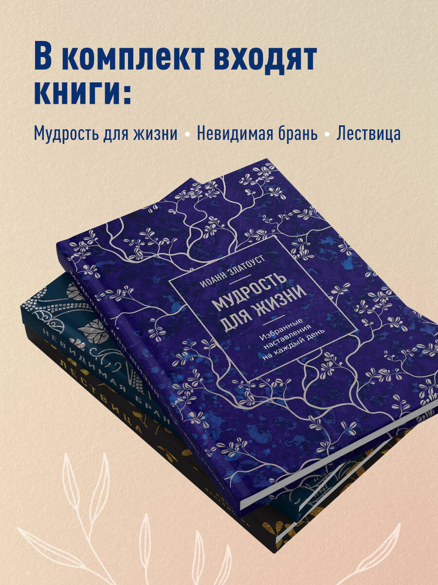 Комплект из 3-х книг: «Лествица» - сокровище православной аскетической литературы. Оно было создано в VI веке преподобным Иоанном Лествичником, игуменом Синайского монастыря. Она состоит из 30 глав - ступеней, по которым христианину следует восходить по пути к Богу. В каждой главе прп. Иоанн повествует о законах духовной жизни, причинах и следствиях грехов и страстей, о том, как с ними бороться и как стяжать добродетели. По сей день «Лествица» признается важнейшим руководством для духовной жизни не только для монахов, но и для всех мирян. Для этого издания впервые была проделана работа по составлению специального дополнения к классическому тексту. В каждой главе вы найдете краткие пояснения и тезисы, призванные облегчить чтение, изучение и запоминание. Они помогут начинающим в вере, станут стимулом для дальнейших размышлений и придадут читателю крепости на духовном пути. Издание рекомендовано к публикации Издательским советом Русской Православной Церкви. Номер ИС Р20-008-3178. «Невидимая брань» - сокровище православной аскетической литературы. Она была создана в XVIII веке афонским монахом Никодимом Святогорцем. По сей день «Невидимая брань» признается важнейшим руководством для духовной жизни не только для монахов, но и для всех мирян. Для этого издания впервые была проделана работа по составлению специального дополнения к классическому тексту. В каждой главе вы найдете краткие пояснения и тезисы, призванные облегчить чтение, изучение и запоминание. Они помогут начинающим в вере, станут стимулом для дальнейших размышлений и придадут читателю крепости на духовном пути. Издание рекомендовано к публикации Издательским советом Русской Православной Церкви. Номер ИС Р20-024-3311. "Мудрость для жизни" - сборник избранных фрагментов трудов Иоанна Златоуста, одного из трёх Вселенских святителей и учителей, представляет собой ценное сокровище духовной мудрости. В этой книге откровения Златоуста становятся светоносными путеводными маяками для всех искателей истины. Великий проповедник и мыслитель помогает читателям открыть глубины своей души. его труды призывают нас сосредоточиться на вечных ценностях и развивать духовный рост. В этом сборнике каждое слово проникнуто мудростью и любовью, исходящими от души, он станет незаменимым руководством для всех, кто стремится к духовному совершенству.| Издательство | ООО "Издательство "Эксмо" |