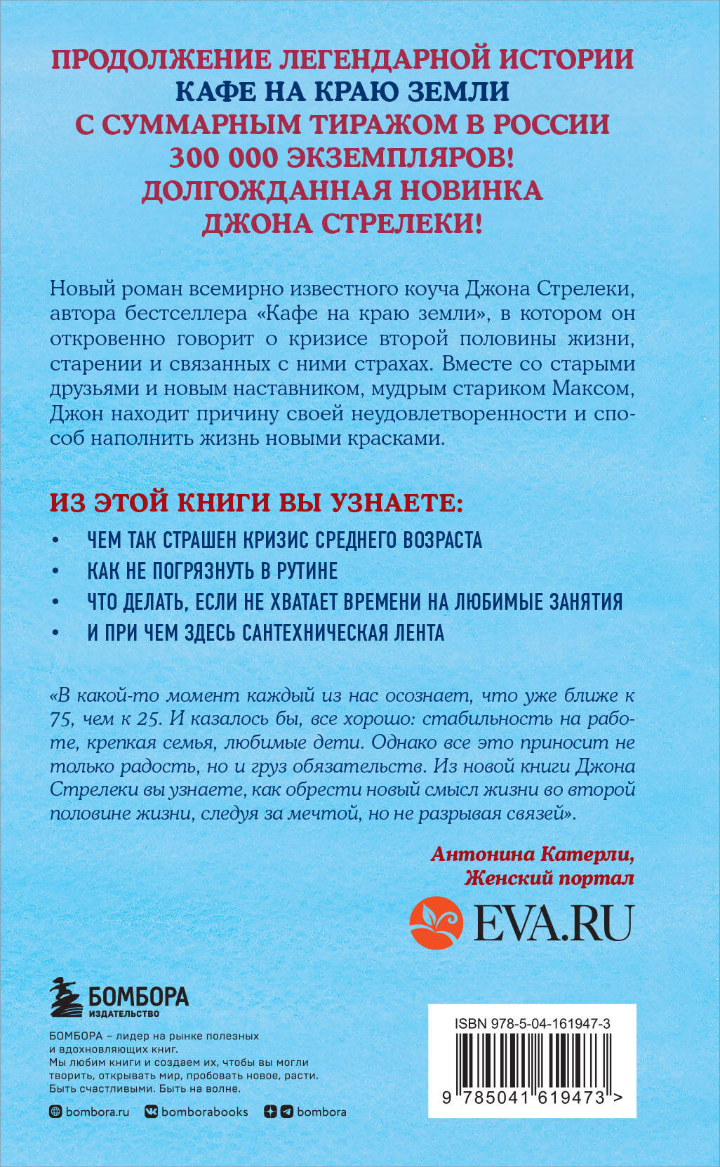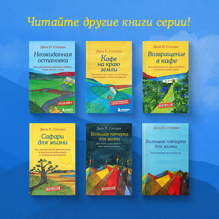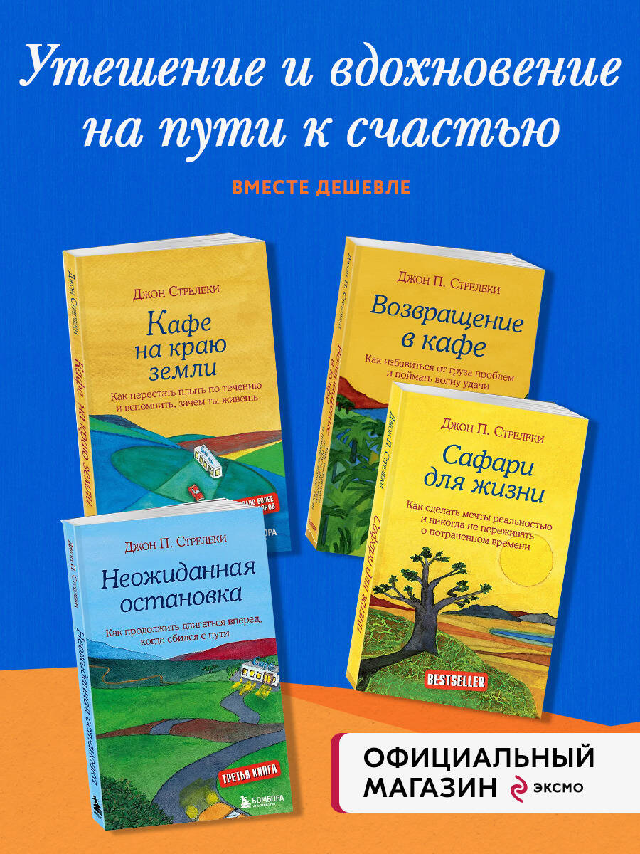 В комплект вошло 4 книги. 1) «Кафе на краю земли. Как перестать плыть по течению и вспомнить, зачем ты живешь» Эта книга превратила бизнес-консультанта Джона П. Стрелеки в знаменитого писателя и вдохновляющего коуча. Она издана миллионными тиражами и переведена на 30 языков. Каждый из нас время от времени задает себе вопросы: «Кто я?», «Куда я иду?», «Счастлив ли я?». Но найти ответы и следовать своему собственному пути не так-то просто. Главный герой этой книги Джон едва ли пытался осмыслить свою жизнь до того момента, как случайно оказался в загадочном кафе «Почему». Одна ночь в этом месте на краю земли заставила его задуматься о себе и осознать, что в жизни для него действительно важно и ценно. Удивительная и вдохновляющая история о том, как избавиться от мимолетной суеты современного мира, отбросить страхи и сомнения и открыться для счастливых перемен. 2) «Сафари для жизни. Как сделать мечты реальностью и никогда не переживать о потраченном времени» У каждого из нас есть своя Большая Пятерка - заветные мечты, воплощение которых будет означать, что наша жизнь удалась, причем именно в том смысле, в котором мы сами определяем. Порой их сложно определить, но это не значит, что нужно останавливаться и опускать руки. Следует просто начинать двигаться в ту сторону, которая вроде бы кажется желанной, как сделал это Джек, отправившийся в Африку в поисках счастья. Он давно хотел увидеть континент, но не мог и вообразить тех событий и чувств, которые захлестнут его в путешествии. 3) «Неожиданная остановка. Как продолжить двигаться вперед, когда сбился с пути» Продолжение истории о встречах в удивительном кафе на краю земли от всемирно известного коуча Джона Стрелеки. Потеря близкого человека всегда заставляет задуматься о прошлом и о собственных прожитых годах. Возвращаясь с похорон любимого дяди, Джон попадает в грозу и находит спасение в необычном кафе, где ему предстоит ответить на вопрос: «Почему вы здесь?». На этот раз ему особенно трудно дать ответ, ведь, казалось бы, все у него в жизни хорошо: Джон осуществил свои мечты, счастлив в браке, любит жену и ребенка. И все же - почему он здесь? Благодаря старым друзьям и мудрому старику сантехнику Максу Джон находит причину своей неудовлетворенности и узнает, как наполнить жизнь новыми красками. Философские беседы героев дают повод по-новому взглянуть на собственную жизнь, осознать ход времени и принять то, что все мы однажды окажемся ближе к 75, чем к 25. Это - не беда и не приговор, а возможность пересмотреть старые взгляды. 4) «Возвращение в кафе. Как избавиться от груза проблем и поймать волну удачи» Если суета повседневной жизни угнетает, если вы не знаете, как освободиться от груза проблем, если тяжело на душе, пора все поменять! Продолжение бестселлера «Кафе на краю земли» от всемирно известного коуча Джона Стрелеки об истинной ценности жизни и свободе. Спустя десять лет главный герой Джон возвращается в загадочное кафе, перевернувшее его судьбу, чтобы снова вспомнить о том, что действительно важно, и научить этому других. Занимательная история пути к себе в форме притч и неторопливых философских бесед, ненавязчиво поданные серьезные вопросы заставят вас переосмыслить представление о счастье и по-новому посмотреть на свою жизнь. Достаточно просто заглянуть в кафе «Почему»!| Издательство | ООО "И