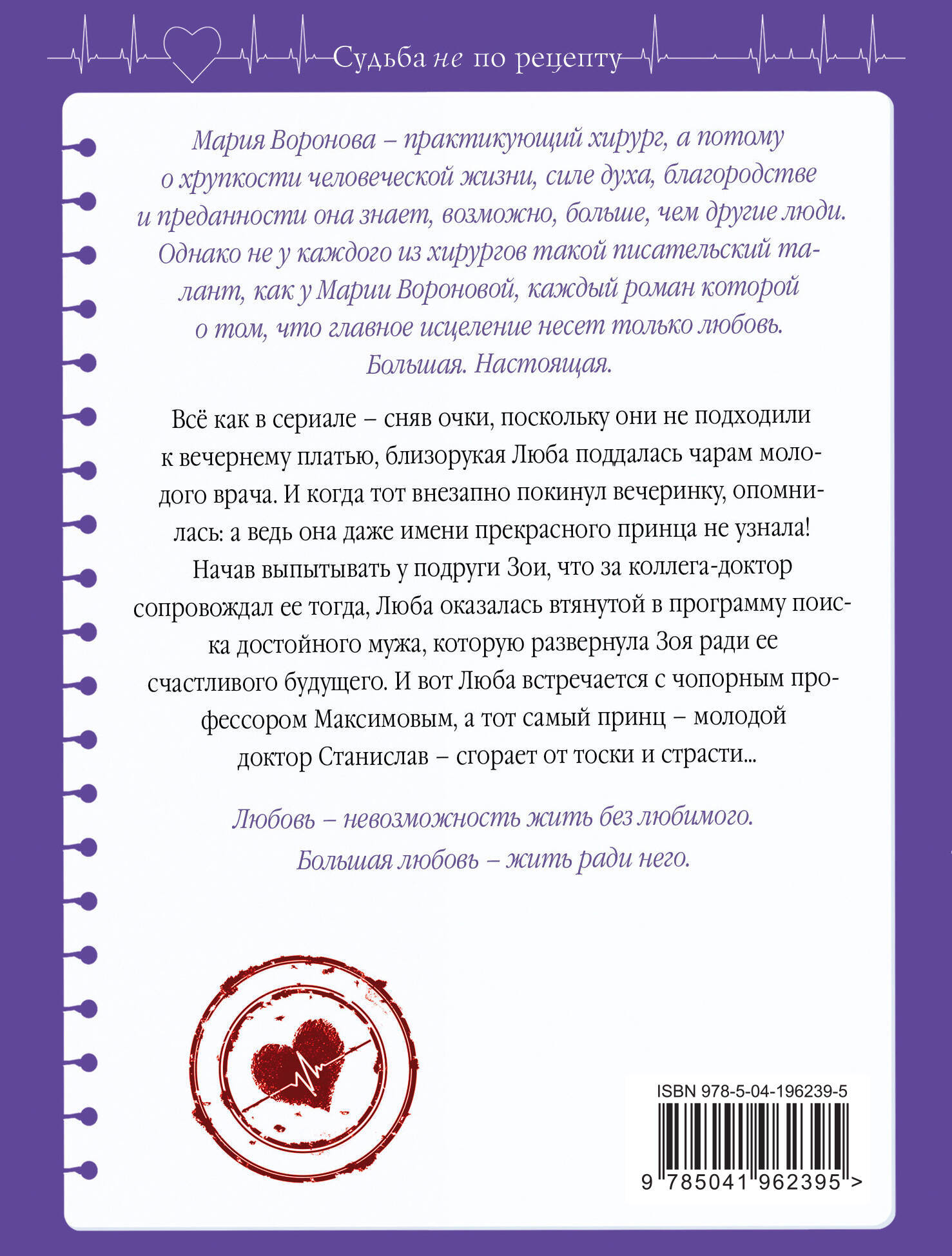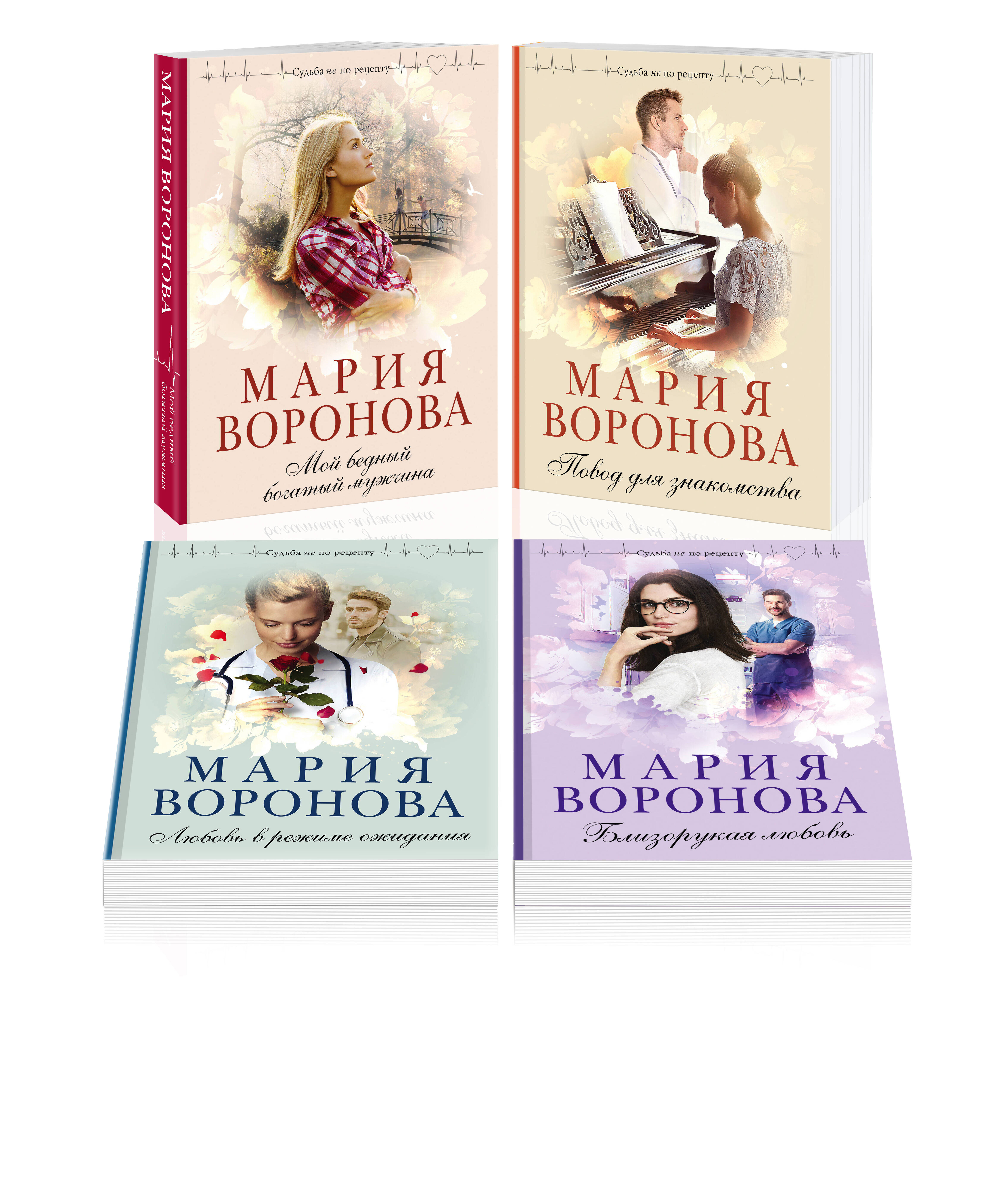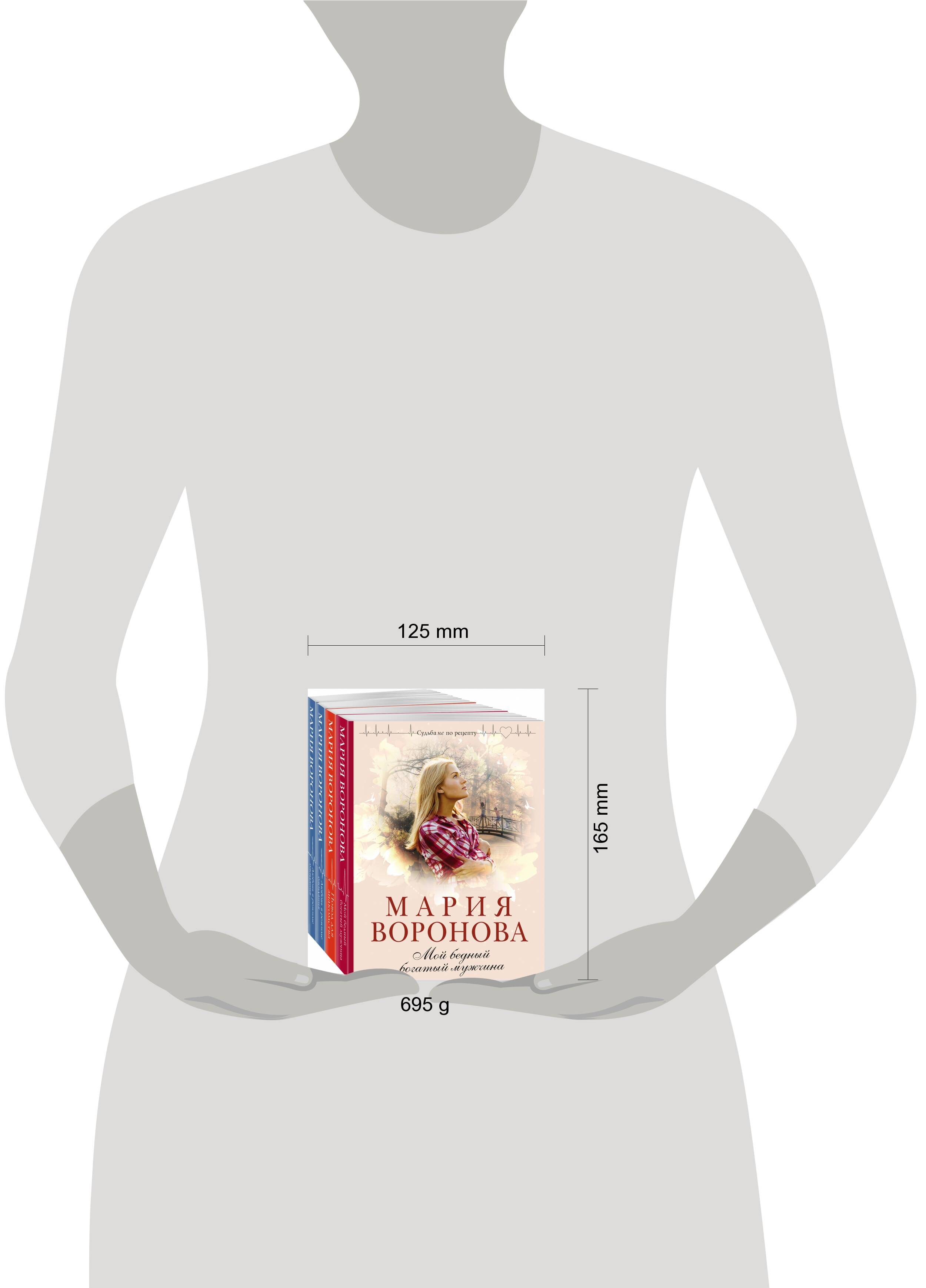 Комплект из 4-х книг: «Мой бедный богатый мужчина» + «Повод для знакомства» + «Любовь в режиме ожидания» + «Близорукая любовь» «Мой бедный богатый мужчина » Брак по расчету - в чем его плюсы и минусы для героев романа Марии Вороновой? Медицинская сестра избавляется от бедности, а владелец модной клиники пластической хирургии - от одиночества. Но Диана не чувствует себя хозяйкой большого дома, а Розенберг не видит в ней близкого друга и продолжает тосковать по умершей первой жене. Значит, счастливый брак без любви невозможен в принципе? Ни Диана, ни ее муж не знают ответа на этот вопрос. А жизнь уже приготовила для них тяжелые испытания, которые можно выдержать только вместе. Вот тогда и выяснится, оправдался ли расчет. «Повод для знакомства» Эти мужчина и женщина из разных миров. Он - талантливый хирург, отвергнутый медицинской «элитой» из-за нежелания участвовать в аферах с оборудованием. Она - утонченная преподавательница музыки. Но однажды их пути пересекутся. Профессору Колдунову предстоит оперировать больную, а Кате - ухаживать за ней. Сможет ли Катя, прежде далекая от реальности, справиться с испытаниями, которые ждут ее в настоящей жизни? Станет ли она счастливой, услышав от мужчины слова, о которых так долго мечтала?.. «Любовь в режиме ожидания» Врач-реаниматолог Лада со студенческой скамьи влюблена в Валентина Сумарокова, но он, ныне успешный бизнесмен, словно бы не замечает ее чувства. После смерти жены он один воспитывает дочь Аню. Лада - его верный друг и помощник, но и только… Аня заканчивает школу, и Лада замечает, что Сумароков заглядывается на подругу дочери - умницу и красавицу Катю. А за Ладой ухаживает Олег, водитель Сумарокова. Найдет ли она в себе силы отказаться от «любви в режиме ожидания» и начать новую жизнь с влюбленным в нее мужчиной? «Близорукая любовь» Всё как в сериале - сняв очки, поскольку они не подходили к вечернему платью, близорукая Люба поддалась чарам молодого врача. И когда тот внезапно покинул вечеринку, опомнилась - а ведь она даже имени прекрасного принца не узнала! Начав выпытывать у подруги Зои, что за коллега-доктор сопровождал ее тогда, Люба оказалась втянутой в программу поиска достойного мужа, которую развернула Зоя ради ее счастливого будущего. И вот Люба встречается с чопорным профессором Максимовым, а тот самый принц - молодой доктор Станислав - сгорает от тоски и страсти…| Издательство | ООО "Издательство "Эксмо" |