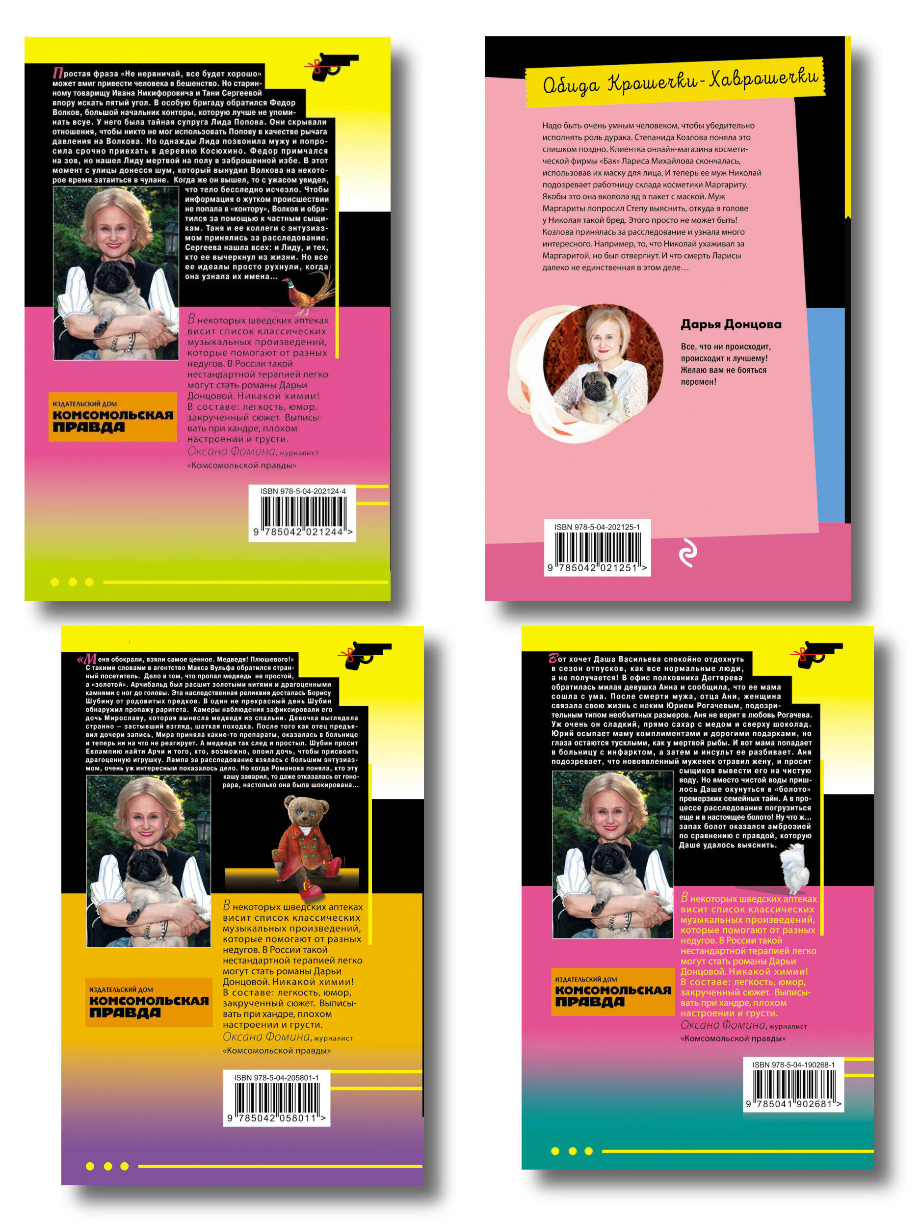 «Кукушонок из семьи дровосеков» Простая фраза: «Не нервничай, все будет хорошо» - может вмиг привести человека в бешенство. Но старинному товарищу Ивана Никифоровича и Тани Сергеевой впору искать пятый угол. В особую бригаду обратился Федор Волков, большой начальник конторы, которую лучше не упоминать всуе. У него была тайная супруга Лида Попова. Они скрывали отношения, чтобы никто не мог использовать Попову в качестве рычага давления на Волкова. Но однажды Лида позвонила мужу и попросила срочно приехать в деревню Косюхино. Федор примчался на зов, но нашел Лиду мертвой на полу в заброшенной избе. В этот момент с улицы донесся шум, который вынудил Волкова на некоторое время затаиться в чулане. Когда же он вышел, то с ужасом увидел, что тело бесследно исчезло. Чтобы информация о жутком происшествии попала в «контору», Волков и обратился за помощью к частным сыщикам. Таня и ее коллеги с энтузиазмом принялись за расследование. Сергеева нашла всех: и Лиду, и тех, кто ее вычеркнул из жизни. Но все ее идеалы просто рухнули, когда она узнала их имена… Дарья Донцова - самый популярный и востребованный автор в нашей стране, любимица миллионов читателей. В России продано более 200 миллионов экземпляров ее книг. Ее творчество наполняет сердца и души светом, оптимизмом, радостью, уверенностью в завтрашнем дне! «Донцова невероятная работяга! Я не знаю ни одного другого писателя, который столько работал бы. Я отношусь к ней с уважением, как к образцу писательского трудолюбия. Женщины нуждаются в психологической поддержке и получают ее от Донцовой. Я и сама в свое время прочла несколько романов Донцовой. Ее читают очень разные люди. И очень занятые бизнес-леди, чтобы на время выключить голову, и домохозяйки, у которых есть перерыв 15-20 минут между отвести-забрать детей». - Галина Юзефович, литературный критик «Обида Крошечки-Хаврошечки» Надо быть очень умным человеком, чтобы убедительно исполнять роль дурака. Степанида Козлова поняла это слишком поздно. Клиентка онлайн-магазина косметической фирмы «Бак» Лариса Михайлова скончалась, использовав их маску для лица. И теперь ее муж Николай подозревает работницу склада косметики Маргариту. Якобы это она вколола яд в пакет с маской. Муж Маргариты попросил Степу выяснить, откуда в голове у Николая такой бред. Этого просто не может быть! Козлова принялась за расследование и узнала много интересного. Например, то, что Николай ухаживал за Маргаритой, но был отвергнут. И что смерть Ларисы далеко не единственная в этом деле… Дарья Донцова - самый популярный и востребованный автор в нашей стране, любимица миллионов читателей. В России продано более 200 миллионов экземпляров ее книг. Ее творчество наполняет сердца и души светом, оптимизмом, радостью, уверенностью в завтрашнем дне! «Донцова невероятная работяга! Я не знаю ни одного другого писателя, который столько работал бы. Я отношусь к ней с уважением, как к образцу писательского трудолюбия. Женщины нуждаются в психологической поддержке и получают ее от Донцовой. Я и сама в свое время прочла несколько романов Донцовой. Ее читают очень разные люди. И очень занятые бизнес-леди, чтобы на время выключить голову, и домохозяйки, у которых есть перерыв 15-20 минут между отвести-забрать детей». - Галина Юзефович, литературный критик «Слон для Дюймовочки» 69-я книга из цикл