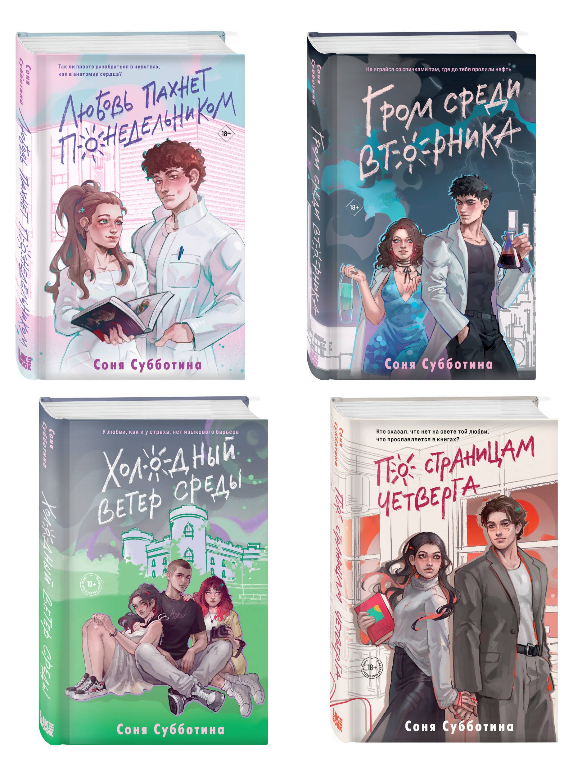 ЧЕТЫРЕ КНИГИ ИЗ СЕРИИ «ДНИ ЛЮБВИ» СОНИ СУББОТИНОЙ В ОДНОМ КОМПЛЕКТЕ! «Любовь пахнет понедельником», «Гром среди вторника», «Холодный ветер среды», «По страницам четверга». Студенты, любовь, жизненные ситуации, драма и стекло в современном российском сеттинге. Человеку свойственно ошибаться и оступаться, главное, чтобы рядом оказался кто-то, кто сможет протянуть руку помощи и не станет смеяться над падением. «Любовь пахнет понедельником» Ева обещала лучшей подруге, что «как в тот раз» точно не будет, но вот ее прижимает к стенке туалета клуба какой-то незнакомец, и не сказать, что она сильно-то и против. А сутками позже, когда она превращается из ярой тусовщицы в прилежную студентку медицинского, оказывается, что тот парень из клуба - ее новый преподаватель по биохимии. И, судя по всему, он ее узнал, о чем говорят его недвусмысленные намеки. Домашки, контрольные, автоматы, отработки, олимпиады. Как все успеть? Еве теперь точно не до каких-то парней. И тем более не до отношений. Но что делать, если не покидает чувство, что кто-то преследует тебя? «Гром среди вторника» Кто бы мог подумать, что небольшая интрижка Ильи Громова со старостой перерастет во что-то более серьезное. И никто точно не мог предположить, что в момент, когда он готовится сделать самый важный в их отношениях шаг и ничего не предвещает беды, он застукает ее в постели с их одногруппником. Илья понимает, что жизнь не стоит на месте, но никак не может отпустить призраков своих отношений. Друзья вытаскивают его развеяться на вечеринку, где он знакомится с Верой, которая исчезает из его жизни так же стремительно, как и появляется в ней. И теперь все его мысли заполнены той девушкой из клуба. Но как найти свою любовь, когда все кругом твердят, что ты сходишь с ума и никакой Веры на самом деле там не было?.. «Холодный ветер среды» Что может быть лучше месяца в языковой школе вдали от родителей? Да и не где-нибудь, а в Ирландии! Последний год перед 11 классом обещает быть по-настоящему незабываемым! Настя, вырвавшаяся из-под гнета гиперопекающих родителей, собирается нарушить как можно больше школьных правил и не оказаться при этом депортированной. Ира надеется, что занятия английским не будут сильно мешать ее подготовке к ЕГЭ по химии и биологии. Максиму, как самому рассудительному, взрослые тайно поручают присматривать за девочками, чтобы они не чудили и не нажили себе проблем. Вдали от родины и семьи легко почувствовать себя взрослым и решить, что тебе можно все. Только вот ветер в Ирландии пронизывает до костей, рушит планы, испытывает дружбу на прочность и приносит перемены. Смогут ли друзья устоять перед властью стихии? «По страницам четверга» Первый раз в первый класс, а может, второй раз на второй курс? Катя предпринимает еще одну попытку закончить ненавистный ей медицинский институт. Будь ее воля, ни за что бы не вернулась туда, но у родителей и судьбы другие планы. Теперь ее жизнь сплошной водоворот из учебы, работы, помощи маме с маленьким ребенком и ведения книжного блога. С таким расписанием не всегда есть время, чтобы просто сделать глоток воздуха. И единственное, что она теперь хочет - сбежать из дома и отчислиться. Как некстати рядом появляется Данил, сын владельца ресторана, в котором она работает. После того, что с ней случилось, Катя решила, что будет держаться подальше от м