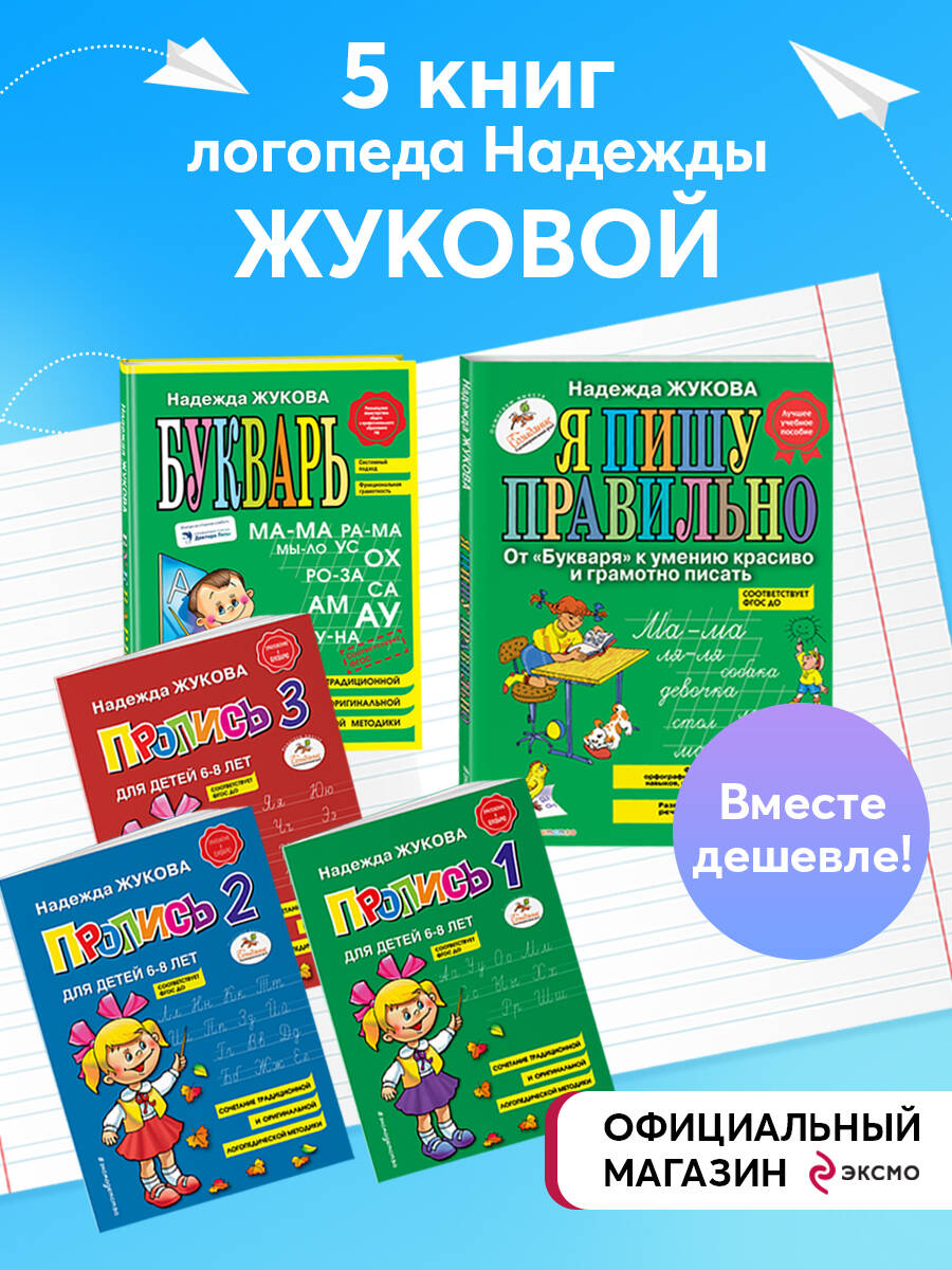 Комплект «Читаем и пишем буквы» - это набор главных обучающих пособий Надежды Жуковой. Всё самое необходимое для комплексного пошагового обучения детей чтению и письму! 5 наиболее эффективных книг для отличных результатов! Состав комплекта: - «Букварь» Надежды Жуковой - классическое учебное пособие. Более 10 лет «Букварь» входит в ТОП-100 розничных продаж. Авторская методика известного логопеда-педагога заключается в изучении слогов, а не отдельно взятых букв. Это позволяет ребёнку быстро научиться читать и легко перейти к письму. - «Я пишу правильно. От "Букваря" к умению красиво и грамотно писать» - пособие, составленное в соответствии с учебниками русского языка для первоклассников. Издание поможет ребёнку перейти от печатных букв к прописным. Богатый материал на развитие связной устной речи, повышение грамотности и развитие мелкой моторики поможет подготовить дошкольника к полноценному обучению грамоте в первом классе. - Комплект из трёх прописей, разработанных Надеждой Жуковой, поможет развить навыки письма даже тем детям, у которых оно вызывает затруднения. Обучающий материал оптимально и равномерно разделен на три пособия для эффективной и последовательной работы, расположен в порядке увеличения сложности. Формат прописей приближен к формату стандартных школьных тетрадей. Надежда Жукова - один из наиболее известных и авторитетных авторов детской обучающей литературы. Ее пособия доказали свою эффективность. Более 15 000 000 детей научились читать и писать по методике Надежды Жуковой.| Издательство | ООО "Издательство "Эксмо" |