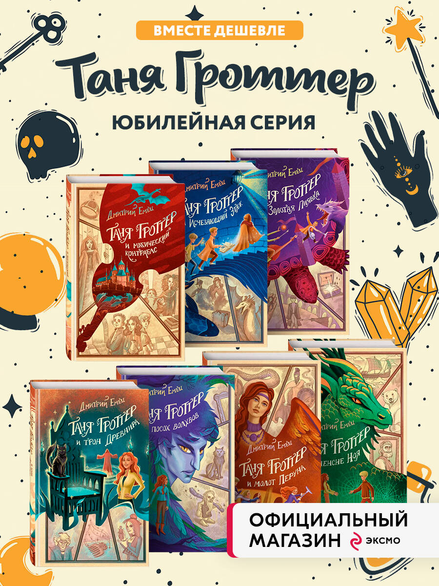 Комплект из 7 книг: 1. «Таня Гроттер и магический контрабас» 2. «Таня Гроттер и Исчезающий Этаж» 3. «Таня Гроттер и Золотая Пиявка» 4. «Таня Гроттер и трон Древнира» 5. «Таня Гроттер и посох волхвов» 6. «Таня Гроттер и молот Перуна» 7. «Таня Гроттер и пенсне Ноя» Переиздание к юбилею легендарной серии «Таня Гроттер»! 20 лет на российском рынке! Дмитрий Емец - один из самых известных отечественных авторов для детей. Суммарный тираж его книг превысил 5 миллионов экземпляров. У автора своя активная армия поклонников во всех уголках России. Встречи с автором всегда проходят с аншлагами. Серия «Таня Гроттер», едва появившись на рынке, завоевала сердца огромного количества читателей, с ней многие подростки полюбили мир книг. Потрясающее оформление! Все 14 книг серии, составленные корешками вместе, образуют картинку с изображением магической школы. ЦА: 12-14 лет.