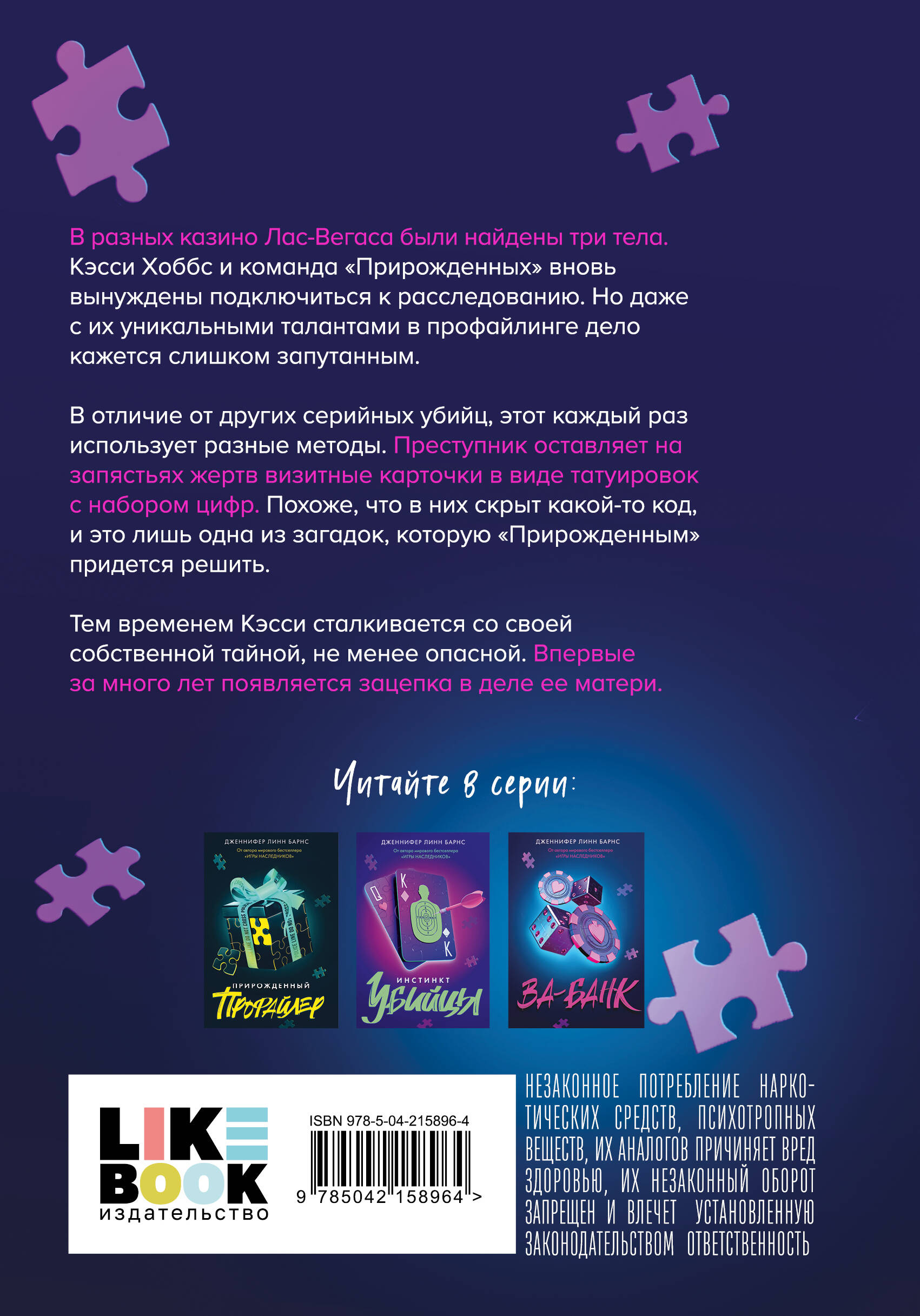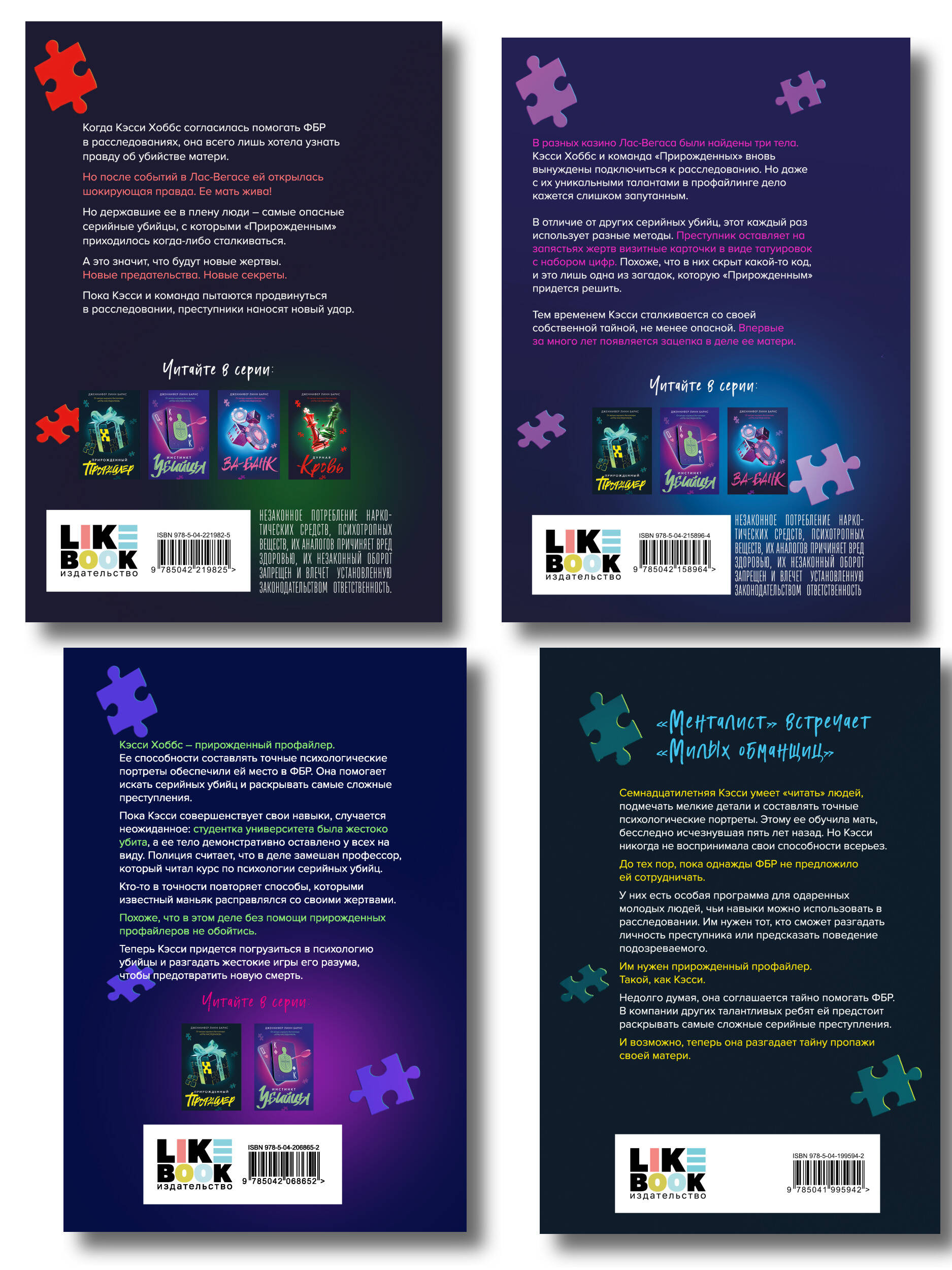 "Дурная кровь (Прирожденные #4)": Когда Кэсси Хоббс согласилась помогать ФБР в расследованиях, она всего лишь хотела узнать правду об убийстве матери. Но после событий в Лас-Вегасе ей открылась шокирующая правда. Ее мать жива! Но державшие ее в плену люди - самые опасные серийные убийцы, с которыми "Прирожденным" приходилось когда-либо сталкиваться. А это значит, что будут новые жертвы. Новые предательства. Новые секреты. Пока Кэсси и команда пытаются продвинуться в расследовании, преступники наносят новый удар. "Прирожденный профайлер (Прирожденные #1)": Семнадцатилетняя Кэсси умеет "читать" людей, подмечать мелкие детали и составлять точные психологические портреты. Этому ее обучила мать, бесследно исчезнувшая пять лет назад. Но Кэсси никогда не воспринимала свои способности всерьез. До тех пор, пока однажды ФБР не предложило ей сотрудничать. У них есть особая программа для одаренных молодых людей, чьи навыки можно использовать в расследовании. Им нужен тот, кто сможет разгадать личность преступника или предсказать поведение подозреваемого. Им нужен прирожденный профайлер. Такой, как Кэсси. Недолго думая, она соглашается тайно помогать ФБР. В компании других талантливых ребят ей предстоит раскрывать самые сложные серийные преступления. И возможно, теперь она разгадает тайну пропажи своей матери. "Инстинкт убийцы (Прирожденные #2)": Кэсси Хоббс - прирожденный профайлер. Ее способности составлять точные психологические портреты обеспечили ей место в ФБР. Она помогает искать серийных убийц и раскрывать самые сложные преступления. Пока Кэсси совершенствует свои навыки, случается неожиданное: студентка университета была жестоко убита, а ее тело демонстративно оставлено у всех на виду. Полиция считает, что в деле замешан профессор, который читал курс по психологии серийных убийц. Кто-то в точности повторяет способы, которыми известный маньяк поступал со своими жертвами. Похоже, что в этом деле без помощи "прирожденных" не обойтись. Теперь Кэсси придется погрузиться в психологию убийцы и разгадать жестокие игры его разума, чтобы предотвратить новую смерть. "Ва-банк (Прирожденные #3)": В разных казино Лас-Вегаса были найдены три тела. Кэсси Хоббс и команда "Прирожденных" вновь вынуждены подключиться к расследованию. Но даже с их уникальными талантами в профайлинге, дело кажется слишком запутанным. В отличие от других серийных убийц, этот каждый раз использует разные методы. Преступник оставляет на запястьях жертв визитные карточки в виде татуировок с набором цифр. Похоже, что в них скрыт какой-то код, и это лишь одна из загадок, которую "Прирожденным" придется решить. Тем временем Кэсси сталкивается со своей собственной тайной, не менее опасной. Впервые за много лет появляется зацепка в деле ее матери.| Издательство | ООО "Издательство "Эксмо" |
