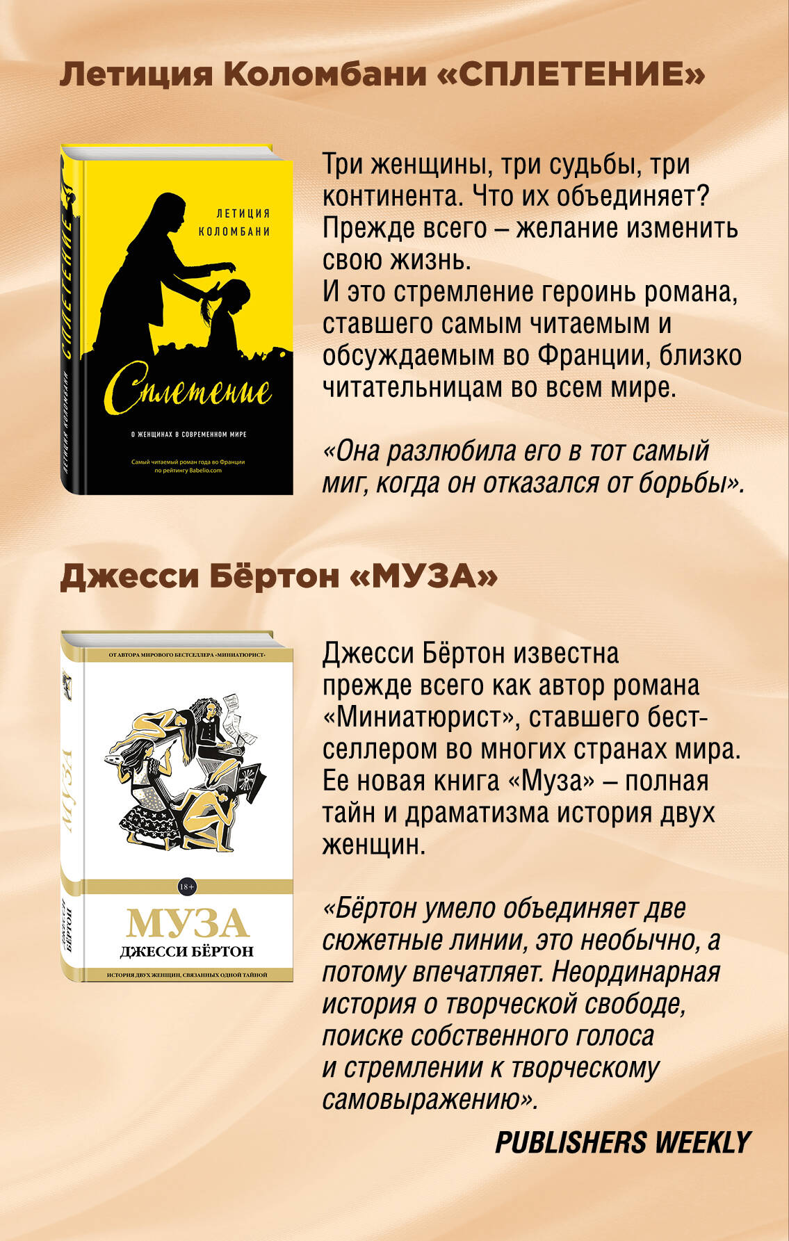 Летиция Коломбани "Сплетение" Джесси Бёртон "Муза" Два вдохновляющих романа о женской борьбе, силе и удивительном сплетении судеб. Летиция Коломбани "Сплетение" Джесси Бёртон "Муза" Летиция Коломбани "Сплетение" Три женщины, три судьбы, три континента. Что их объединяет? Прежде всего - желание изменить свою жизнь. И это стремление героинь романа, ставшего самым читаемым и обсуждаемым во Франции, близко читательницам во всем мире. "Она разлюбила его в тот самый миг, когда он отказался от борьбы". Джесси Бёртон "Муза" Джесси Бёртон известна прежде всего как автор романа "Миниатюрист", ставшего бестселлером во многих странах мира. Ее новая книга, "Муза", - полная тайн и драматизма история двух женщин. Бертон умело объединяет две сюжетные линии, это необычно, а потому впечатляет. Неординарная история о творческой свободе, поиске собственного голоса и стремлении к творческому самовыражению. Publishers Weekly| Издательство | ООО "Издательство "Эксмо" |