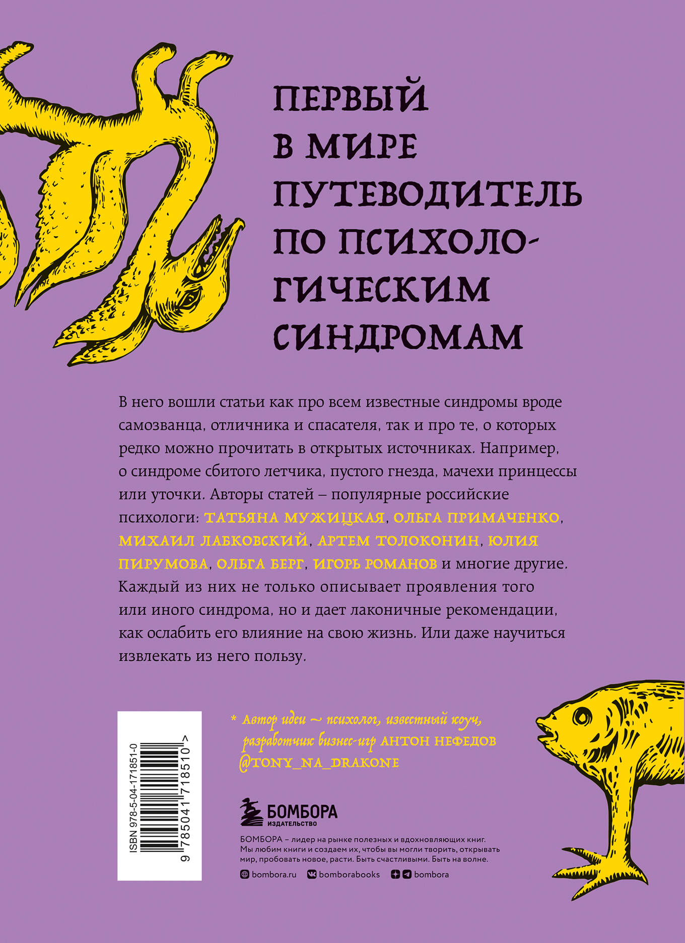 Комплект из книги и блокнота "Зоопарк в твоей голове" "Зоопарк в твоей голове. 25 психологических синдромов, которые мешают нам жить" Первый в мире путеводитель по психологическим синдромам. В него вошли статьи как про всем известные синдромы, вроде самозванца, отличника и спасателя, так и про те, о которых редко можно прочитать в открытых источниках. Например, о синдроме сбитого летчика, пустого гнезда, мачехи принцессы или уточки. Авторы статей - популярные российские психологи: Татьяна Мужицкая, Ольга Примаченко, Михаил Лабковский, Артем Толоконин, Юлия Пирумова, Ольга Берг, Игорь Романов и многие другие. Каждый из них не только описывает проявления того или иного синдрома, но и дает лаконичные рекомендации, как ослабить его влияние на свою жизнь. Или даже научиться извлекать пользу. Автор идеи - психолог, известный коуч, разработчик бизнес-игр Антон Нефедов @tony_na_drakone "Зоопарк в моей голове. Блокнот для записи самых дурацких мыслей" Блокнот по мотивам бестселлера "Зоопарк в твоей голове". Внутри - страницы в линейку для гениальных (и не очень) идей, странных инсайтов, неожиданных озарений и любых слов, которым пора выбраться наружу. А на полях вас подстерегают фантастические существа, такие же причудливые, как ваши мысли.| Издательство | ООО "Издательство "Эксмо" |