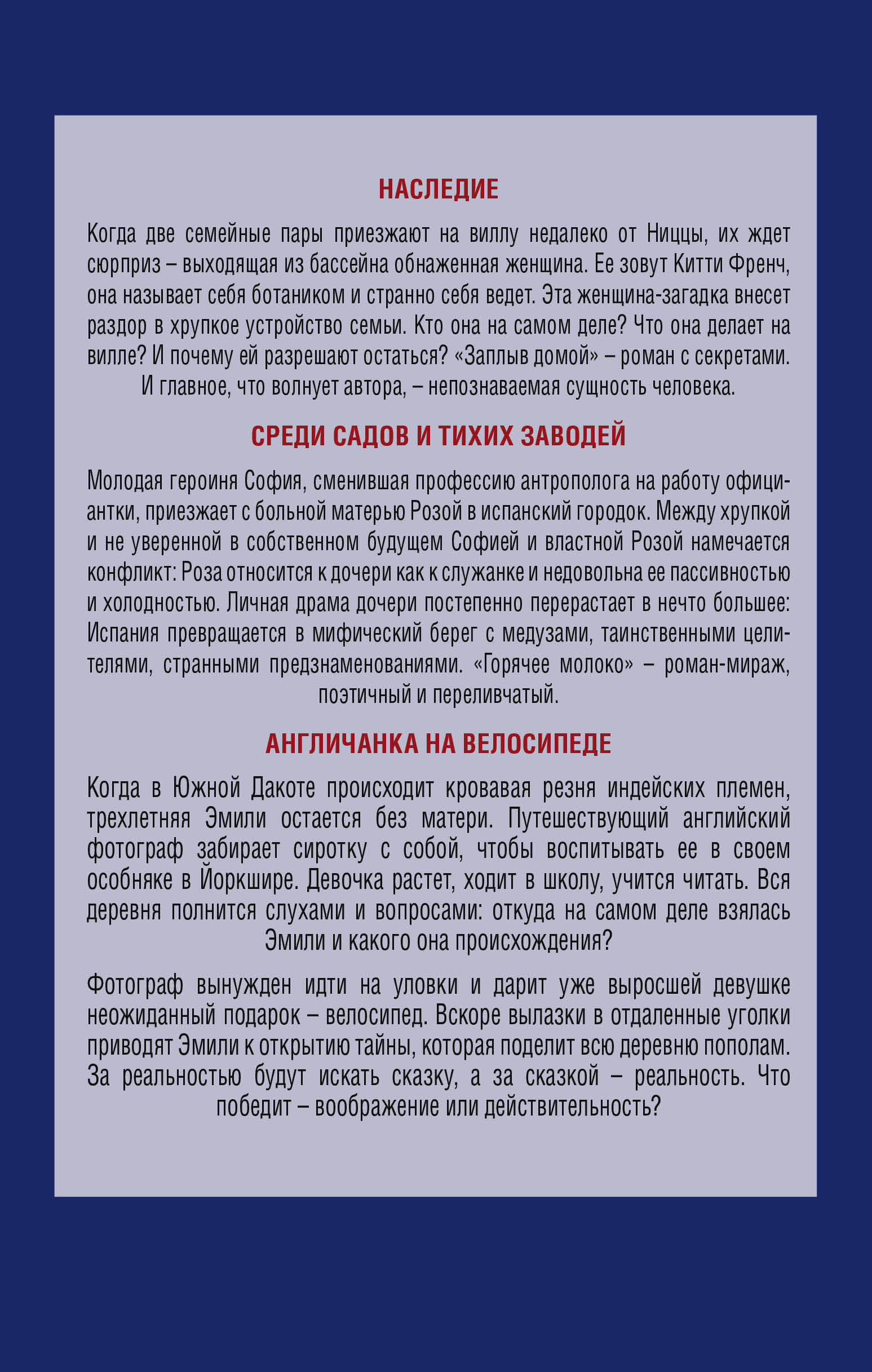 Аннотация: Комплект из трех книг: Англичанка на велосипеде + Среди садов и тихих заводей + Наследие