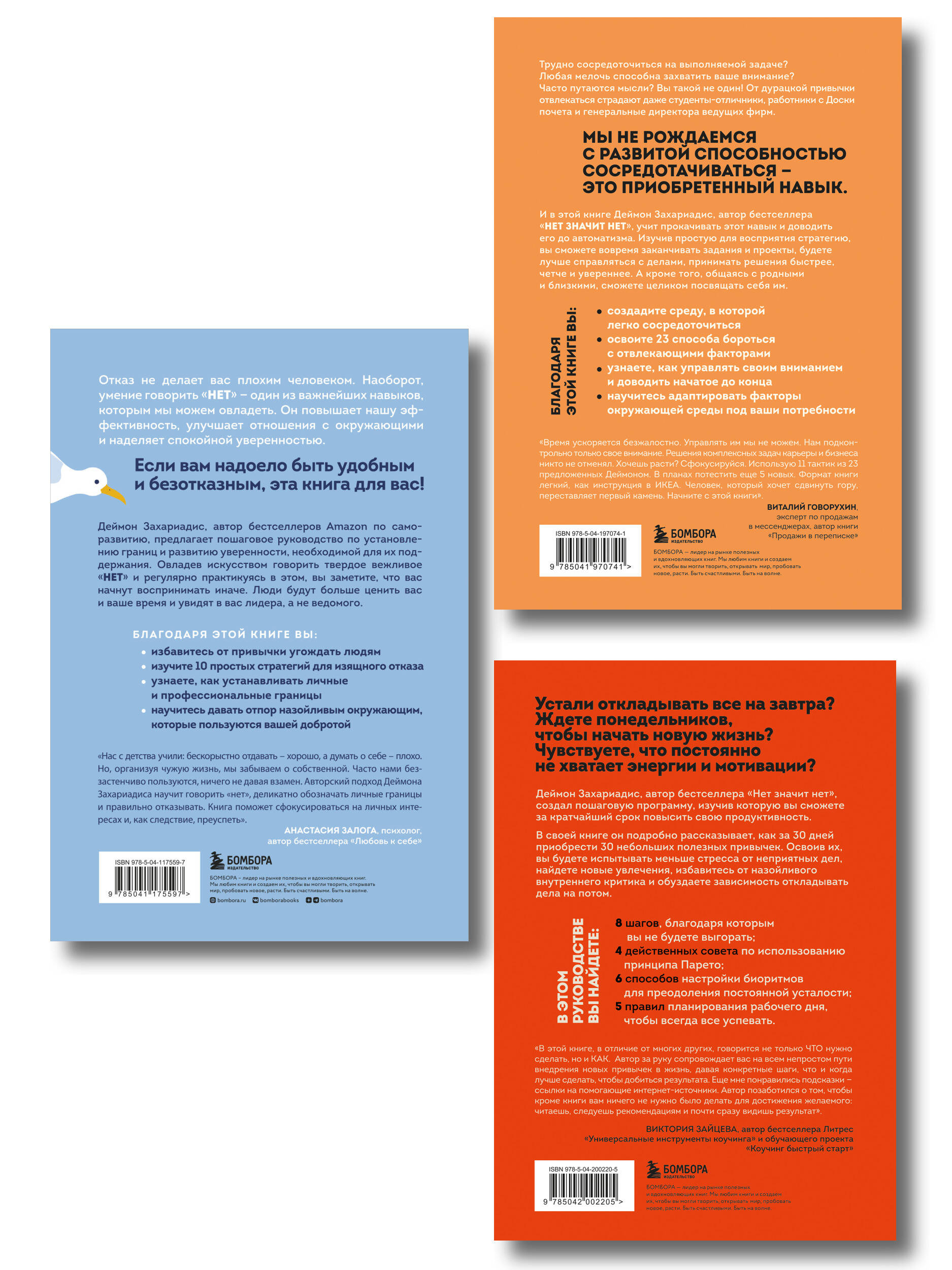 Деймон Захариадес - человек, совершивший добровольный побег из корпоративной действительности. Он годами терпел бесполезные совещания, светские беседы с коллегами и прочие отвлекающие факторы, - пока не вырвался на свободу. Сегодня он не только автор растущей библиографии по тайм-менеджменту и повышению продуктивности, но и ведущий блога по продуктивности. В свободное время он демонстрирует свои копирайтерские способности, создавая контент-маркетинговые кампании, которые используются современными молодыми предприятиями для привлечения клиентов. В комплект входит три книги: 1) «НЕТ ЗНАЧИТ НЕТ. Как перестать быть удобным и научиться говорить "нет" без угрызений совести» Отказ не делает вас плохим человеком. Наоборот, умение говорить «нет» - один из важнейших навыков, которым мы можем овладеть. Он повышает нашу эффективность, улучшает отношения с окружающими и наделяет спокойной уверенностью. И если вам надоело быть удобным и безотказным, эта книга для вас! Деймон Захариадес, автор бестселлеров Amazon по саморазвитию, предлагает пошаговое руководство по установлению границ и развитию уверенности, необходимой для их поддержания. Овладев искусством говорить твердое вежливое «нет» и регулярно практикуясь в этом, вы заметите, что вас начнут воспринимать иначе. Люди будут больше ценить вас и ваше время и увидят в вас лидера, а не ведомого. 2) «Фокус на важном. Как оставаться сосредоточенным, когда хочется заняться ерундой» Трудно сосредоточиться на выполняемой задаче? Любая мелочь способна захватить ваше внимание? Часто путаются мысли? Вы такой не один! От дурацкой привычки отвлекаться страдают даже студенты-отличники, работники с доски почета и генеральные директора ведущих фирм. Мы не рождаемся с развитой способностью сосредотачиваться - это приобретенный навык. И в этой книге Деймон Захариадис, автор бестселлера «НЕТ ЗНАЧИТ НЕТ» учит прокачивать этот навык доводить его до автоматизма. Изучив простую для восприятия стратегию, вы сможете вовремя заканчивать задания и проекты, будете лучше справляться с делами, принимать решения быстрее, четче и увереннее. А кроме того, общаясь с родными и близкими, сможете целиком посвящать себя им. 3) «30 привычек за 30 дней. План-капкан по наведению полного порядка в жизни» Устали откладывать все на завтра? Ждете понедельников, чтобы начать новую жизнь? Чувствуете, что постоянно не хватает энергии и мотивации? Деймон Захариадис, автор бестселлера «Нет значит нет», создал пошаговую программу, изучив которую вы сможете за кратчайший срок повысить свою продуктивность. В своей книге он подробно рассказывает, как за 30 дней приобрести 30 небольших полезных привычек. Освоив их, вы будете испытывать меньше стресса от неприятных дел, найдете новые увлечения, избавитесь от назойливого внутреннего критика и обуздаете зависимость откладывать дела на потом.| Издательство | ООО "Издательство "Эксмо" |