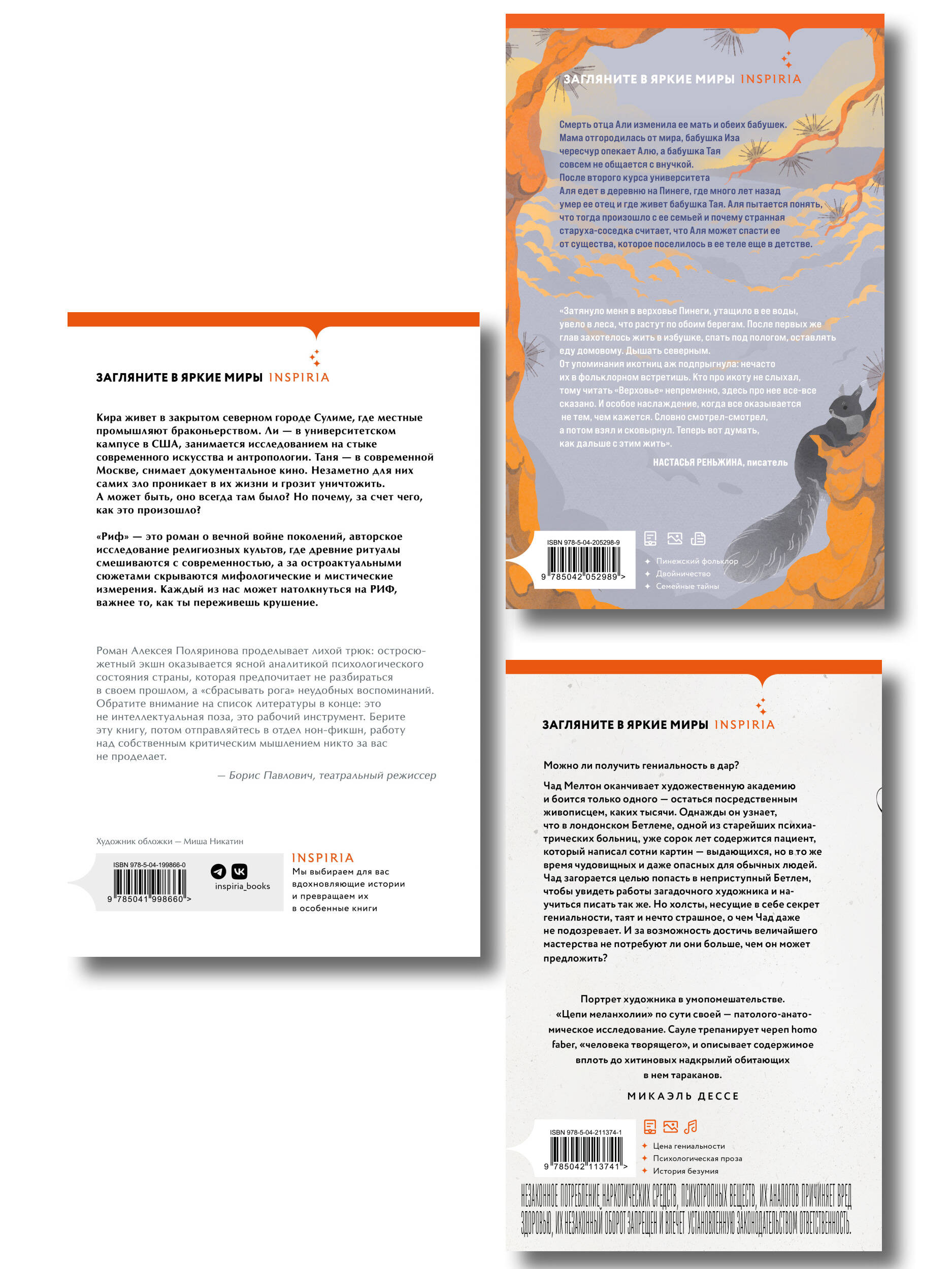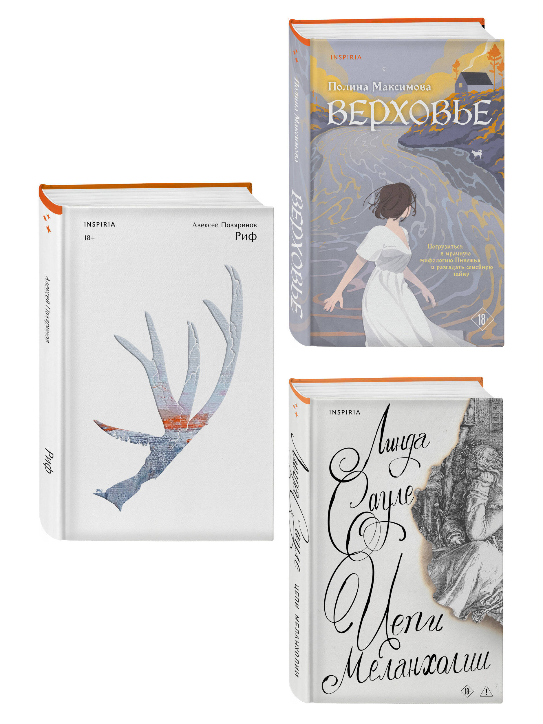 "Риф": Кира живет в закрытом северном городе Сулиме, где местные промышляют браконьерством. Ли - в университетском кампусе в США, занимается исследованием на стыке современного искусства и антропологии. Таня - в современной Москве, снимает документальное кино. Незаметно для них самих зло проникает в их жизни и грозит уничтожить. А может быть, оно всегда там было? Но почему, за счёт чего, как это произошло? "Риф" - это роман о вечной войне поколений, авторское исследование религиозных культов, где древние ритуалы смешиваются с современностью, а за остроактуальными сюжетами скрываются мифологические и мистические измерения. Каждый из нас может натолкнуться на РИФ, важнее то, как ты переживешь крушение". "Верховье": Смерть отца Али изменила ее мать и обеих бабушек. Мама отгородилась от мира, бабушка Иза чересчур опекает Алю, а бабушка Тая совсем не общается с внучкой. После второго курса университета Аля едет в деревню на Пинеге, где живет бабушка Тая и где много лет назад умер ее отец. Аля пытается понять, что тогда произошло с ее семьей и почему странная старуха-соседка считает, что Аля может спасти ее от существа, которое поселилось в ее теле еще в детстве. Тина учится в аспирантуре филфака и пишет диссертацию о мифическом существе, которое вселяется в женщин, живущих в деревнях на севере России, где протекает река Пинега. Тина погружается в мрачную историю и мифологию Пинежья, а параллельно переживает болезненные отношения со своим женатым научным руководителем, почти не покидая съемную студию на окраине Петербурга. "Цепи меланхолии": Можно ли получить гениальность в дар? Чад Мелтон заканчивает художественную академию и боится только одного - остаться посредственным живописцем, каких тысячи. Однажды он узнает, что в лондонском Бетлеме, одной из старейших психиатрических больниц, уже сорок лет содержится пациент, который написал сотни картин - выдающихся, но в то же время чудовищных и даже опасных для обычных людей. Чад загорается целью попасть в неприступный Бетлем, чтобы увидеть работы загадочного художника и научиться писать так же. Но холсты, несущие в себе секрет гениальности, таят и нечто страшное, о чем Чад даже не подозревает. И за возможность достичь величайшего мастерства не потребуют ли они больше, чем он может предложить?| Издательство | ООО "Издательство "Эксмо" |