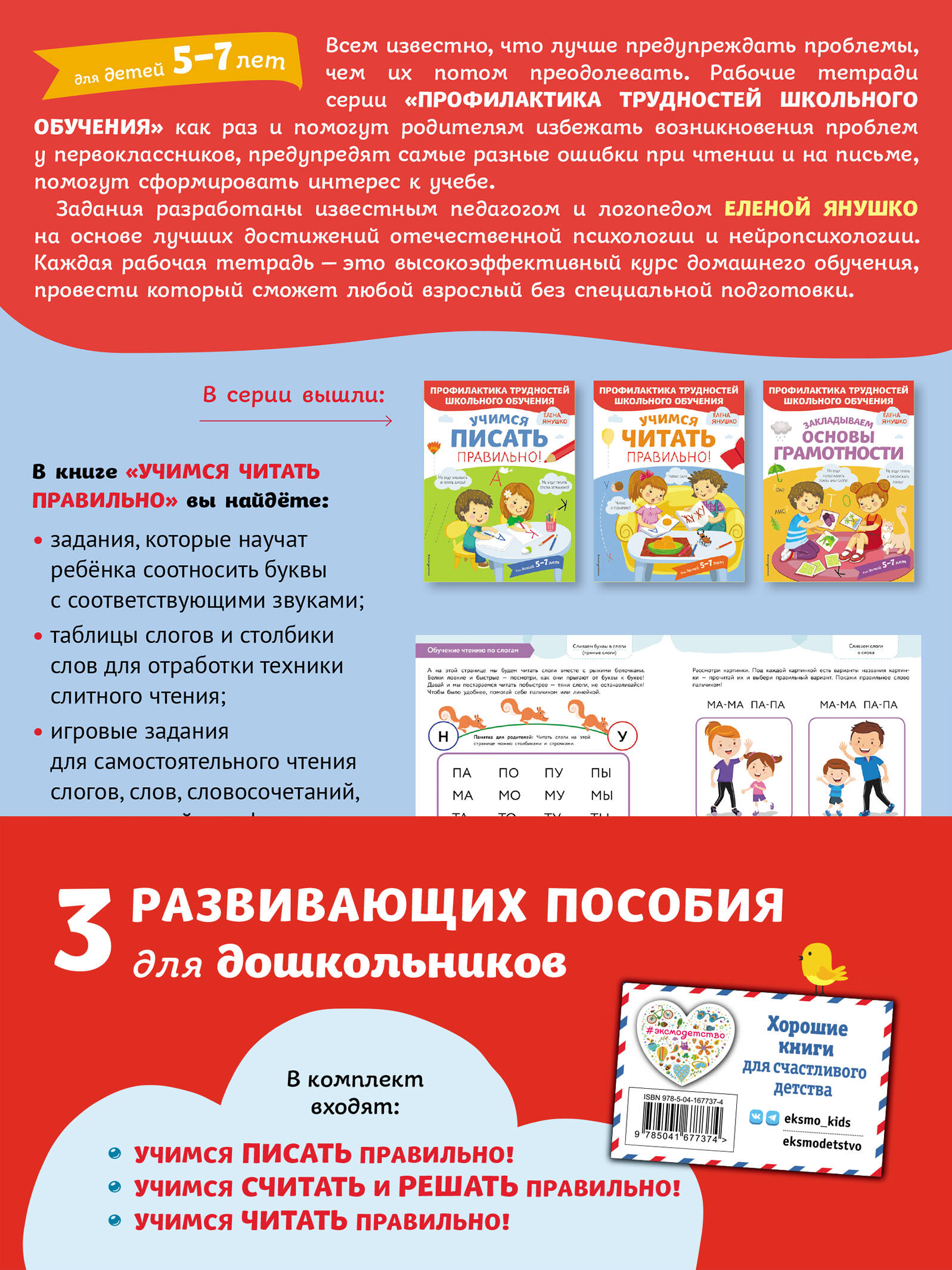 С началом учёбы в школе многие дети сталкиваются с трудностями, даже если они уже умеют читать и писать. Рабочие тетради комплекта «Учимся писать, читать и считать правильно» помогут в обучении грамоте и счёту, предупреждении разнообразных ошибок при чтении и на письме, сформируют интерес к учёбе. Эти книги дают возможность родителям провести дополнительные занятия с ребёнком без специальной подготовки и без привлечения других пособий.