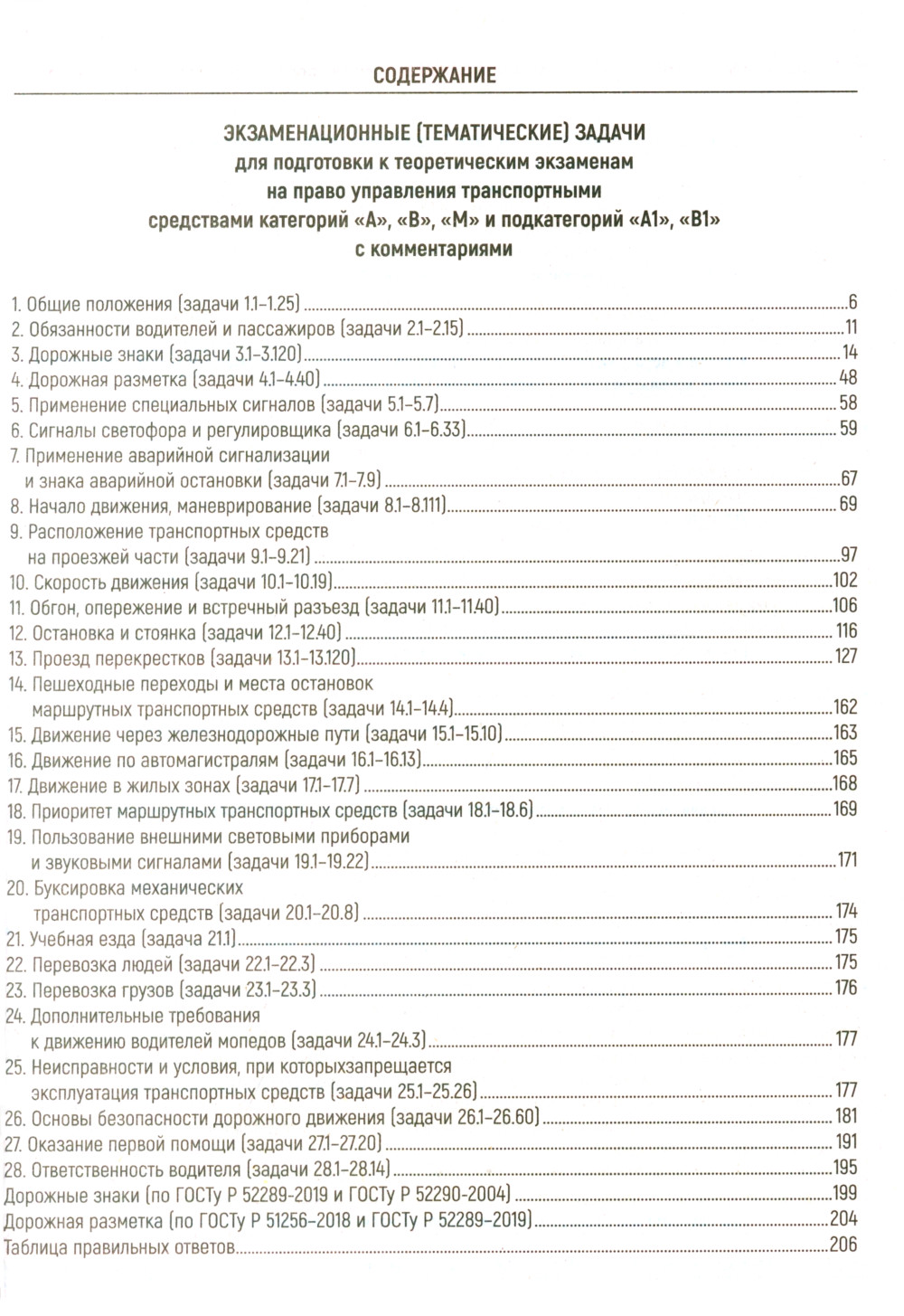 В данном издании вопросы приведены с учетом изменений в утвержденных экзаменационных билетах. Новая редакция утверждена ГИБДД РФ и применяется во всех экзаменационных подразделениях ГИБДД с 1 сентября 2023 г. при приеме теоретического экзамена на право управления транспортными средствами категорий «А», «В», «М» и подкатегорий «А1», «В1». Издание представляет собой сборник экзаменационных задач, разбитых по темам и предназначенных для кандидатов в водители, занимающихся в автошколе или самостоятельно. Для удобства изучения материала в тексте приведены авторские комментарии, а также правильные ответы на вопросы. В конце книги дана таблица правильных ответов. Назначение издания - помочь закрепить знания, полученные в результате изучения Правил дорожного движения и других дисциплин, предусмотренных учебными программами. В комментариях к тематическим задачам приняты следующие сокращения: ПДД - Правила дорожного движения РФ; Приложение 1 - Приложение 1 к Правилам дорожного движения РФ - Дорожные знаки; Приложение 2 - Приложение 2 к Правилам дорожного движения РФ - Дорожная разметка; Закон о БДД -Федеральный закон о безопасности дорожного движения; Основные положения - Основные положения по допуску транспортных средств к эксплуатации и обязанности должностных лиц по обеспечению безопасности дорожного движения; Перечень - Перечень неисправностей и условий, при которых запрещается эксплуатация транспортных средств; КоАП - Кодекс РФ об административных правонарушениях; ТС - транспортное средство; СИМ - средство индивидуальной мобильности.