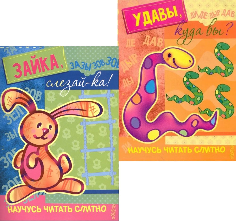 В комплект вошли две книги из серии «Научусь читать слитно» - «Зайка, слезай-ка!» и «Удавы, куда вы?» «Научусь читать слитно» - это книги для детей 5-7 лет, которая помогает научиться читать слова без пауз и запинок. В книге представлены задания с разными согласными, чтобы ребёнок мог потренироваться складывать слоги со всеми гласными буквами. Также в книге есть короткие юмористические и познавательные фразы.