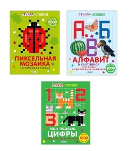 Комплект книг "Стикер-мозаика": Алфавит в картинках, Мои первые цифры, Пиксельная мозаика (количество томов: 3)