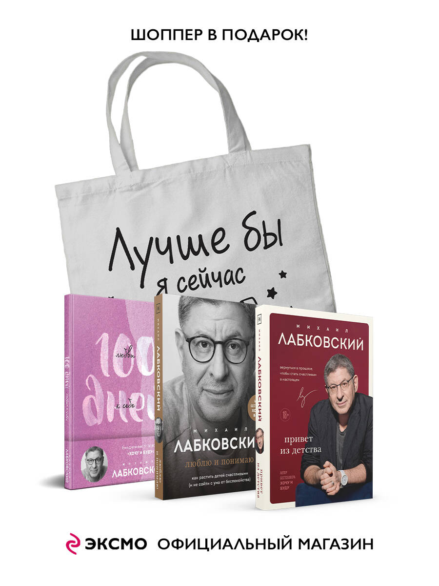 ПОДАРОЧНЫЙ КОМПЛЕКТ: Лабковский + Шоппер В ПОДАРОК В комплект входят: 1) Люблю и понимаю. Как растить детей счастливыми (и не сойти с ума от беспокойства) Эта книга поможет не повторять ошибок своих родителей - с собственными детьми. Как реагировать на трехлетнего бунтаря? Что делать, если малыш не хочет ходить в сад? Как выбрать школу? Что гораздо важнее оценок? Не выпускает телефон из рук - это нормально? Можно ли наказывать детей? Как помочь подростку, если он переживает, но ничего не рассказывает? Михаил разбирает эти и многие другие вопросы, объясняет, почему ребенок так себя ведет, и учит воспитывать с любовью, без которой вырасти здоровым и счастливым человеком просто невозможно. 2) Привет из детства. Вернуться в прошлое, чтобы стать счастливым в настоящем Одна из самых актуальных тем в психологии - детские травмы и их влияние на взрослую жизнь. Михаил Лабковский поможет вернуться в прошлое, к моментам, которые повлияли на вашу жизнь, чтобы понять родителей, отпустить обиды и разорвать несчастливый сценарий, который вы неосознанно проигрываете многие годы. 3) Ежедневник100 дней любви к себе с Михаилом Лабковским. Ежедневник (подарочное издание) Это ежедневник в премиальном исполнении от автора бестселлера "Хочу и буду" Михаила Лабковского. В ежедневнике вас ждут: тексты-напутствия на каждый день - о любви к себе и самооценке; вопросы и задания, которые помогут побороть неуверенность в себе; комиксы с "нездоровым" и "здоровым" подходом к жизни; привычки уверенного в себе человека, тесты "Любите ли вы себя?" и "Нарцисс ли вы", а также тесты на невроз и самооценку; трекер для трудоголиков, чтобы разделять работу и личное время; трекер для "самозванцев", который поможет сосредоточиться на достижениях и перестать сомневаться в себе. Плотная белая бумага внутри, дизайнерский переплетный материал на обложке, тиснение черной фольгой. 4) В ПОДАРОК шоппер "Лучше бы я сейчас читал, а не вот это вот всё..."